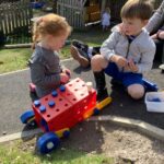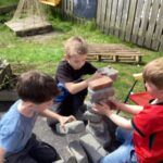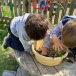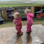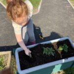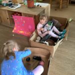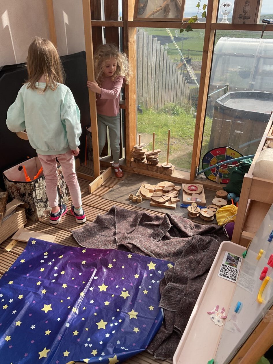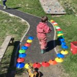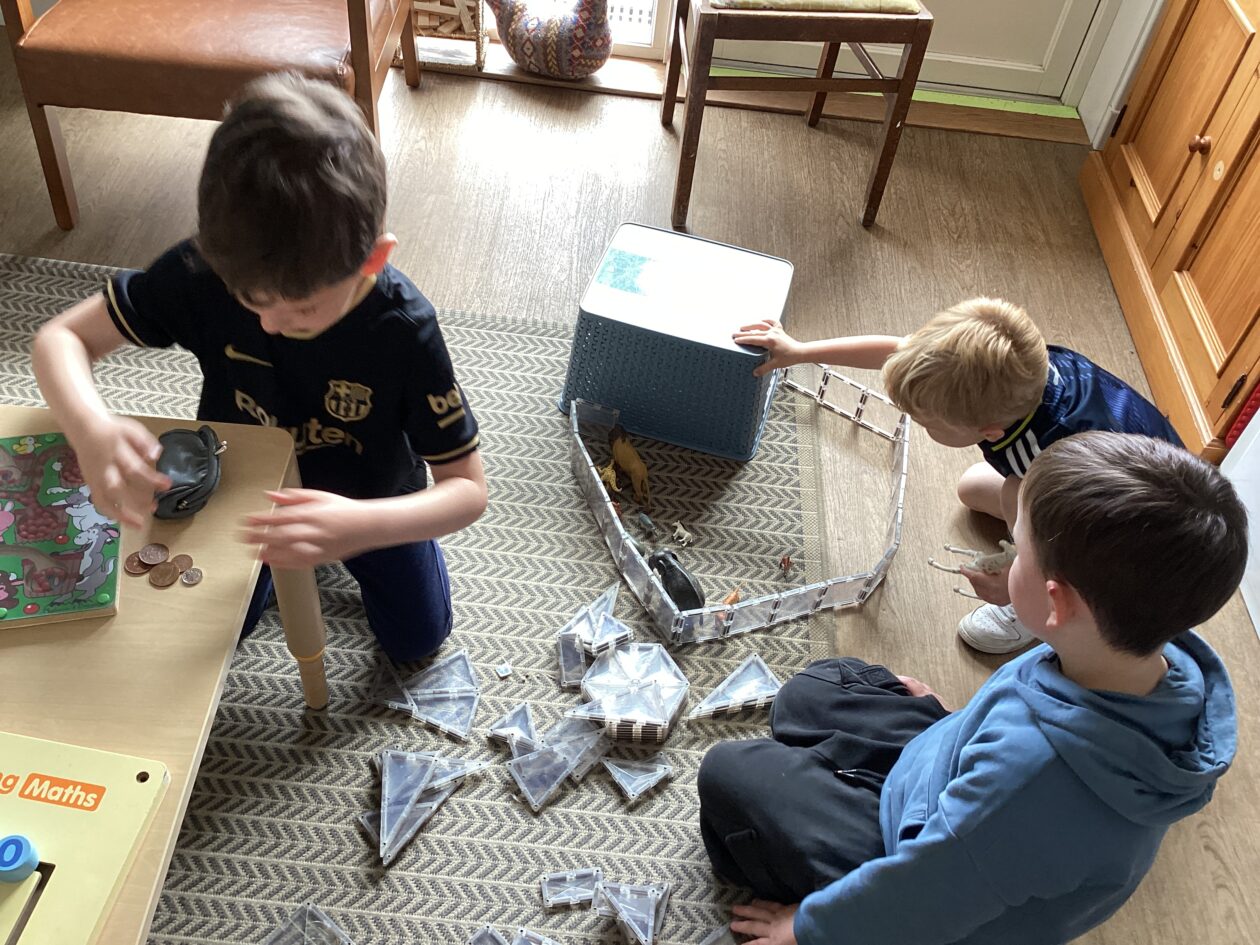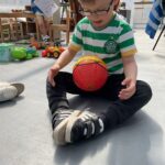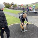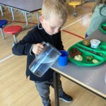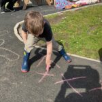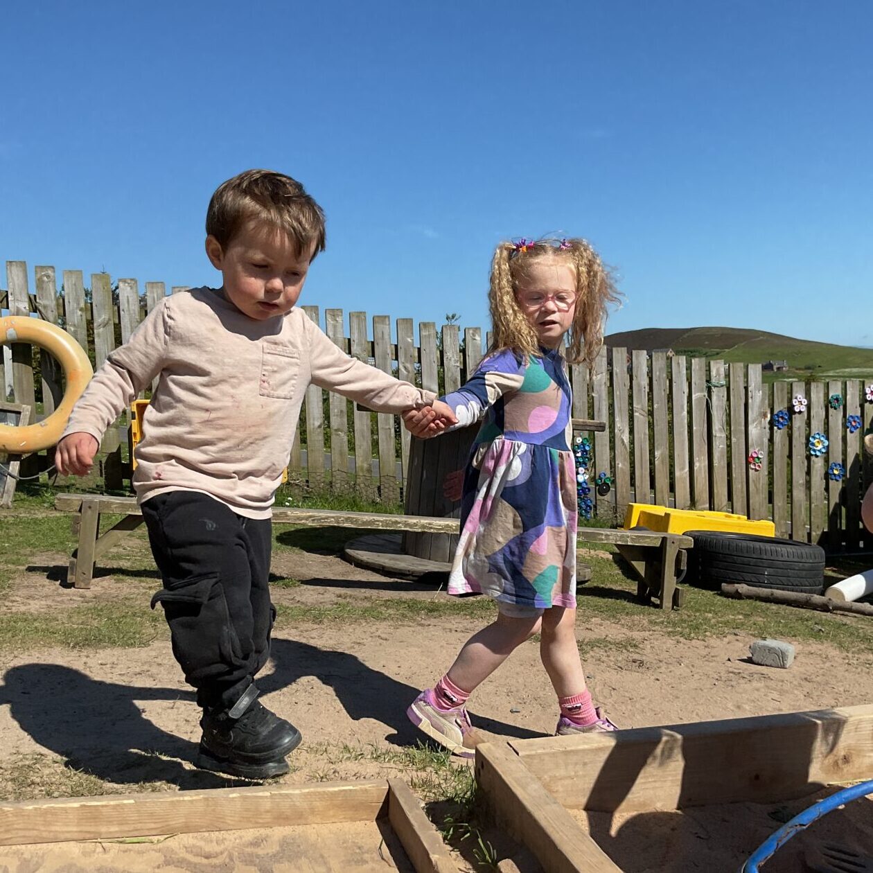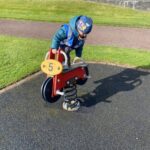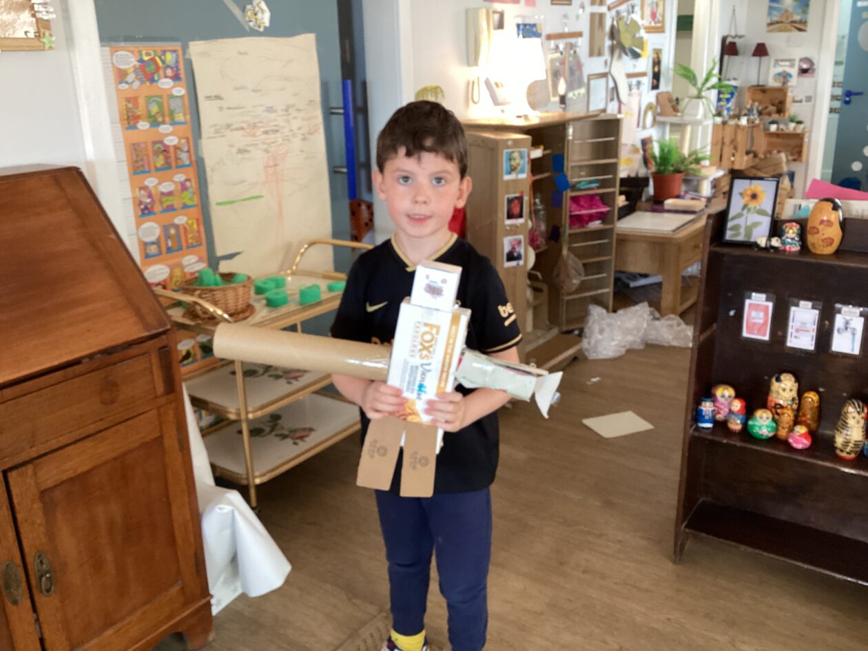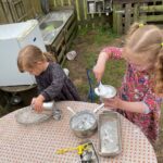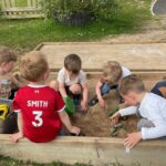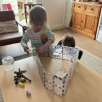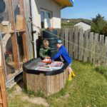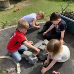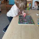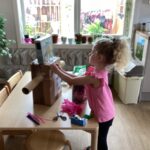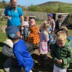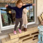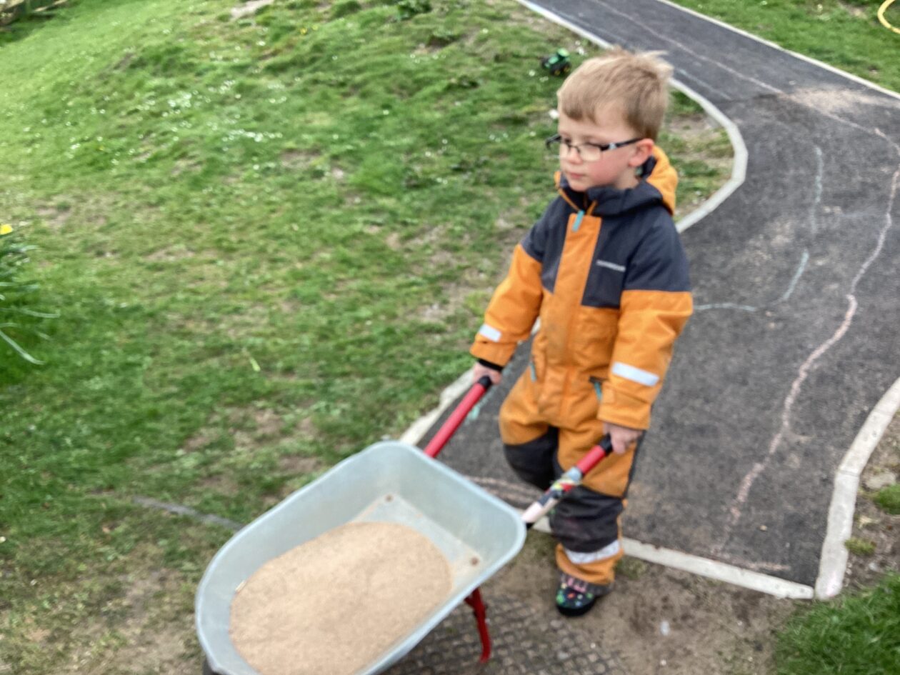 The bairns have been experimenting with different ways to slide down the steep hill in the garden. They have used cardboard, cushions, carpet tiles and slithery breeks! We have also seen lots of engagement with water play and managed to get the solar fountain working as the sun made a bit of a reappearance. We headed to the playpark one afternoon too and the bairns played chasing games, spun on the swings, tried to walk up the slide and got wobbly as jelly on a plate.