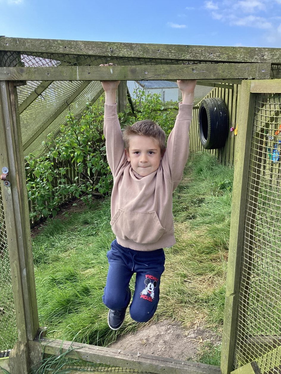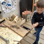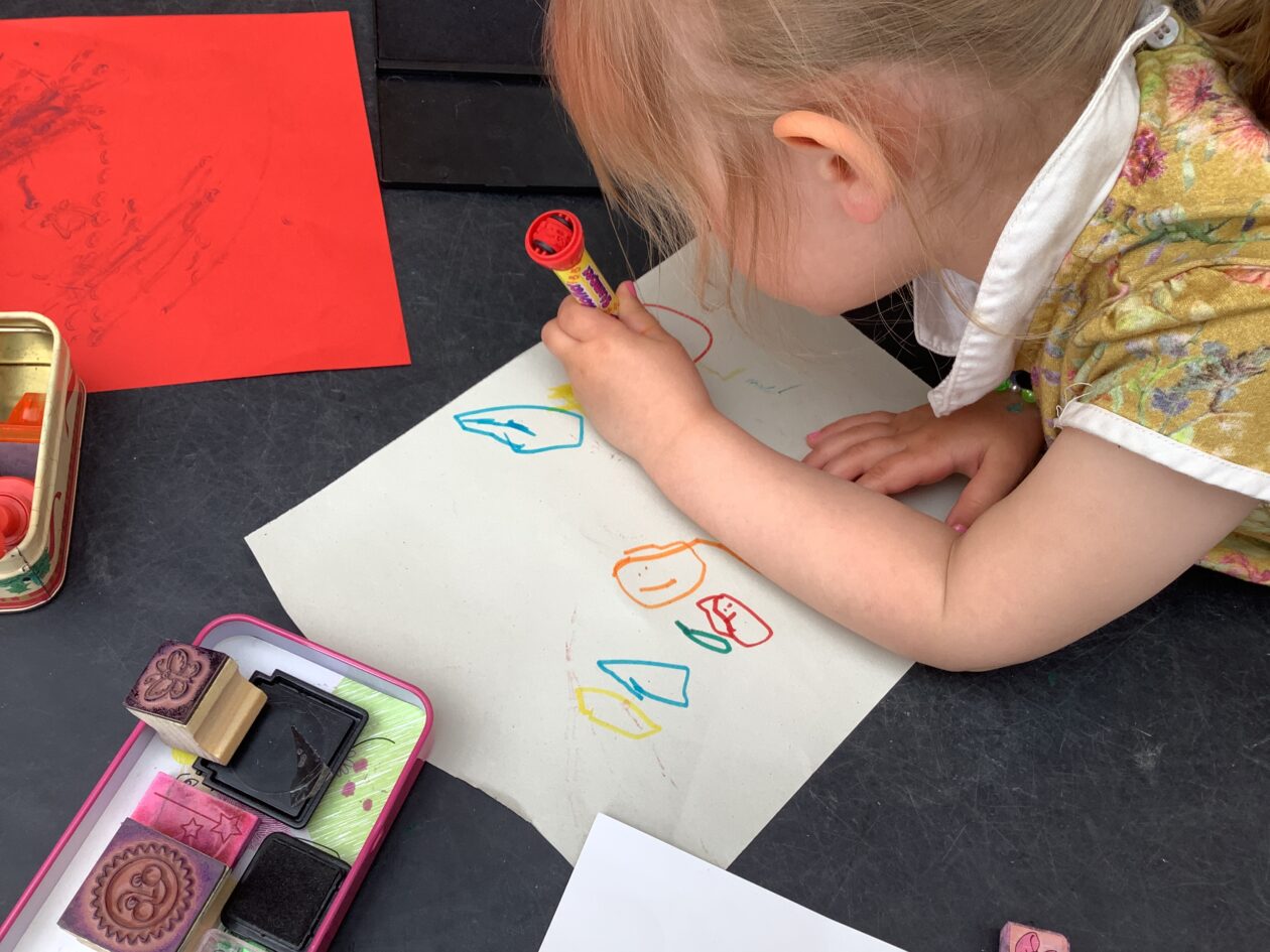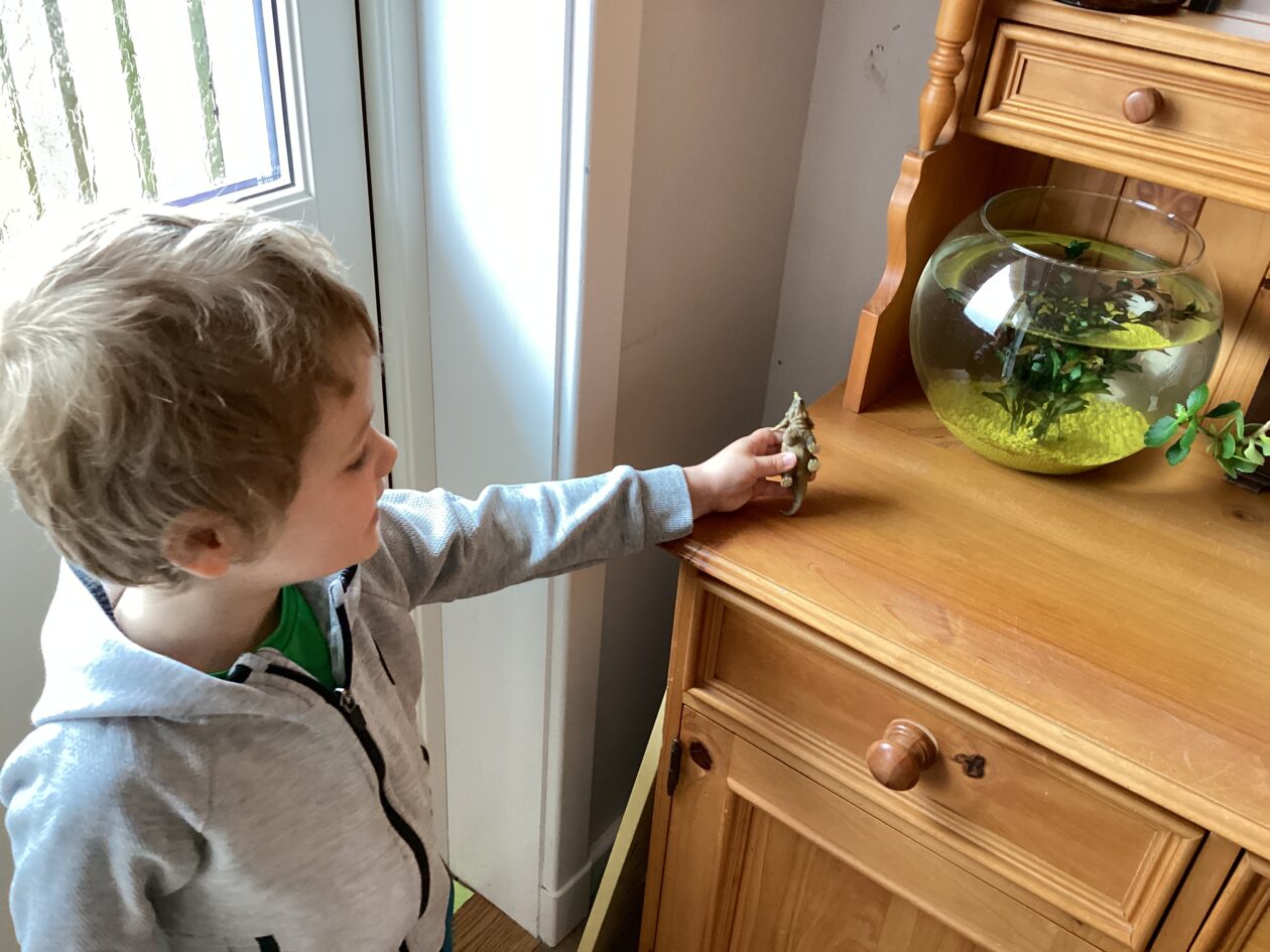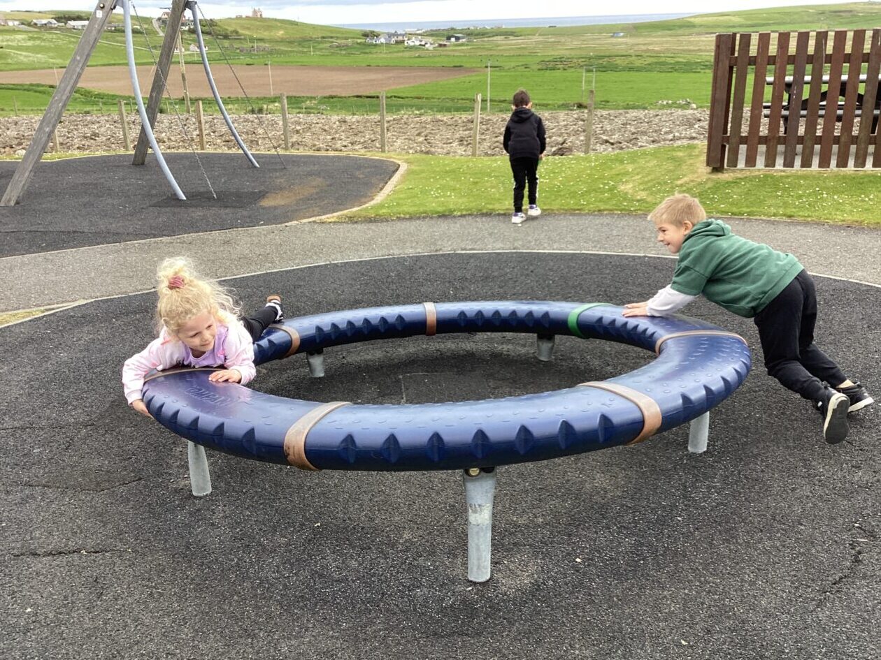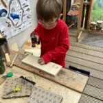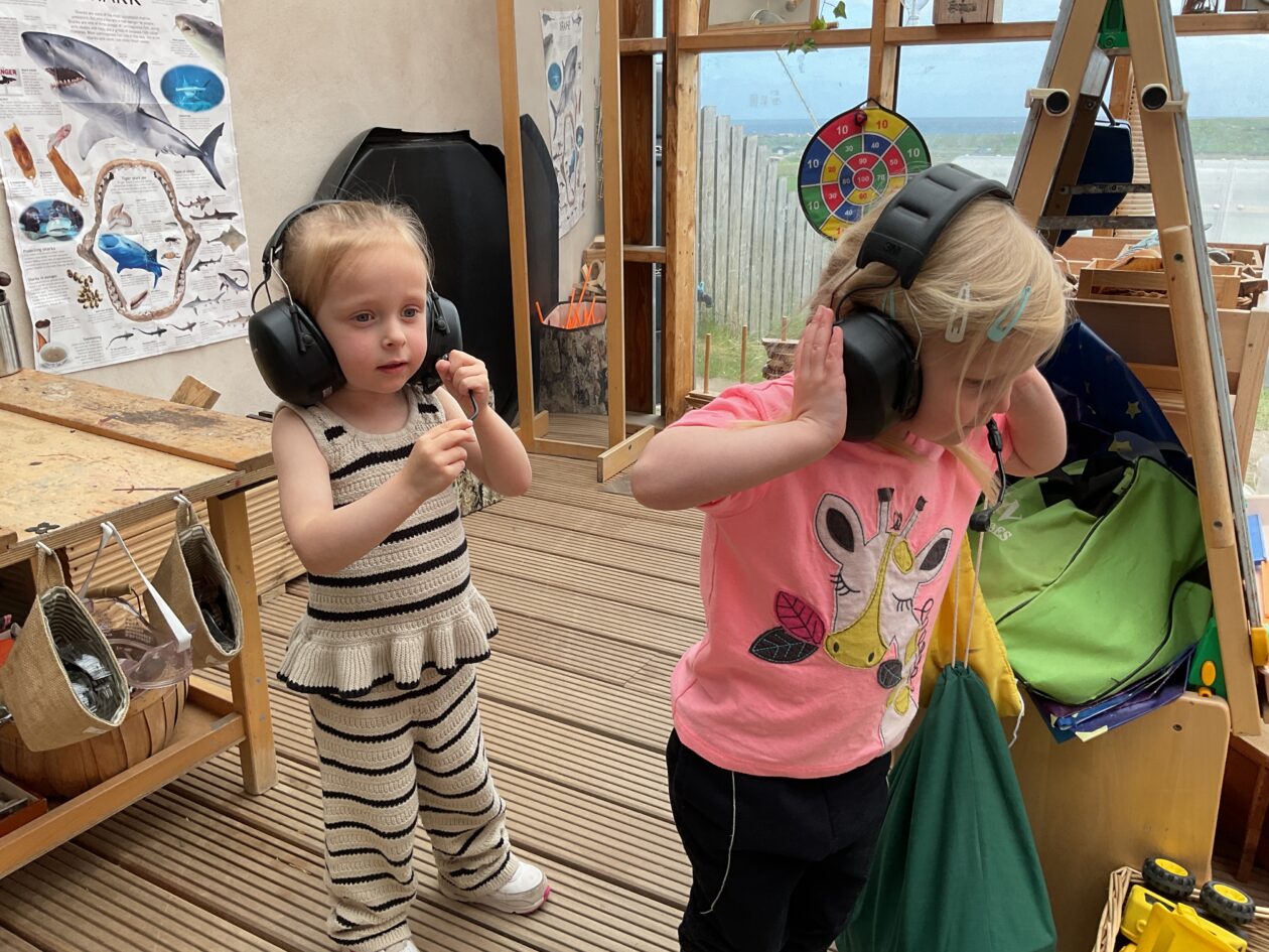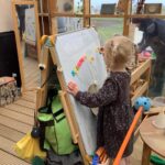 The bairns have been experimenting with different ways to slide down the steep hill in the garden. They have used cardboard, cushions, carpet tiles and slithery breeks! We have also seen lots of engagement with water play and managed to get the solar fountain working as the sun made a bit of a reappearance. We headed to the playpark one afternoon too and the bairns played chasing games, spun on the swings, tried to walk up the slide and got wobbly as jelly on a plate.