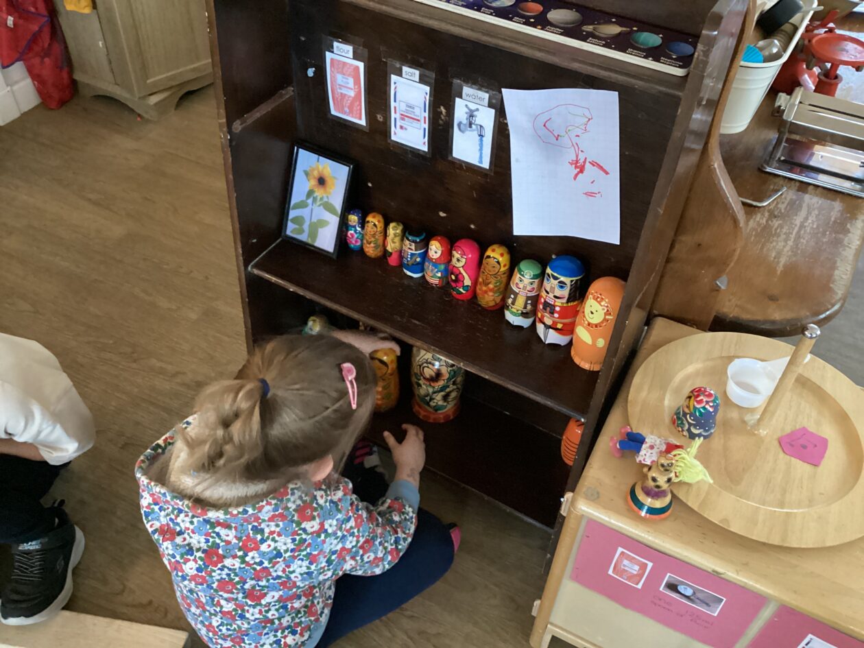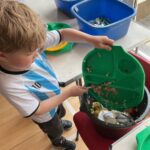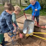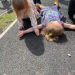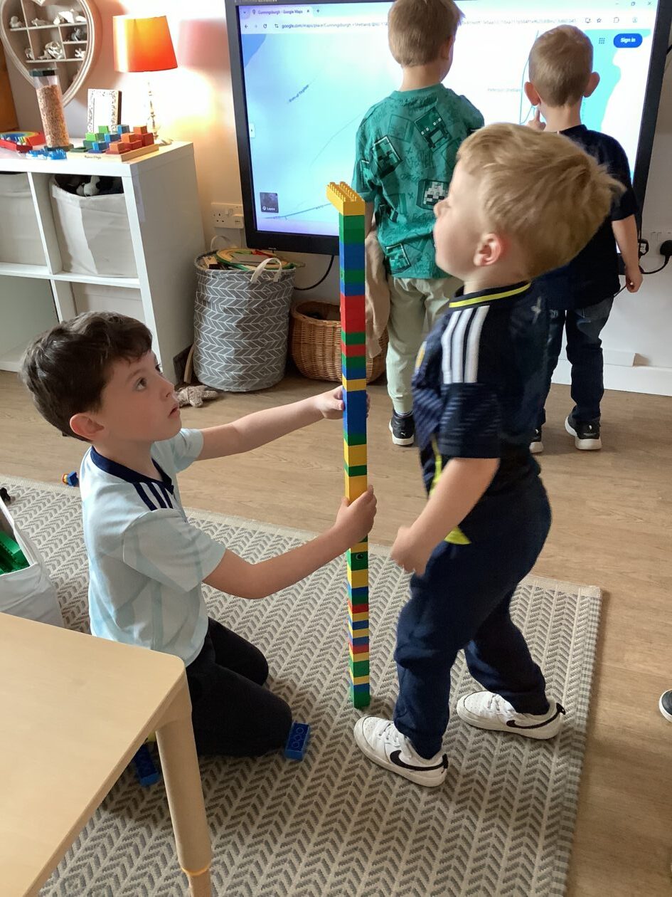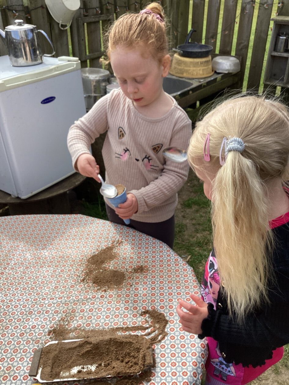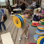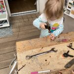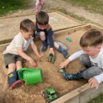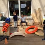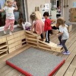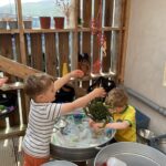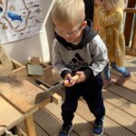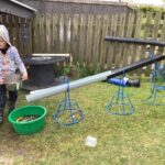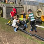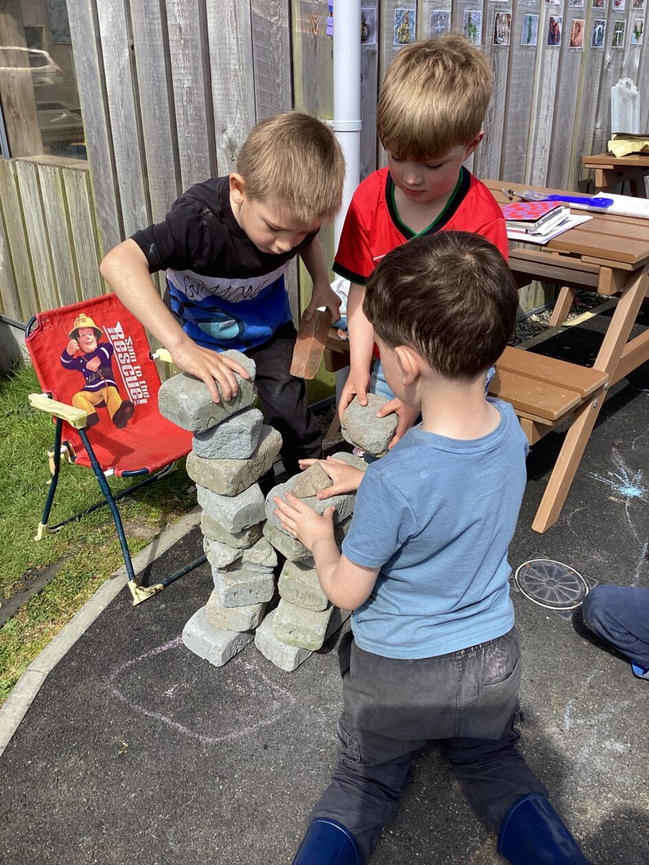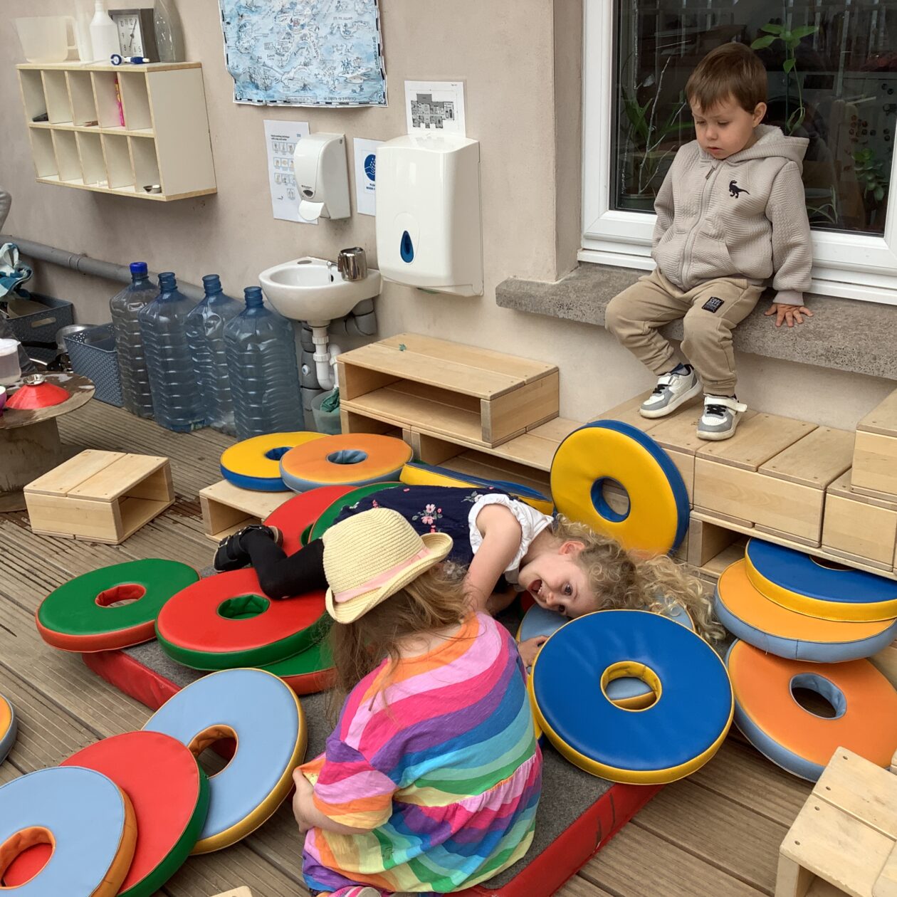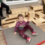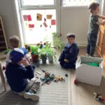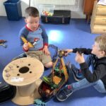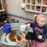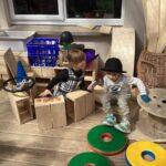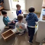 The bairns have been experimenting with different ways to slide down the steep hill in the garden. They have used cardboard, cushions, carpet tiles and slithery breeks! We have also seen lots of engagement with water play and managed to get the solar fountain working as the sun made a bit of a reappearance. We headed to the playpark one afternoon too and the bairns played chasing games, spun on the swings, tried to walk up the slide and got wobbly as jelly on a plate.