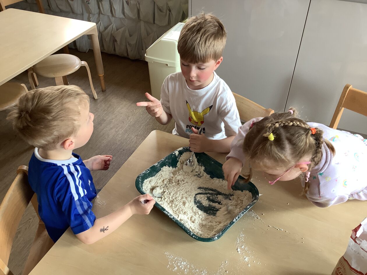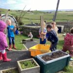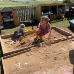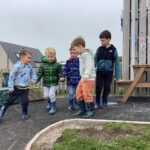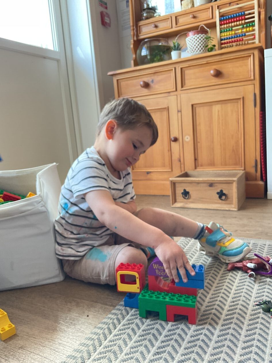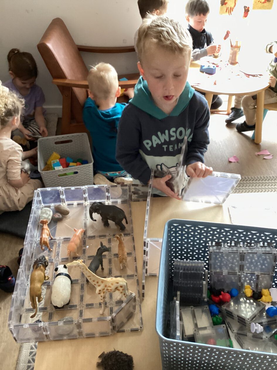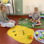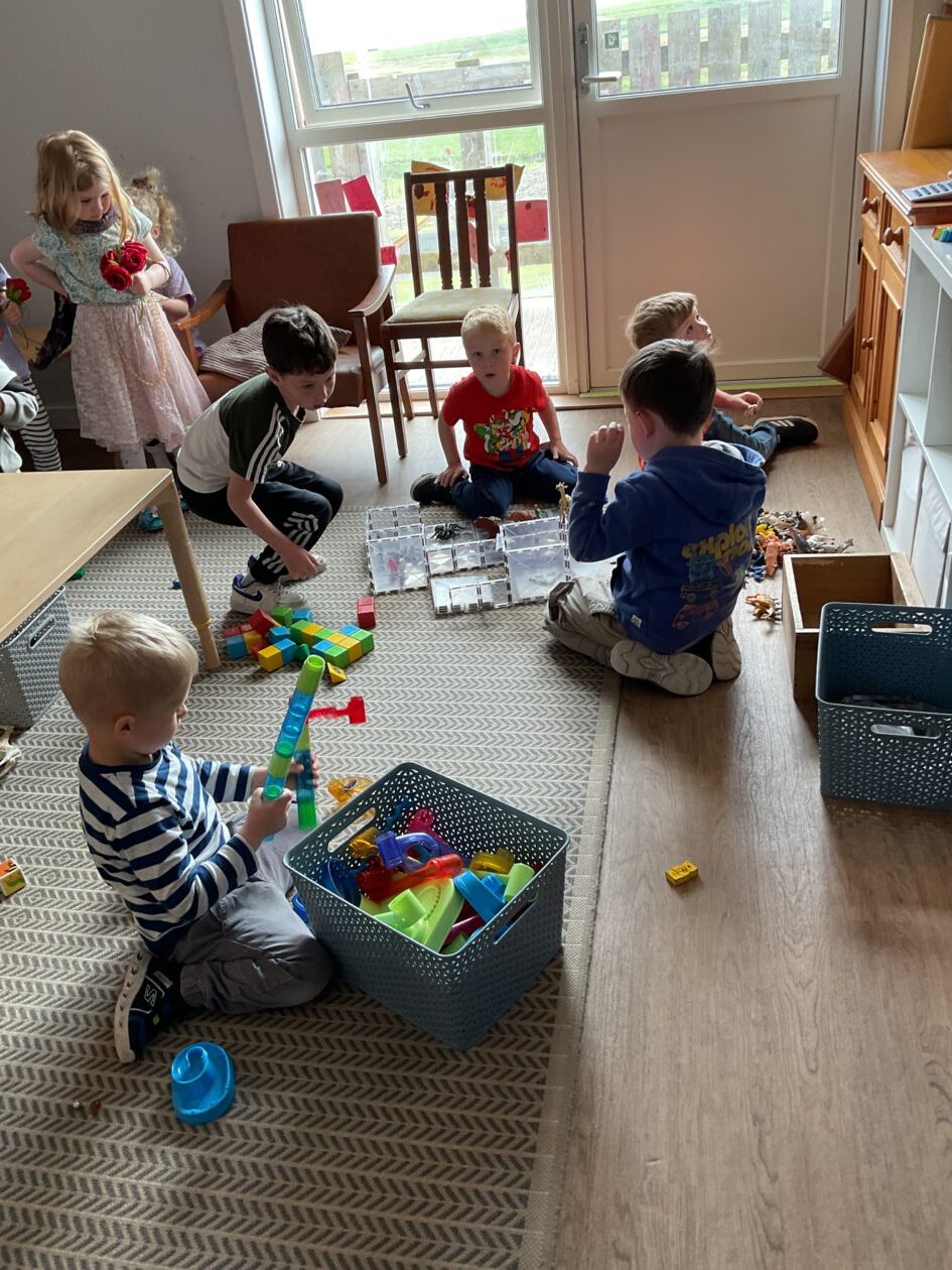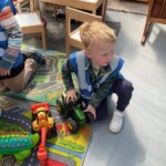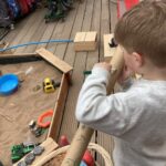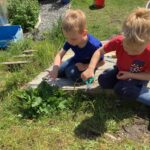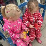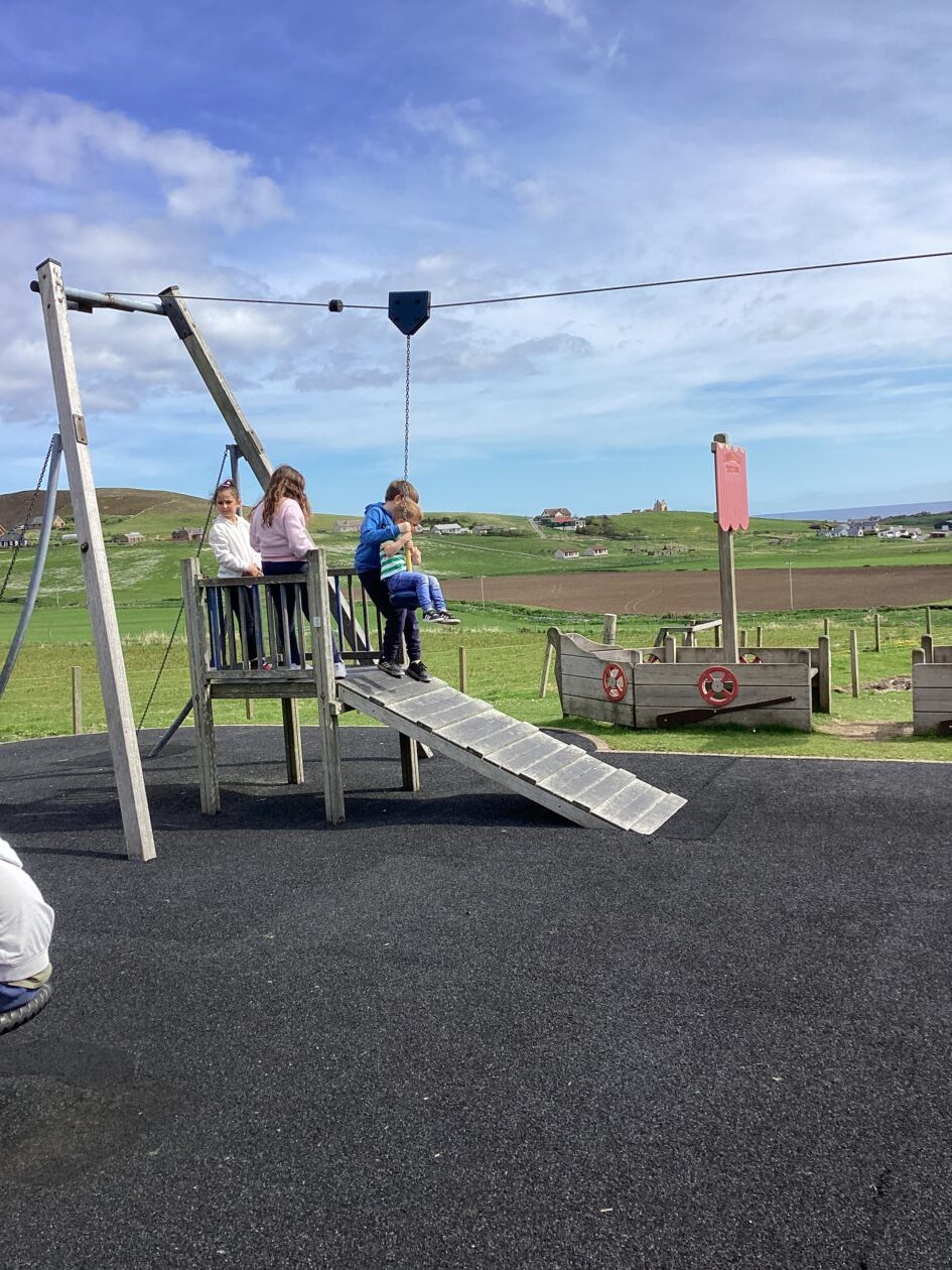 The bairns have been experimenting with different ways to slide down the steep hill in the garden. They have used cardboard, cushions, carpet tiles and slithery breeks! We have also seen lots of engagement with water play and managed to get the solar fountain working as the sun made a bit of a reappearance. We headed to the playpark one afternoon too and the bairns played chasing games, spun on the swings, tried to walk up the slide and got wobbly as jelly on a plate.