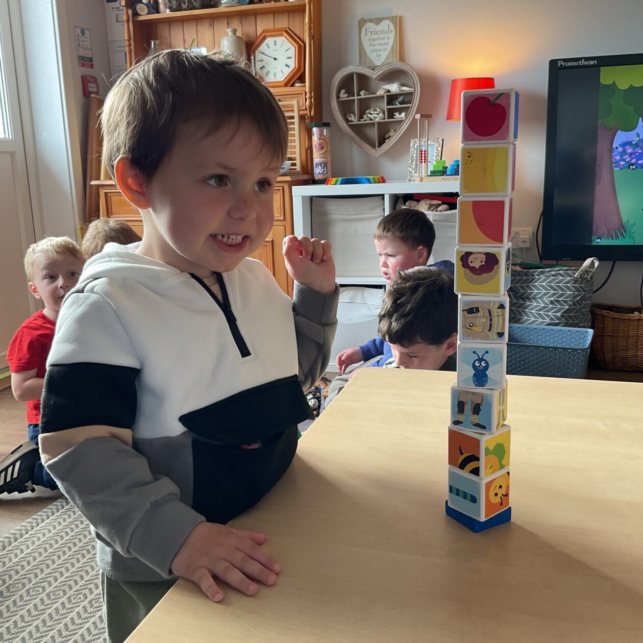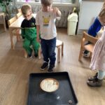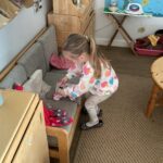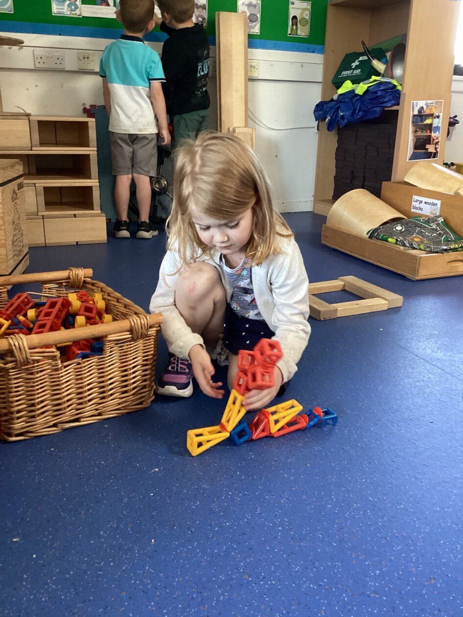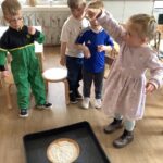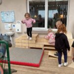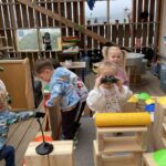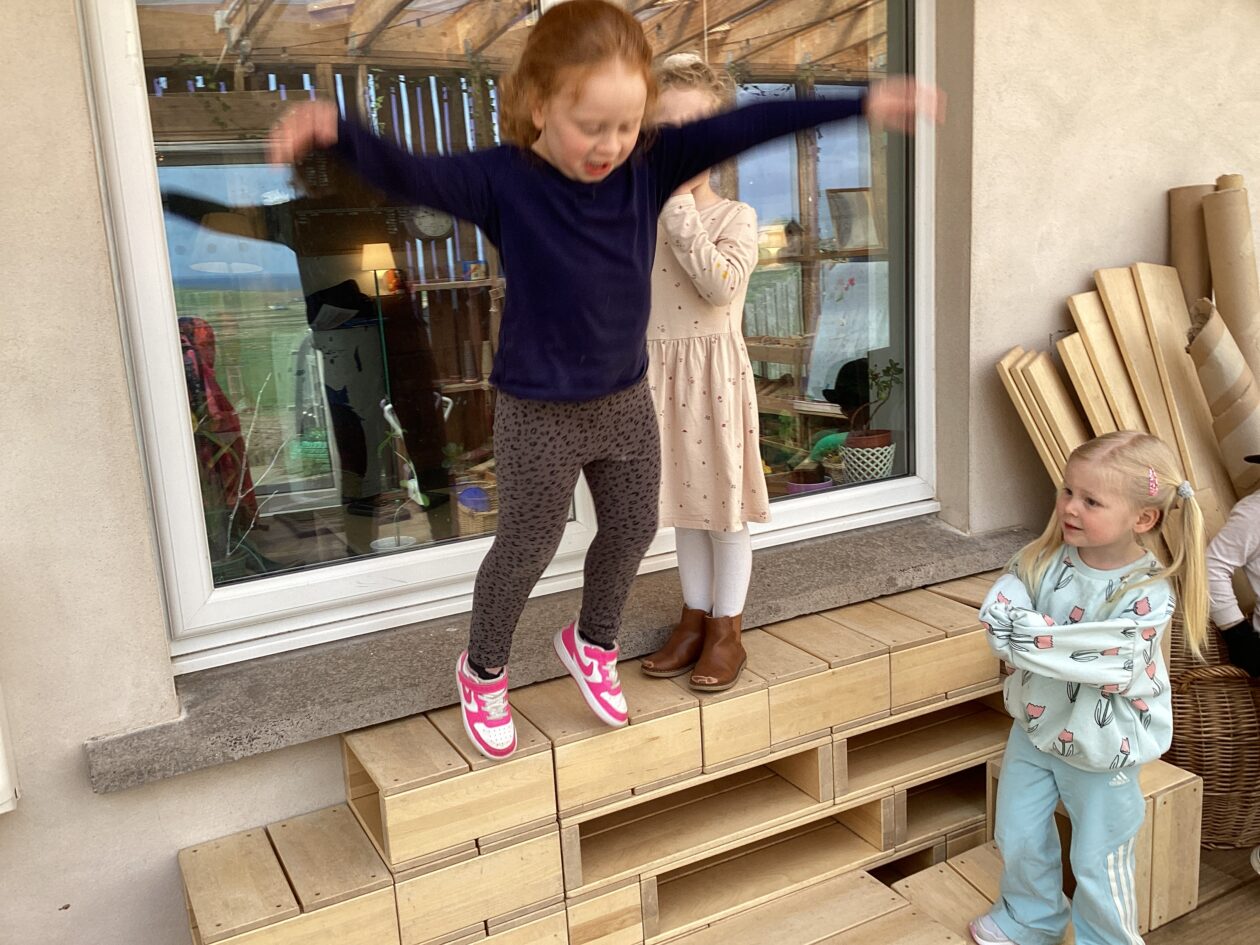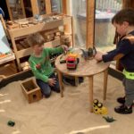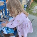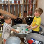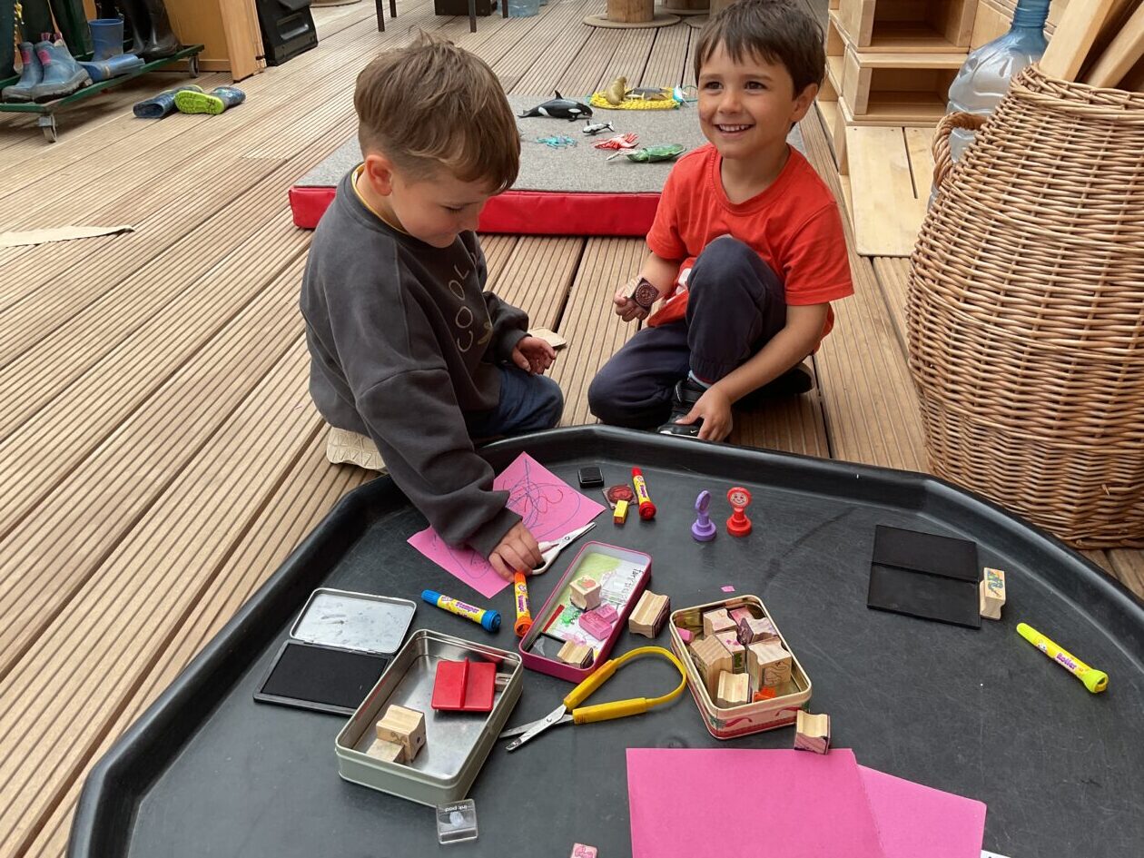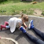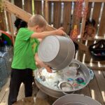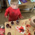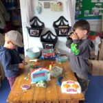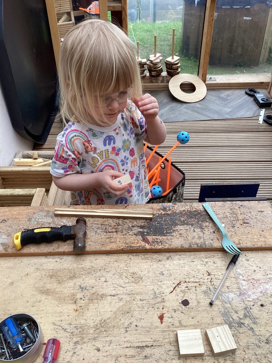 The bairns have been experimenting with different ways to slide down the steep hill in the garden. They have used cardboard, cushions, carpet tiles and slithery breeks! We have also seen lots of engagement with water play and managed to get the solar fountain working as the sun made a bit of a reappearance. We headed to the playpark one afternoon too and the bairns played chasing games, spun on the swings, tried to walk up the slide and got wobbly as jelly on a plate.