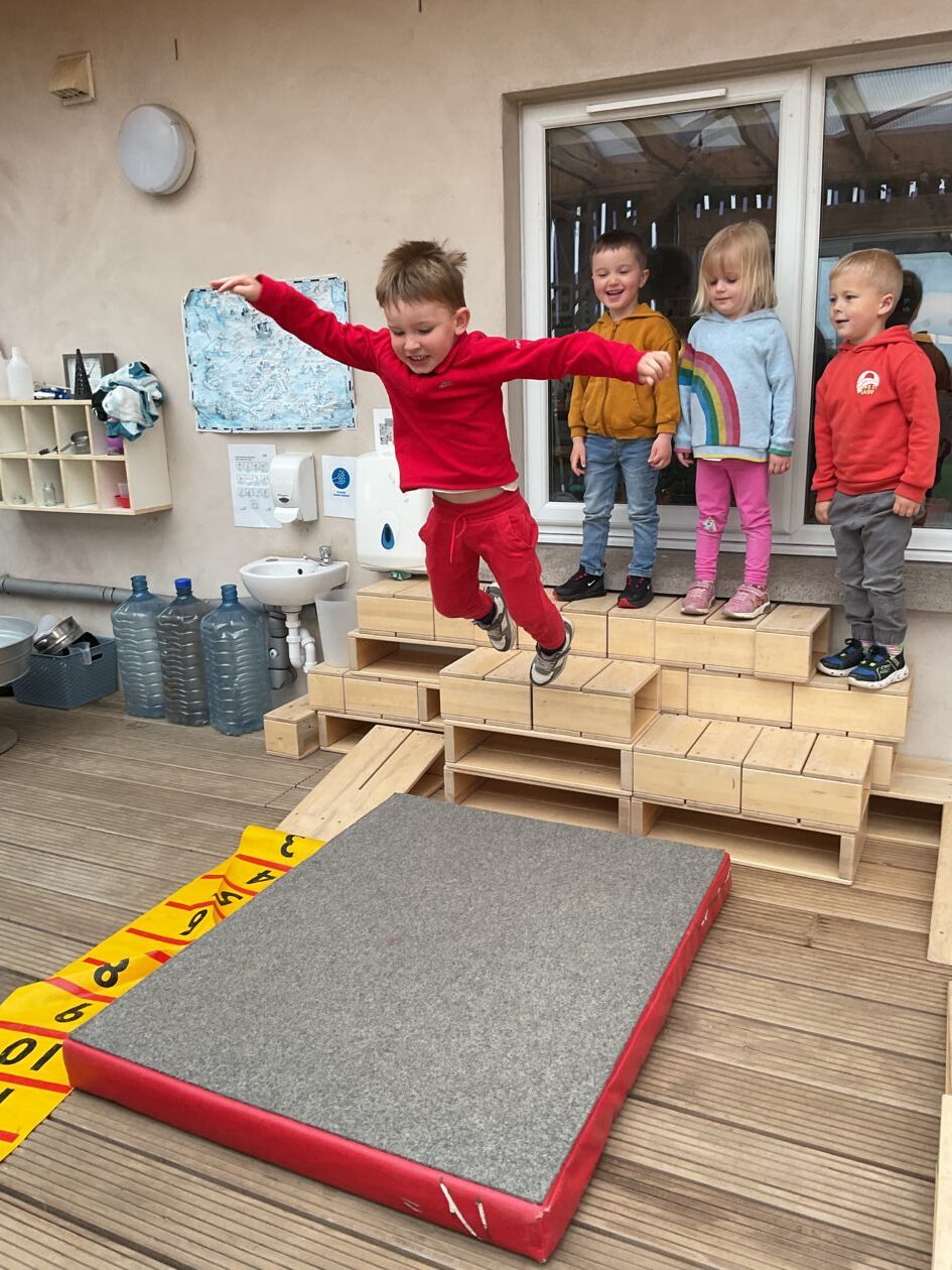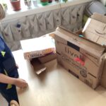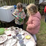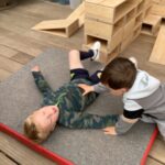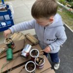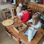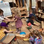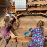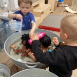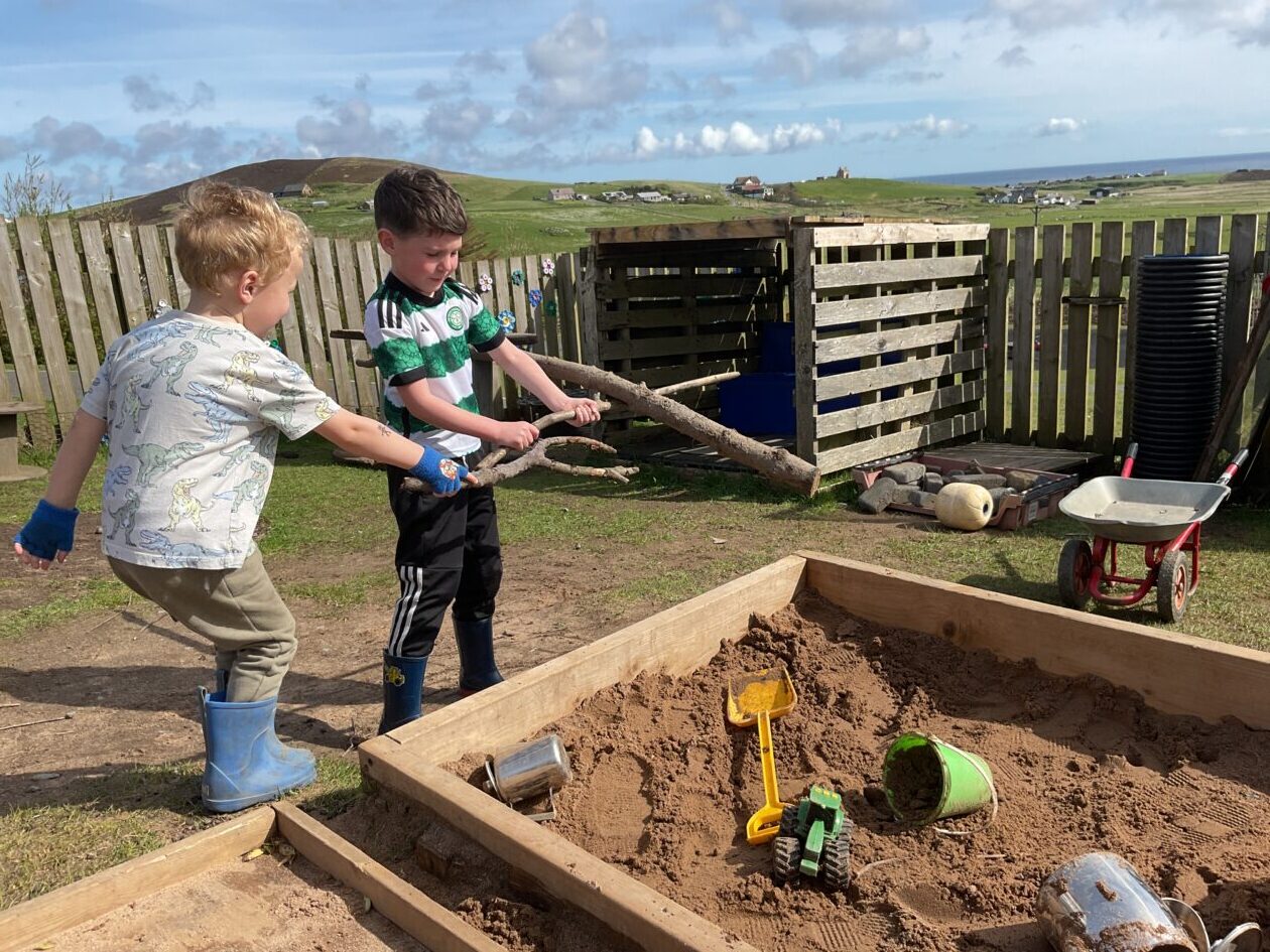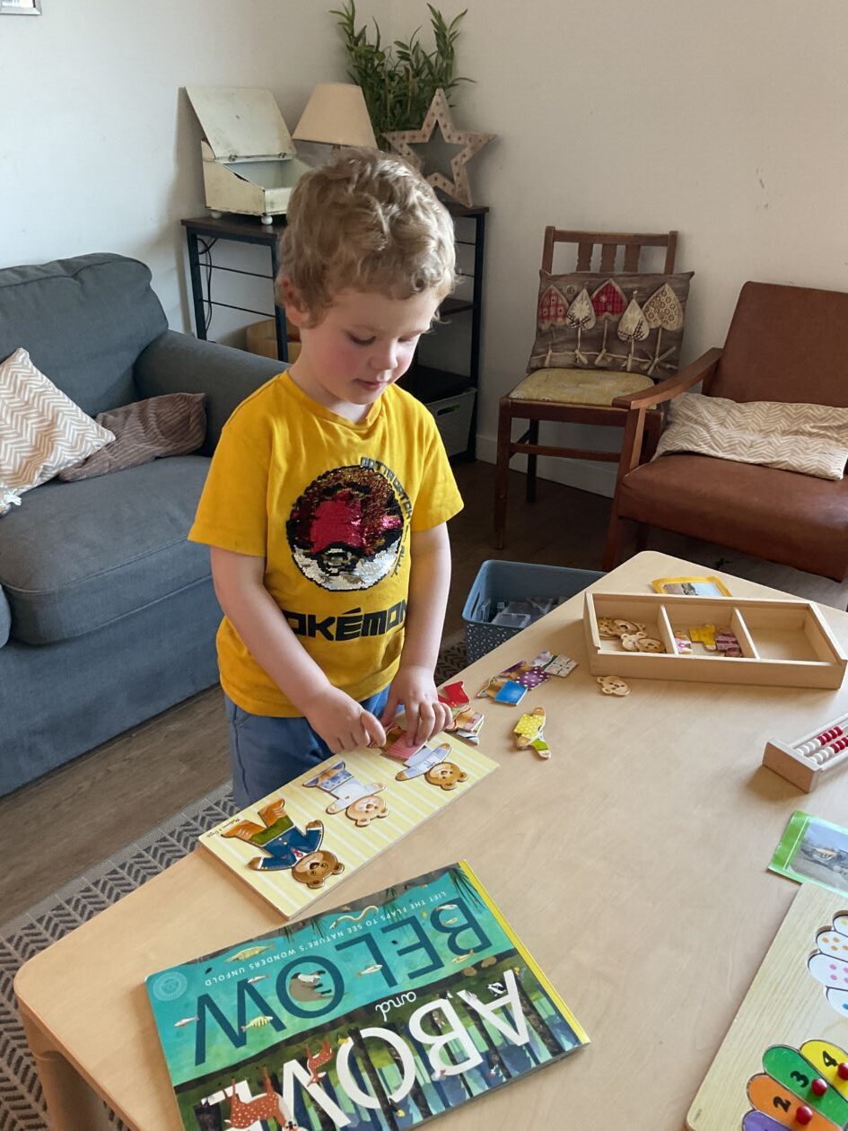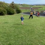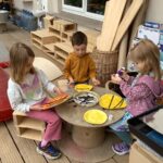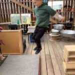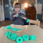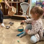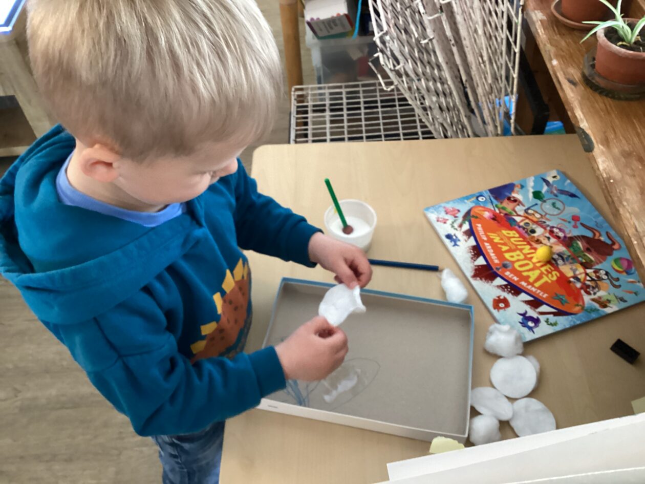 The bairns have been experimenting with different ways to slide down the steep hill in the garden. They have used cardboard, cushions, carpet tiles and slithery breeks! We have also seen lots of engagement with water play and managed to get the solar fountain working as the sun made a bit of a reappearance. We headed to the playpark one afternoon too and the bairns played chasing games, spun on the swings, tried to walk up the slide and got wobbly as jelly on a plate.