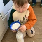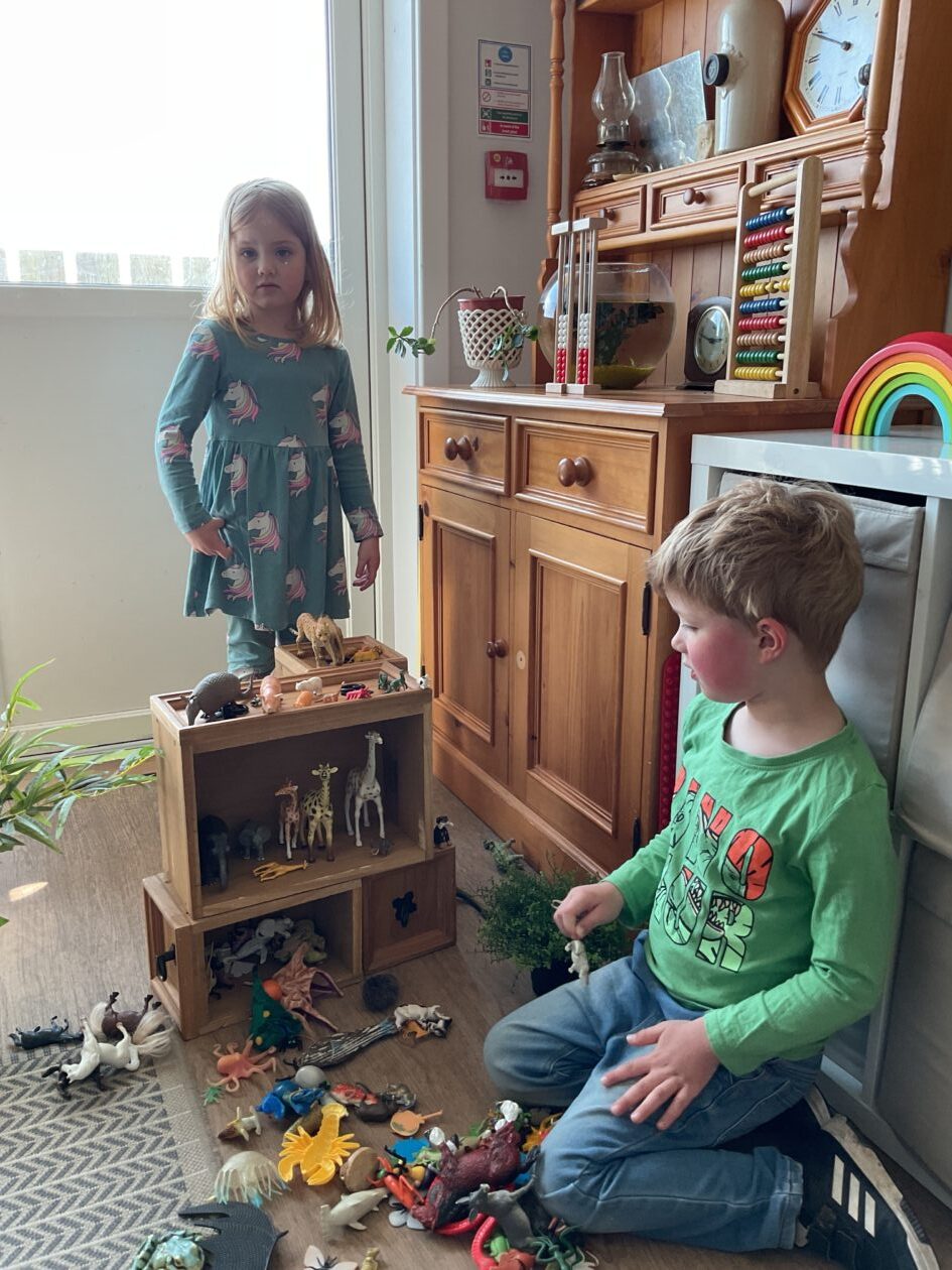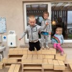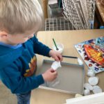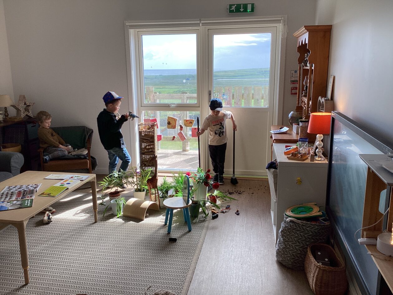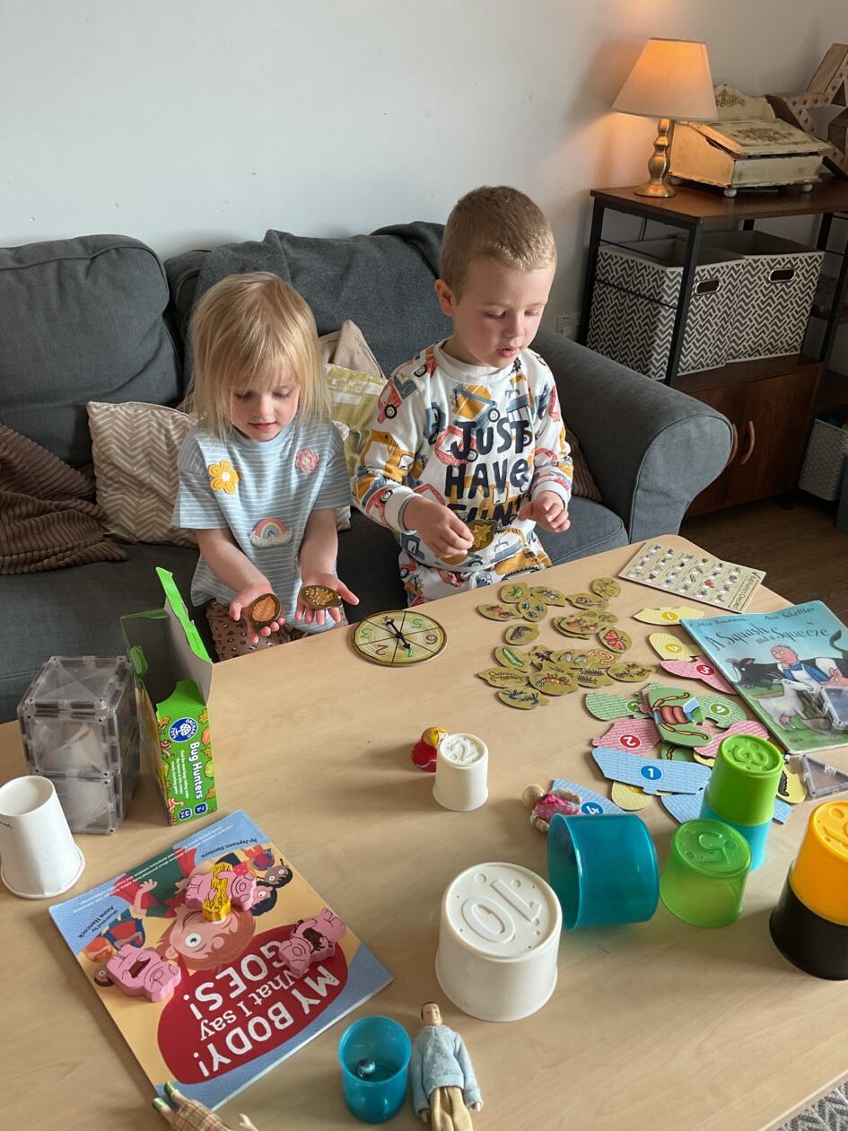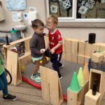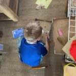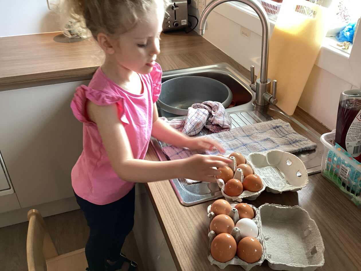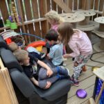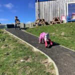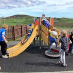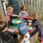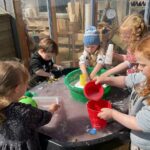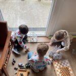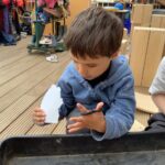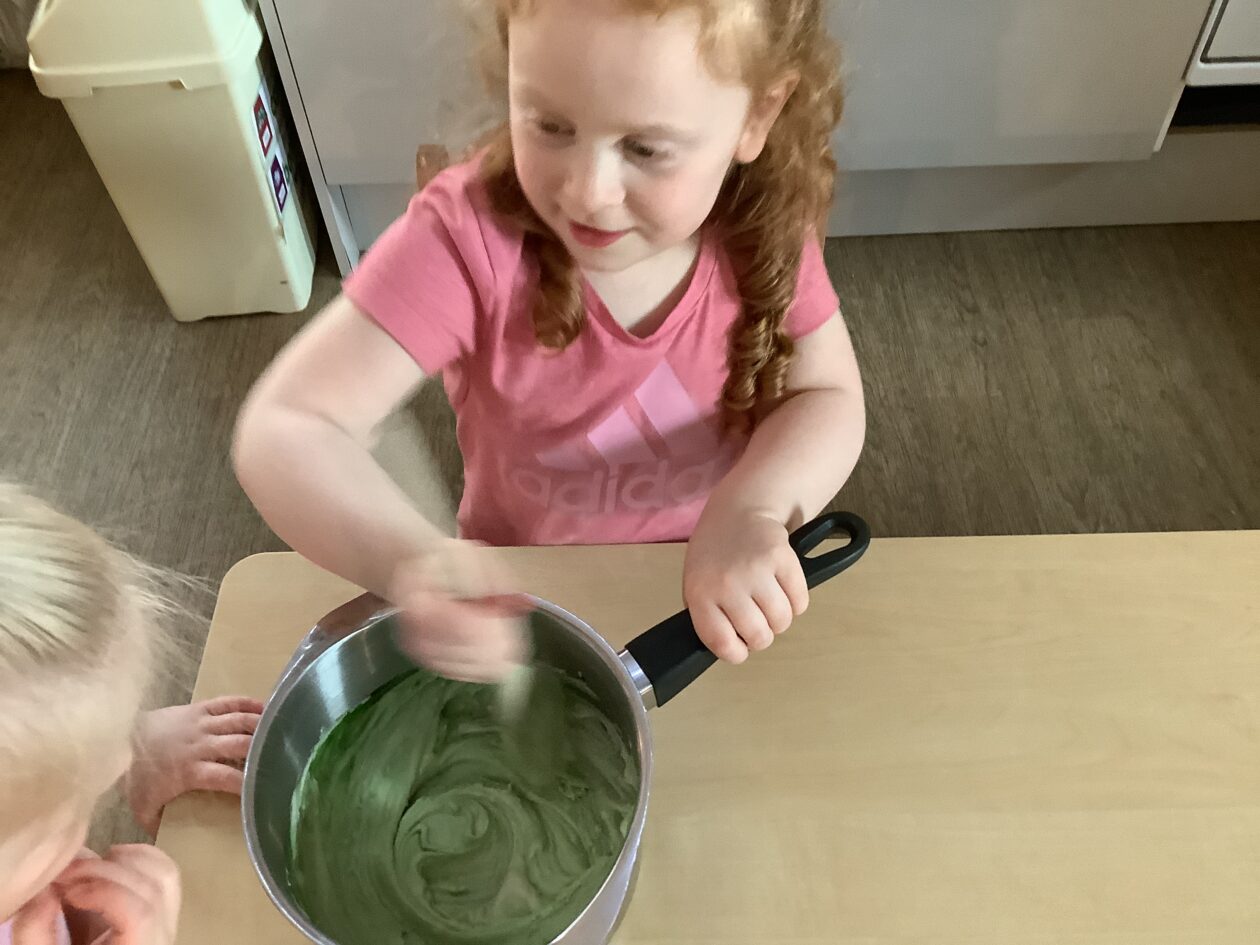 The bairns have been experimenting with different ways to slide down the steep hill in the garden. They have used cardboard, cushions, carpet tiles and slithery breeks! We have also seen lots of engagement with water play and managed to get the solar fountain working as the sun made a bit of a reappearance. We headed to the playpark one afternoon too and the bairns played chasing games, spun on the swings, tried to walk up the slide and got wobbly as jelly on a plate.