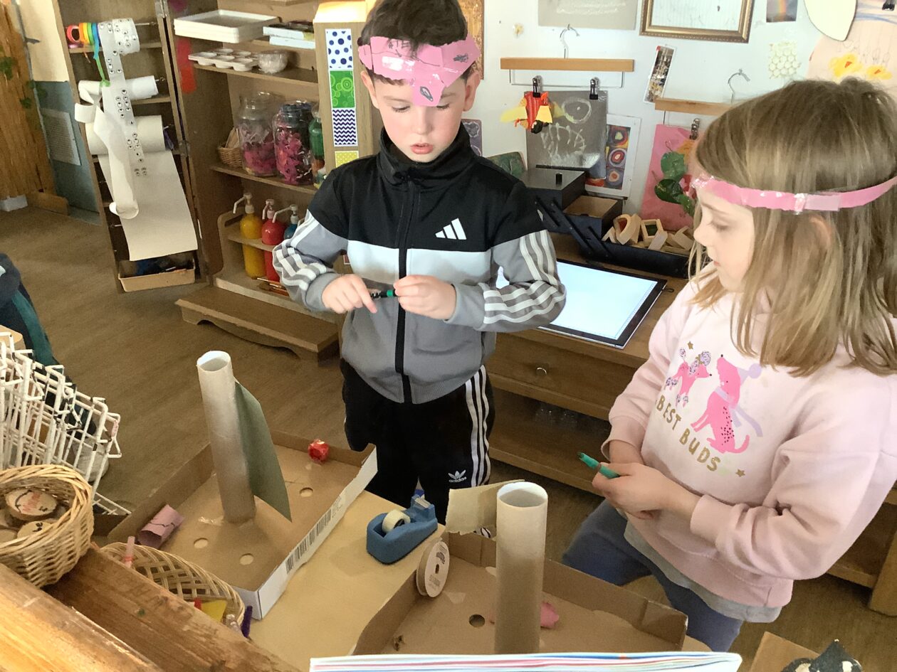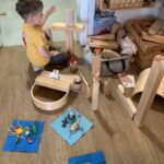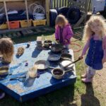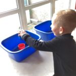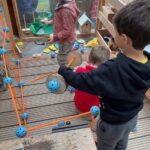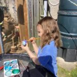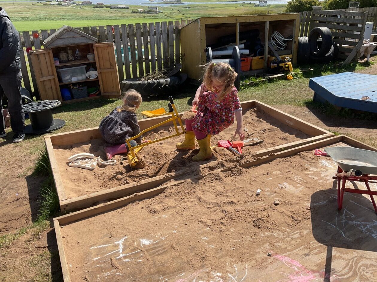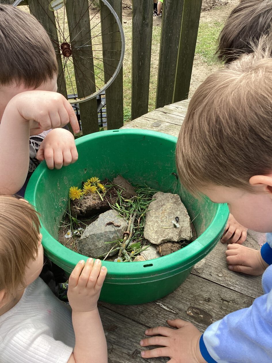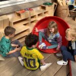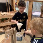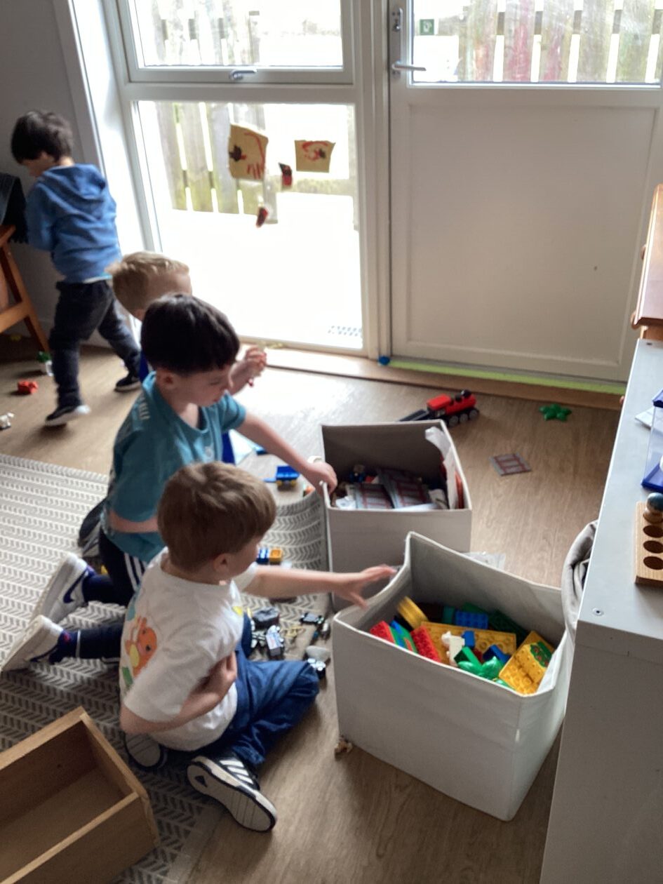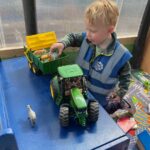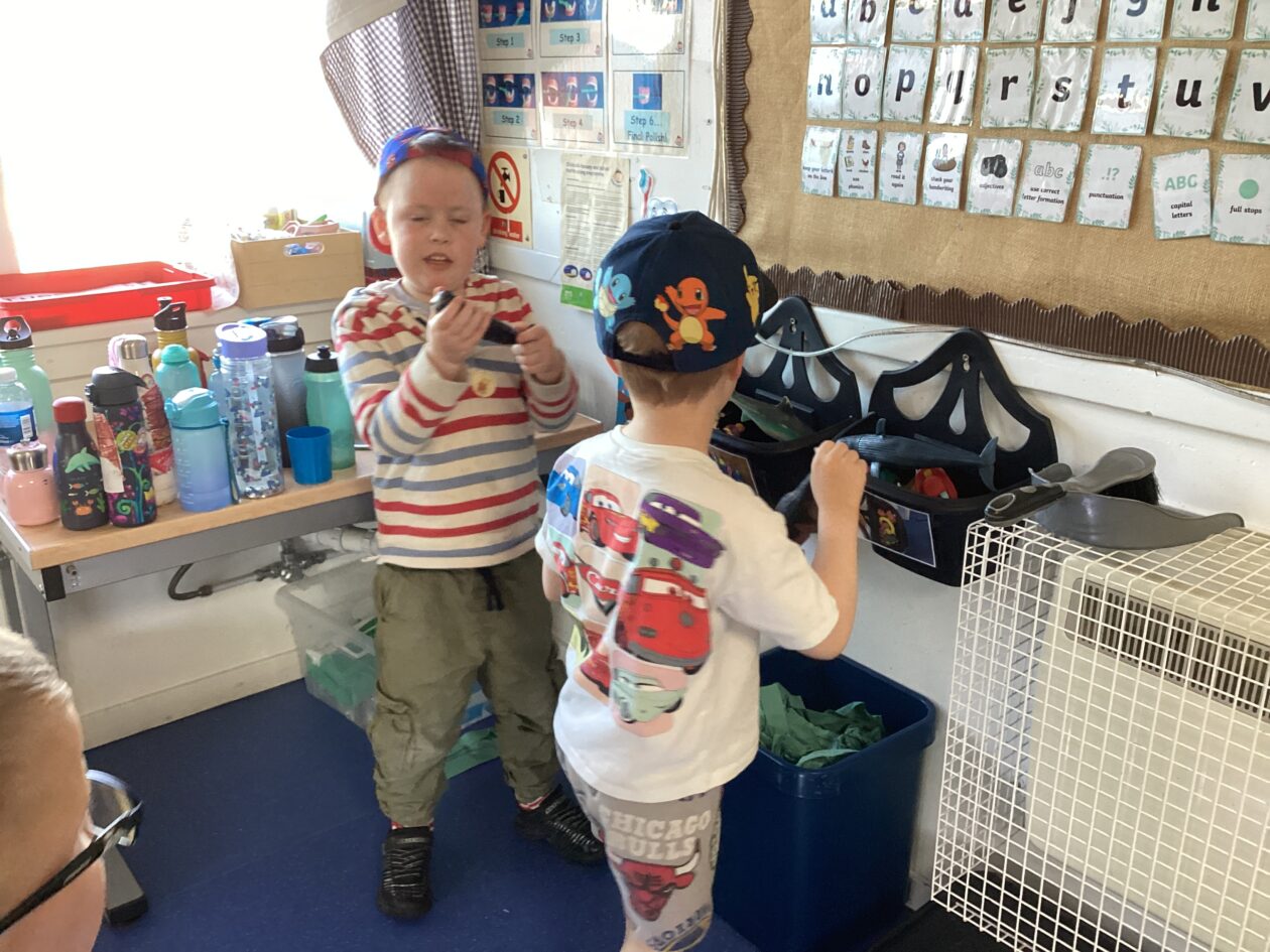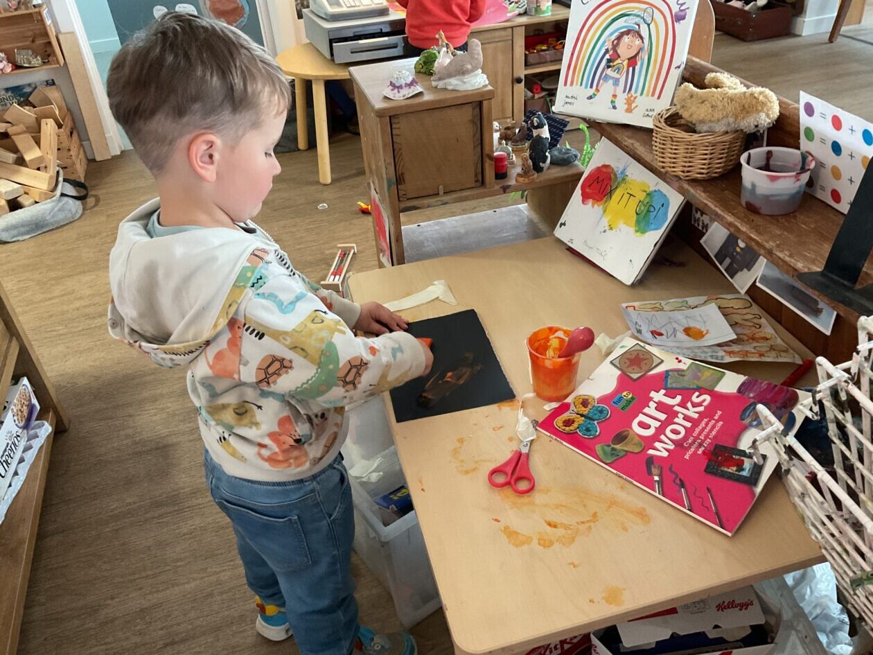 The bairns have been experimenting with different ways to slide down the steep hill in the garden. They have used cardboard, cushions, carpet tiles and slithery breeks! We have also seen lots of engagement with water play and managed to get the solar fountain working as the sun made a bit of a reappearance. We headed to the playpark one afternoon too and the bairns played chasing games, spun on the swings, tried to walk up the slide and got wobbly as jelly on a plate.