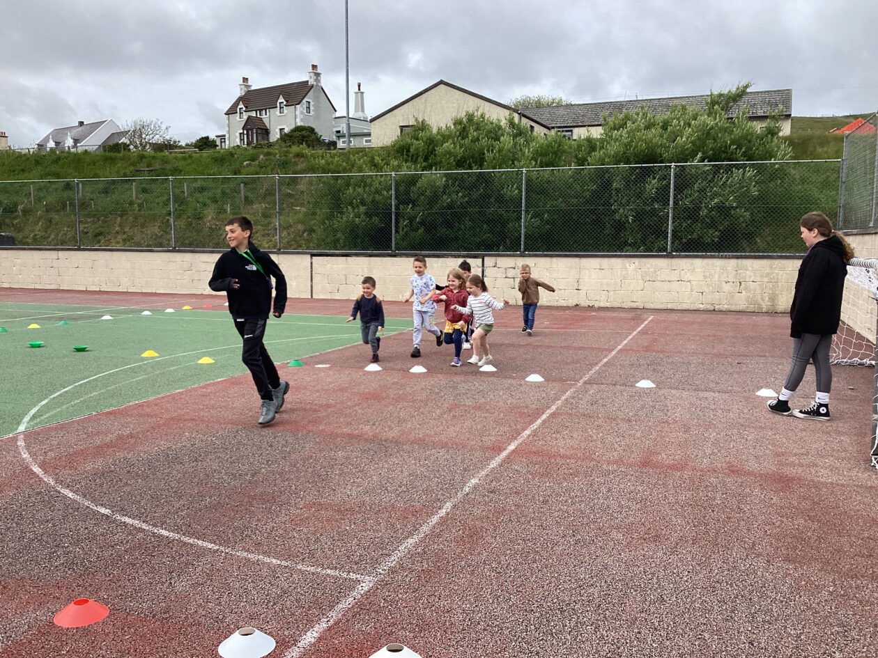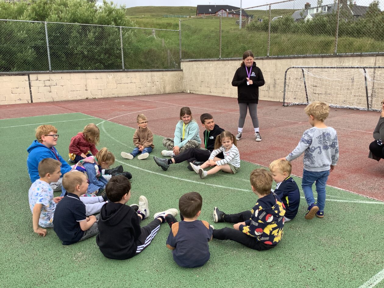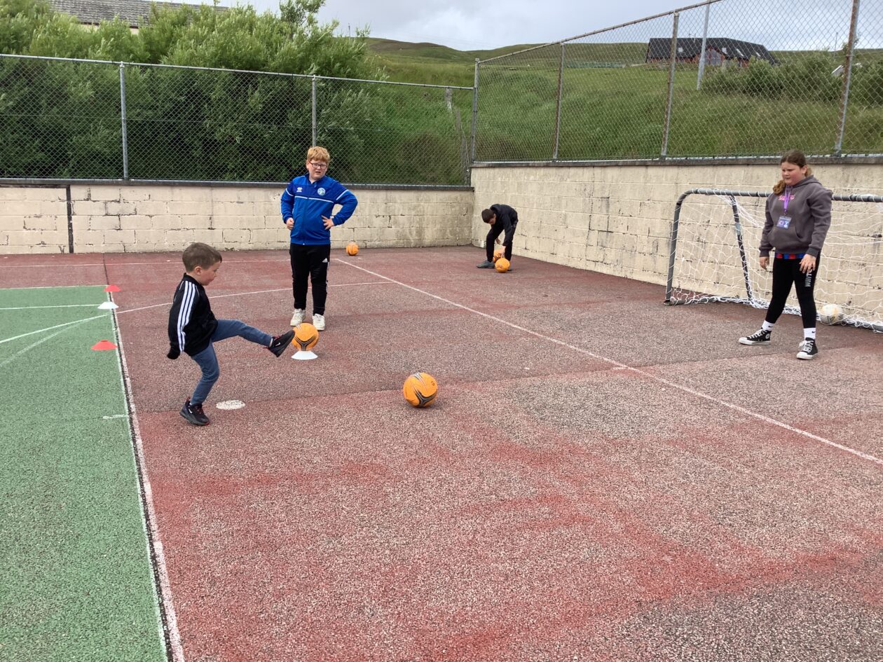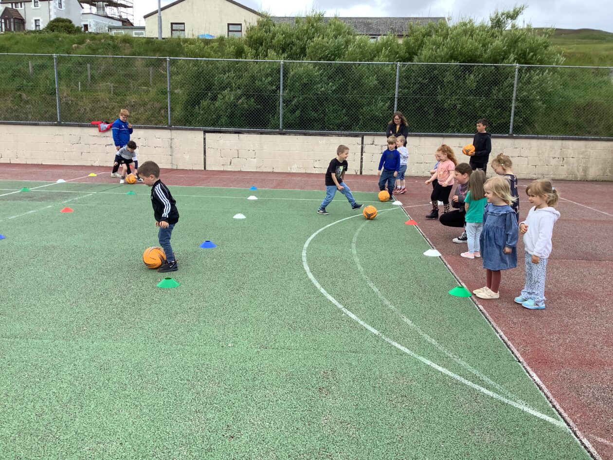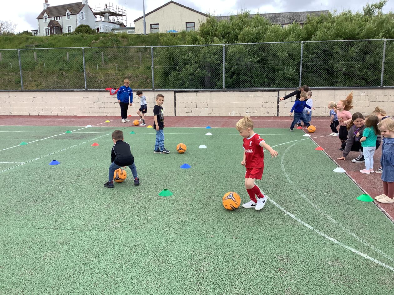 The Primary 7 bairns held another Monster Kickabout and took the nursery bairns to the multicourt for coaching sessions focusing on football skills. They played games like Duck Duck Goose, Simon Says and Ship Shore Sea. The bairns had a turn at dribbling and a penalty shoot-out. They made a circle and practiced passing the ball to each other. The bairns also submitted their medal colouring in sheets.