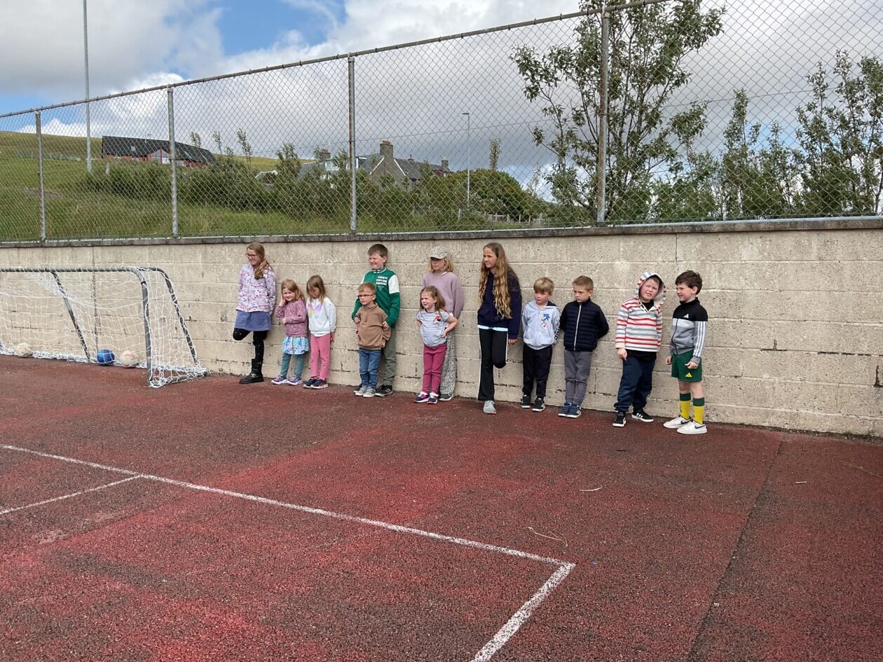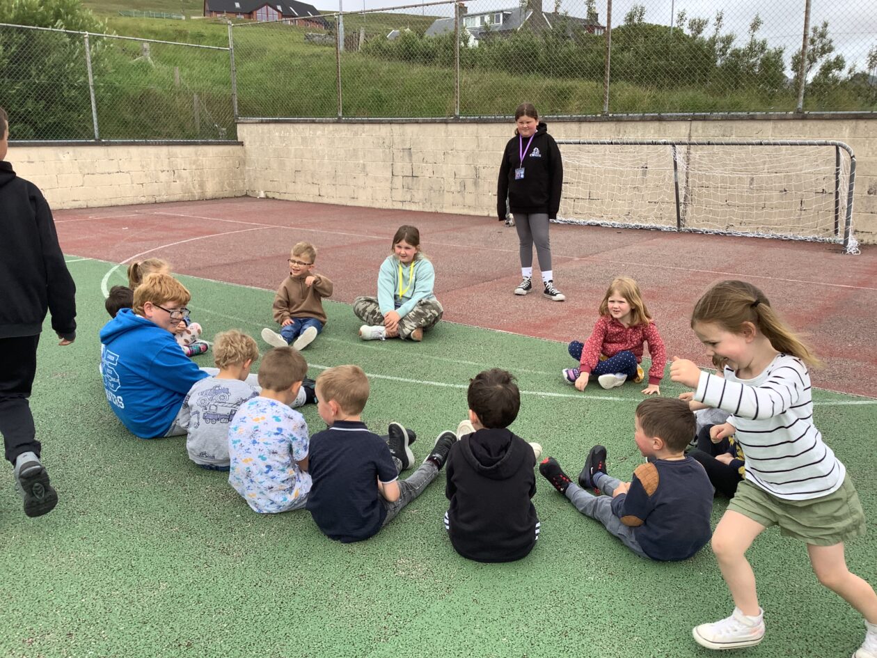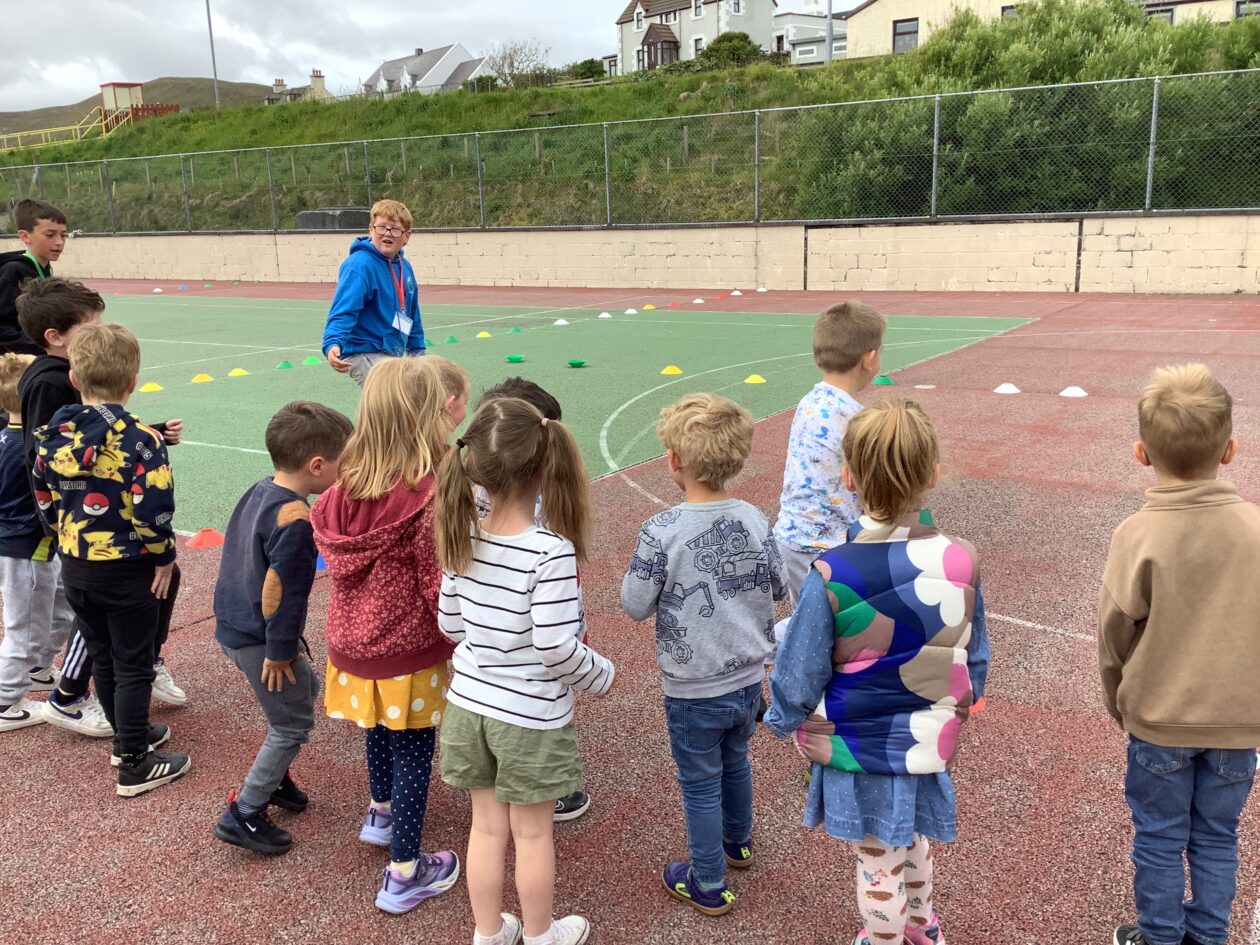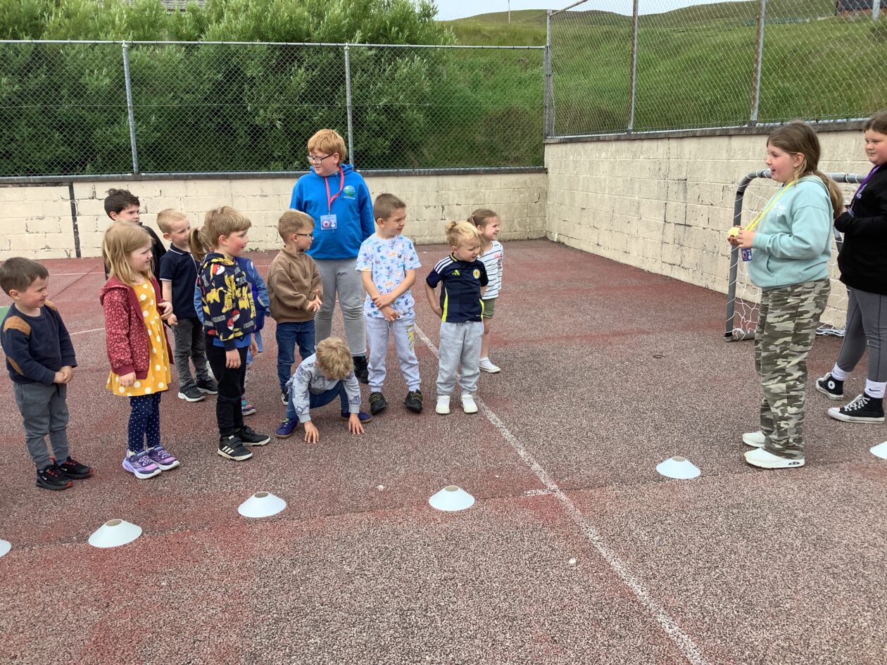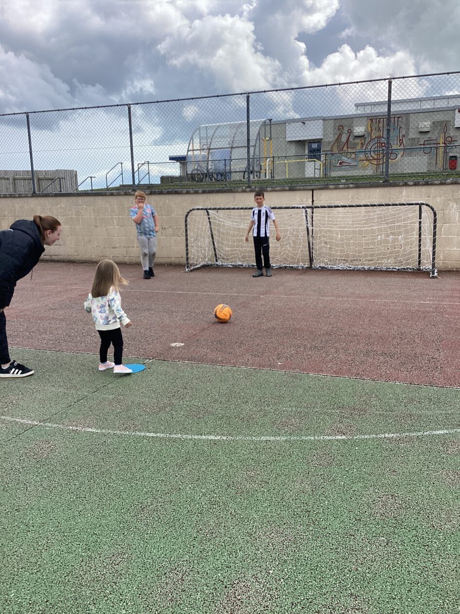 The Primary 7 bairns held another Monster Kickabout and took the nursery bairns to the multicourt for coaching sessions focusing on football skills. They played games like Duck Duck Goose, Simon Says and Ship Shore Sea. The bairns had a turn at dribbling and a penalty shoot-out. They made a circle and practiced passing the ball to each other. The bairns also submitted their medal colouring in sheets.