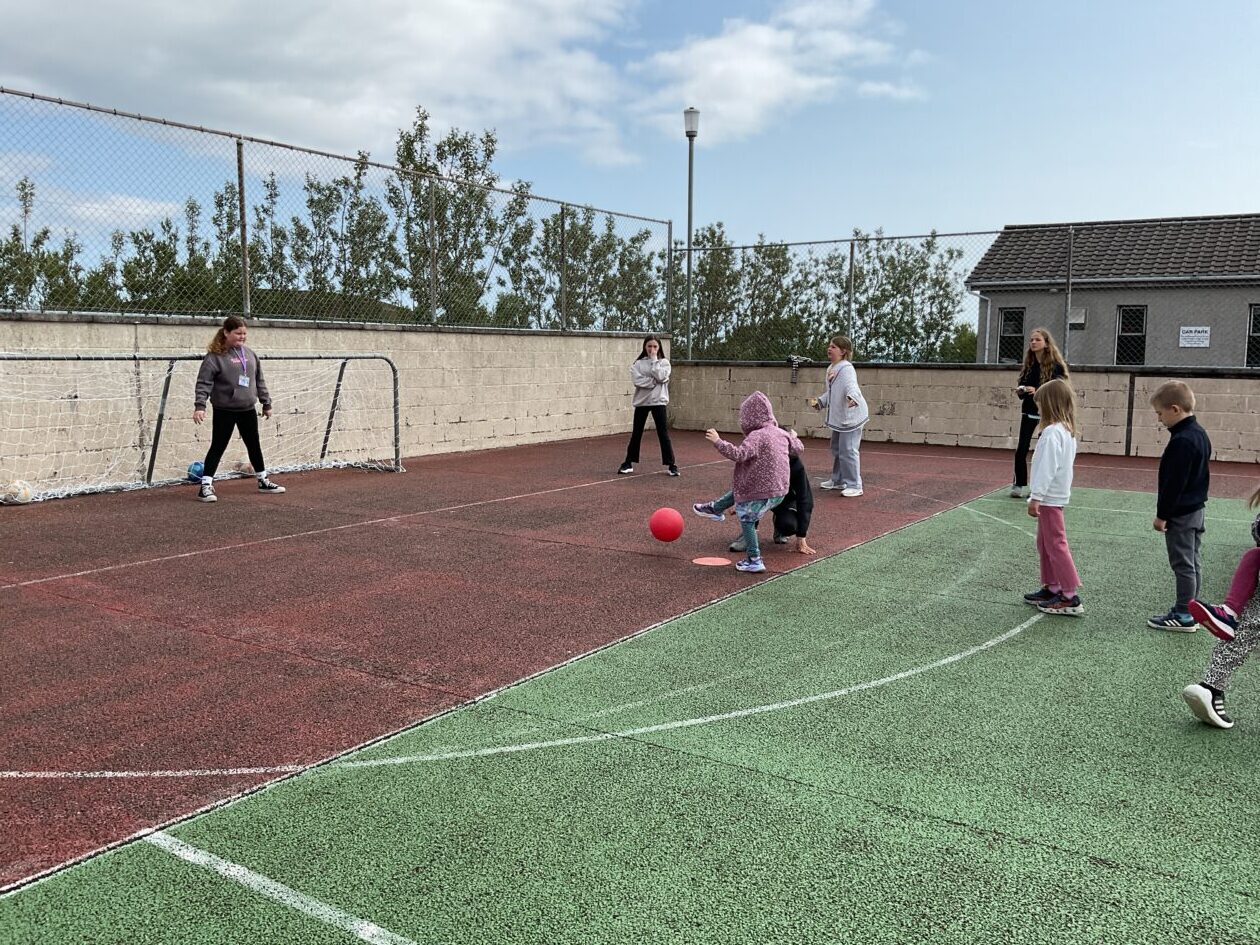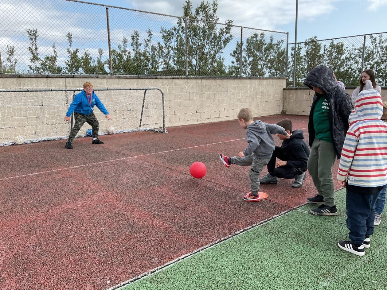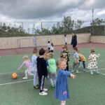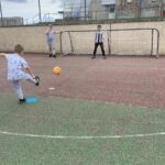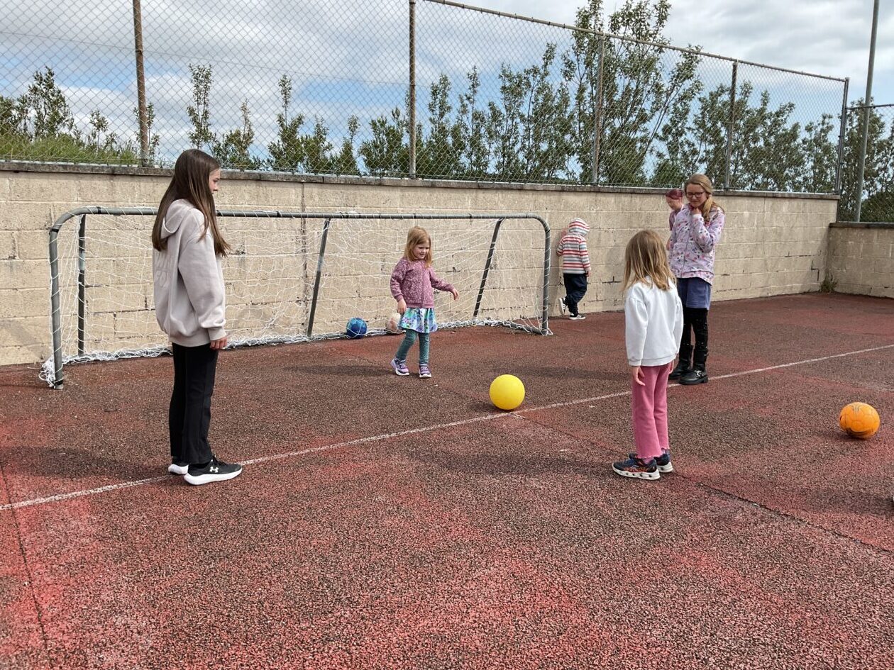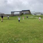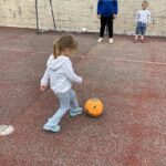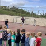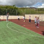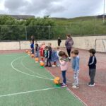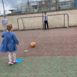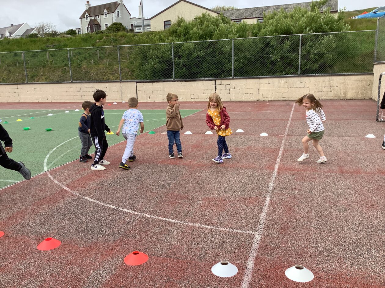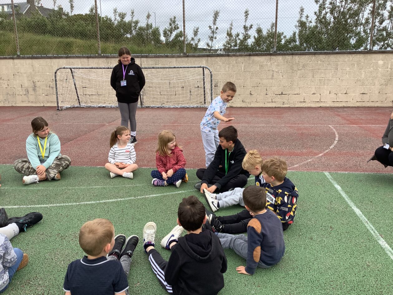 The Primary 7 bairns held another Monster Kickabout and took the nursery bairns to the multicourt for coaching sessions focusing on football skills. They played games like Duck Duck Goose, Simon Says and Ship Shore Sea. The bairns had a turn at dribbling and a penalty shoot-out. They made a circle and practiced passing the ball to each other. The bairns also submitted their medal colouring in sheets.