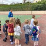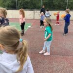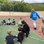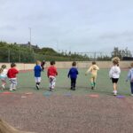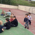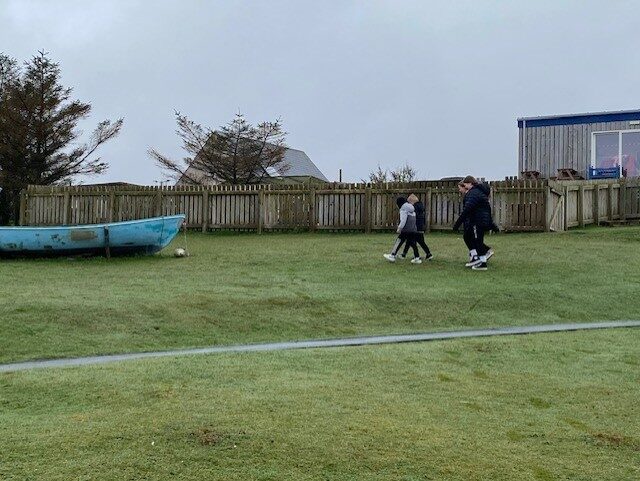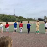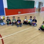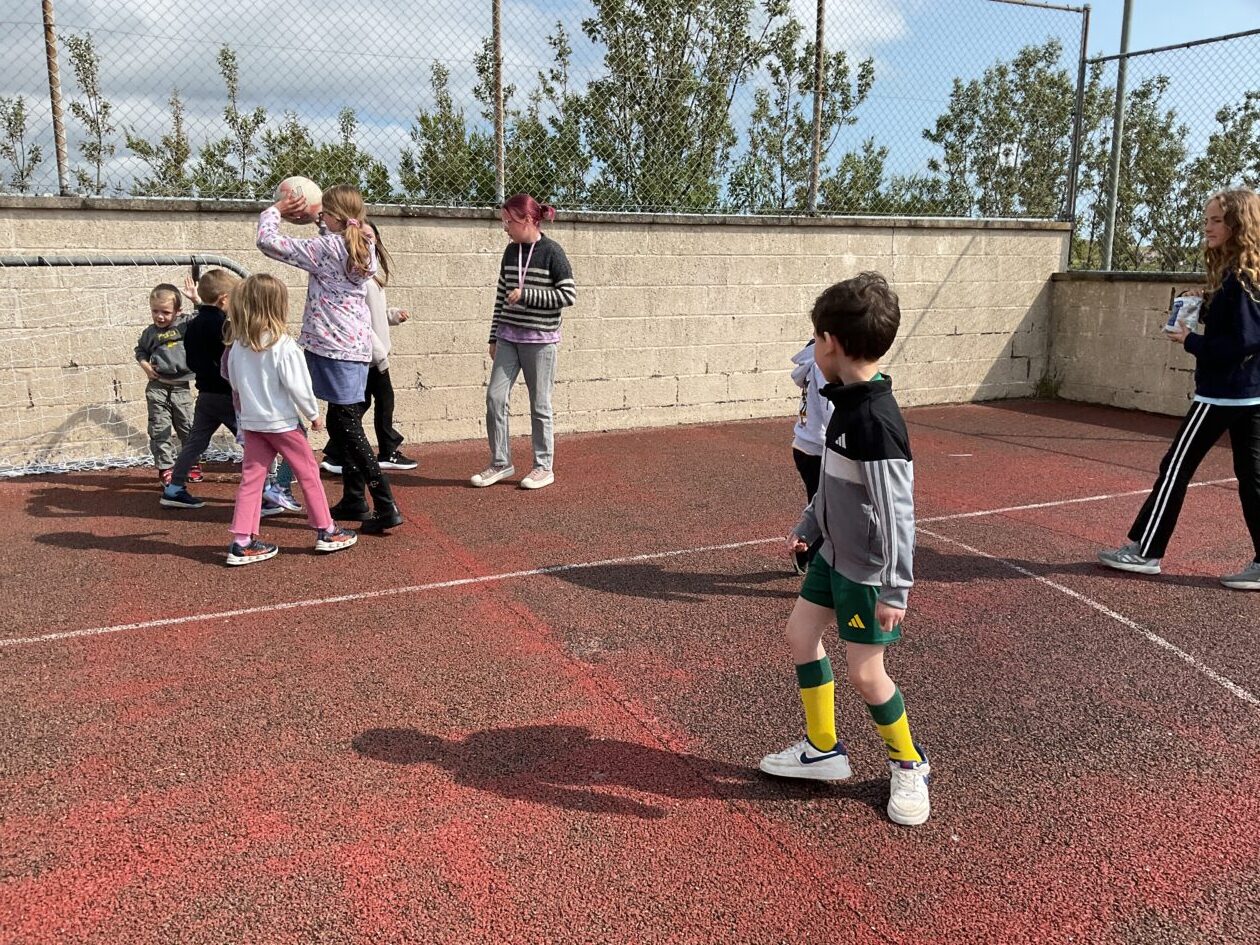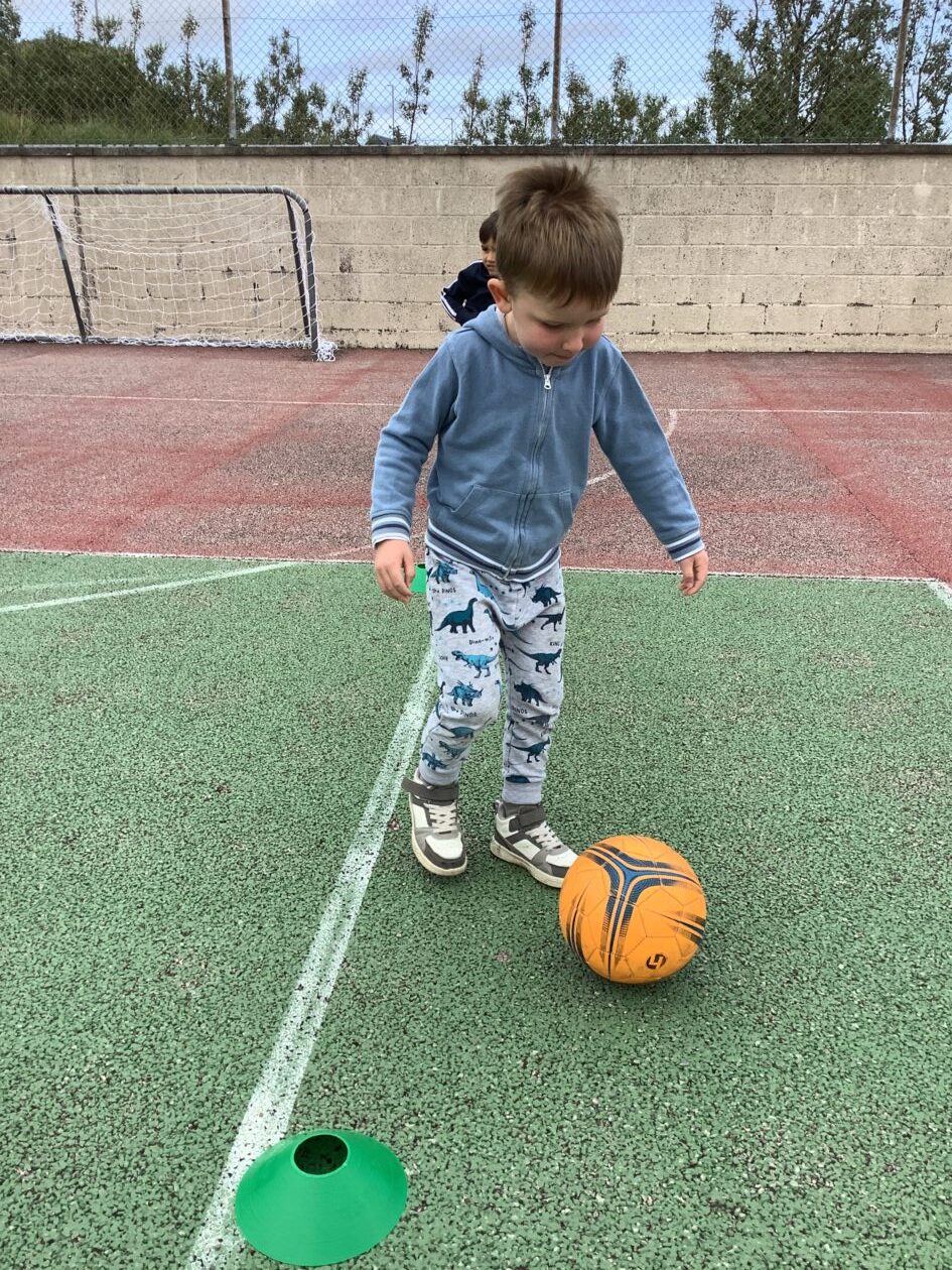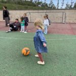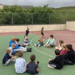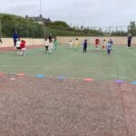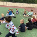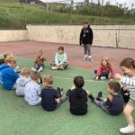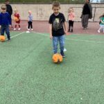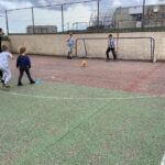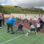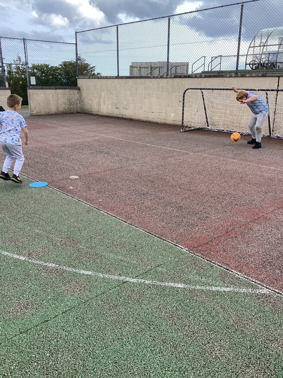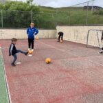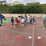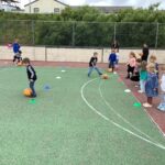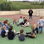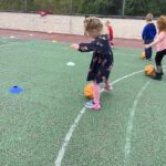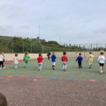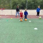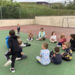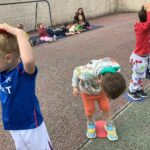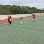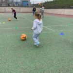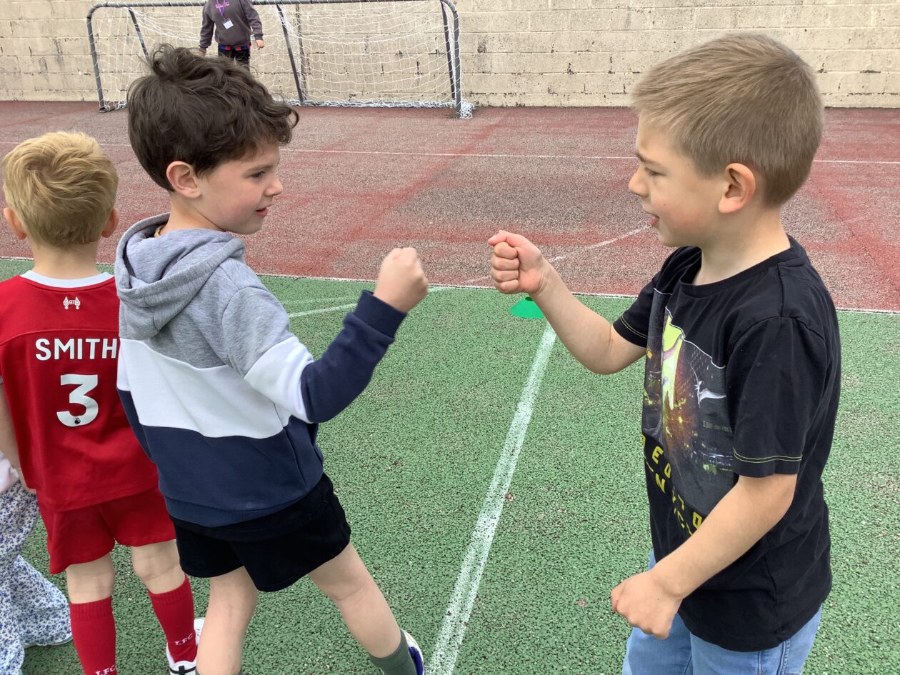 The Primary 7 bairns held another Monster Kickabout and took the nursery bairns to the multicourt for coaching sessions focusing on football skills. They played games like Duck Duck Goose, Simon Says and Ship Shore Sea. The bairns had a turn at dribbling and a penalty shoot-out. They made a circle and practiced passing the ball to each other. The bairns also submitted their medal colouring in sheets.