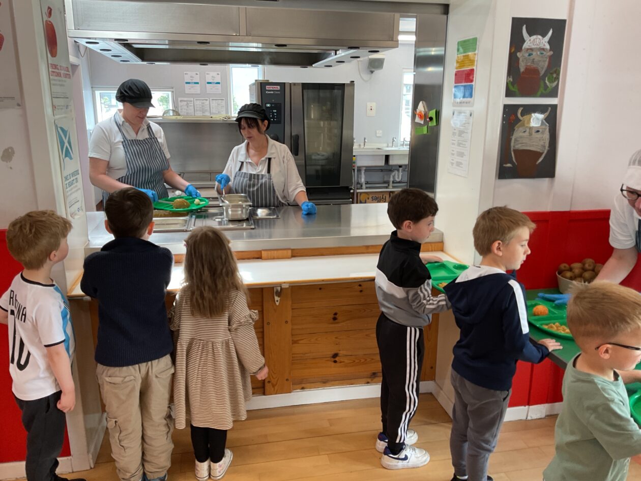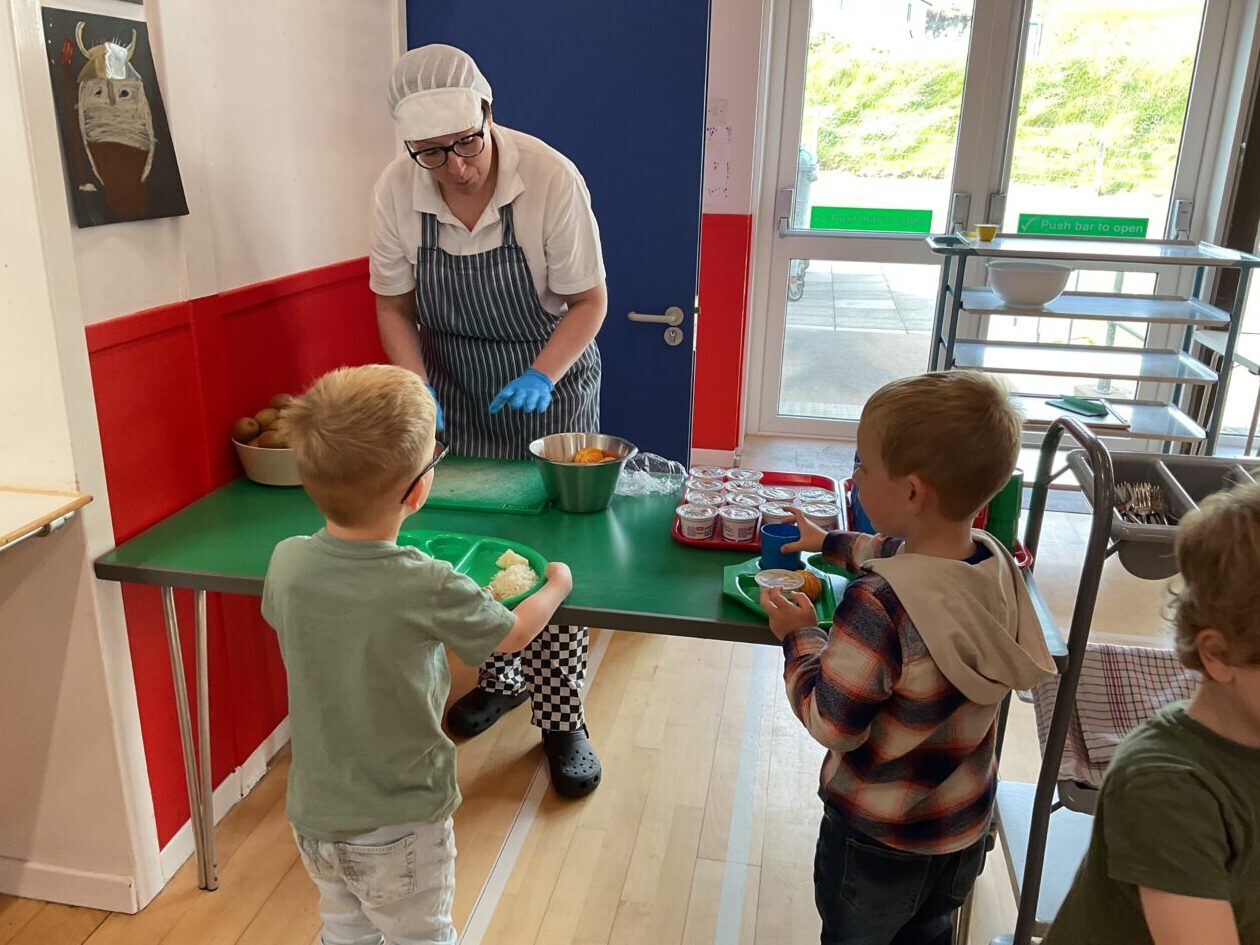 The preschoolers had their first transition lunch this week. They lined up in the hall to receive their tray. They listened to the school dinner routines and with two more sessions planned, they will be experts before parents come in to join them for dinner.