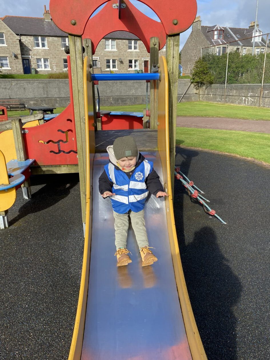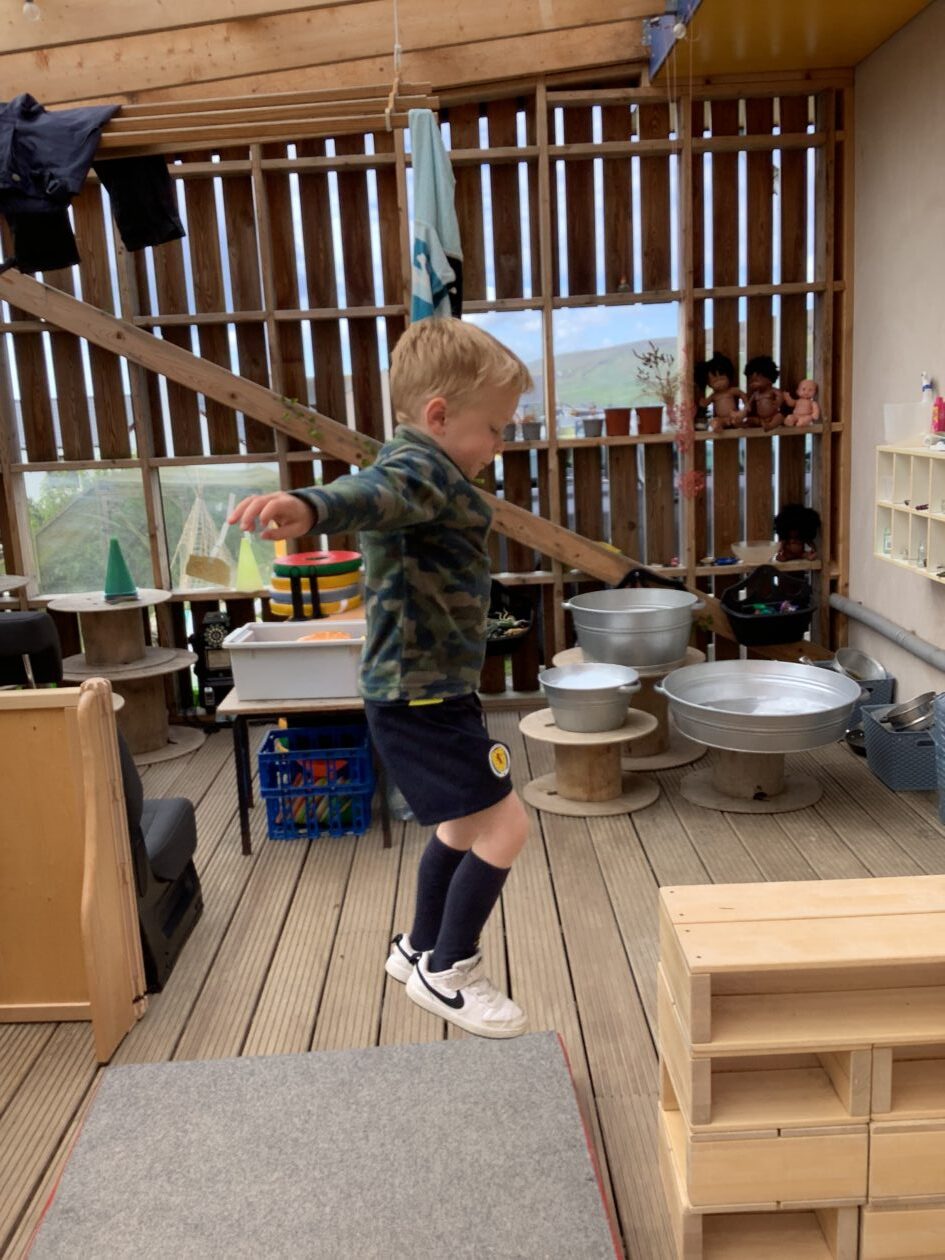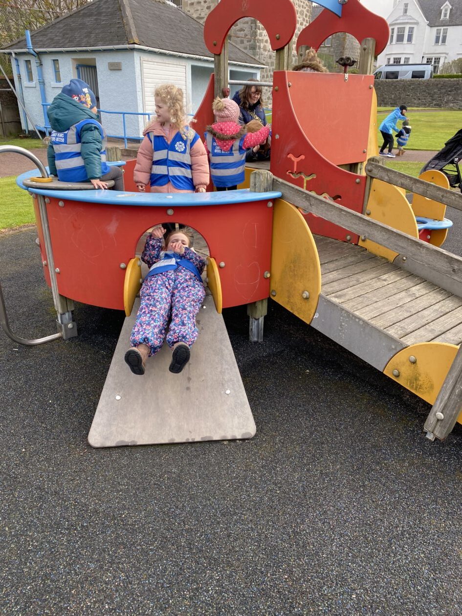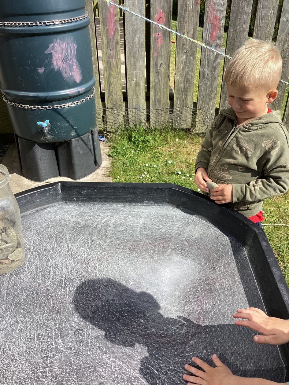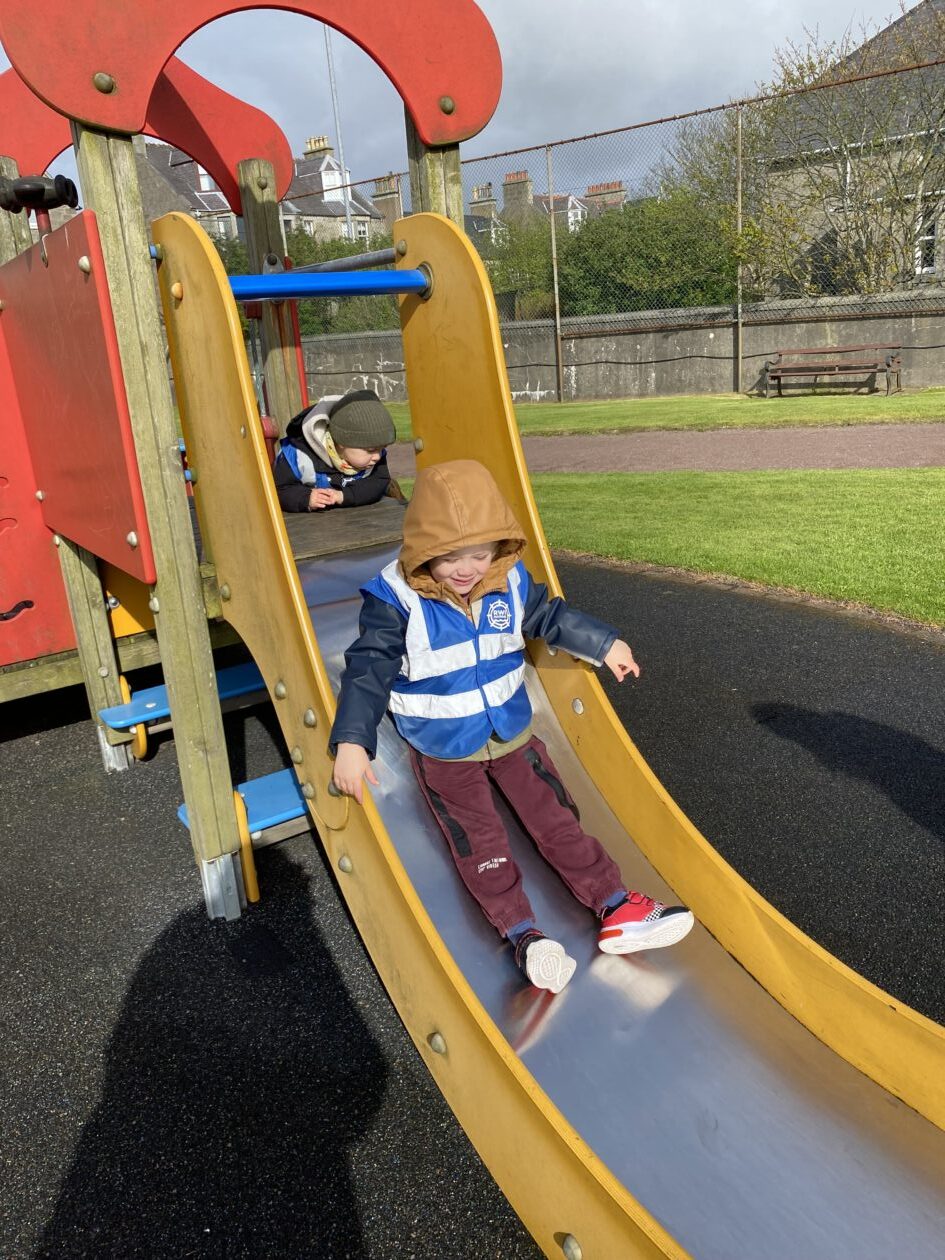 The bairns have been experimenting with different ways to slide down the steep hill in the garden.  They have used cardboard, cushions, carpet tiles and slithery breeks!  We have also seen lots of engagement with water play and managed to get the solar fountain working as the sun made a bit of a reappearance.  We headed to the playpark one afternoon too and the bairns played chasing games, spun on the swings, tried to walk up the slide and got wobbly as jelly on a plate.