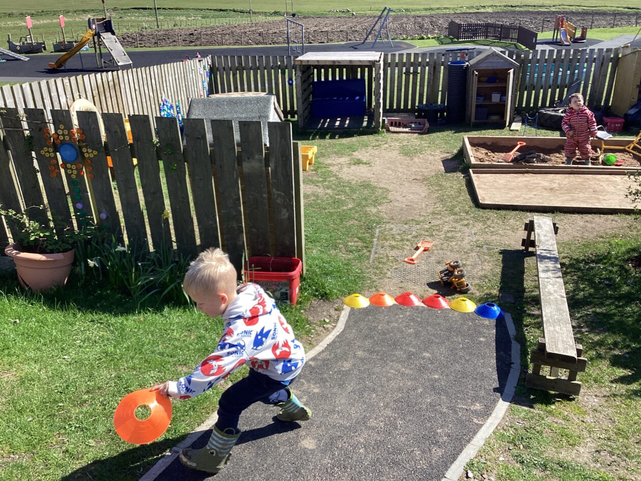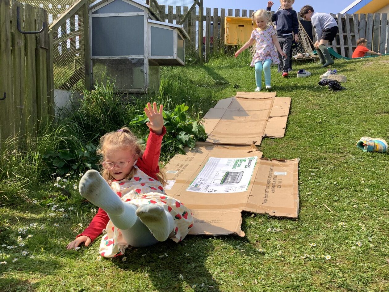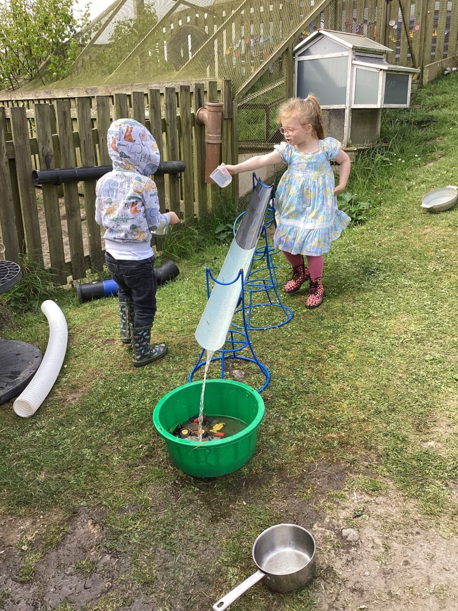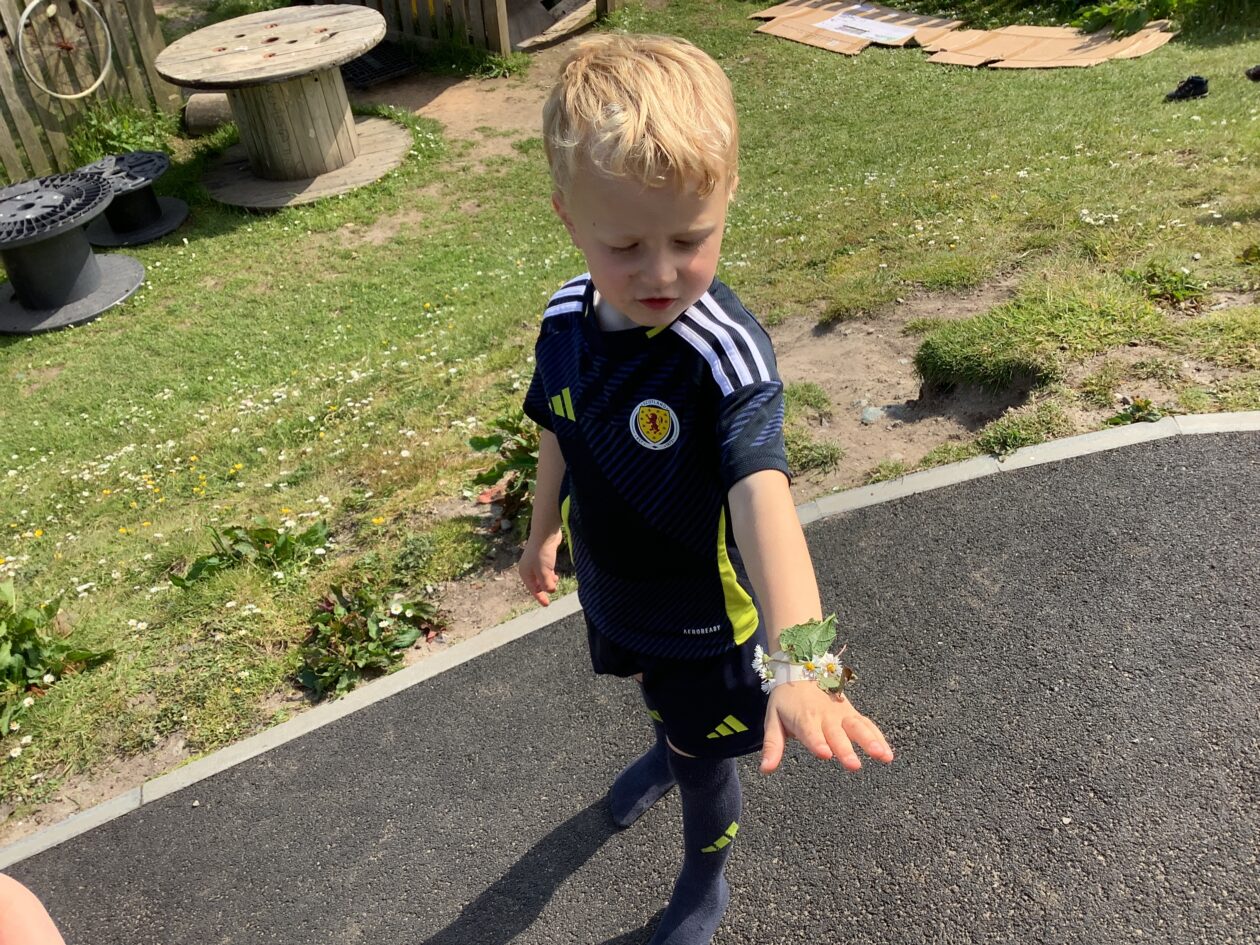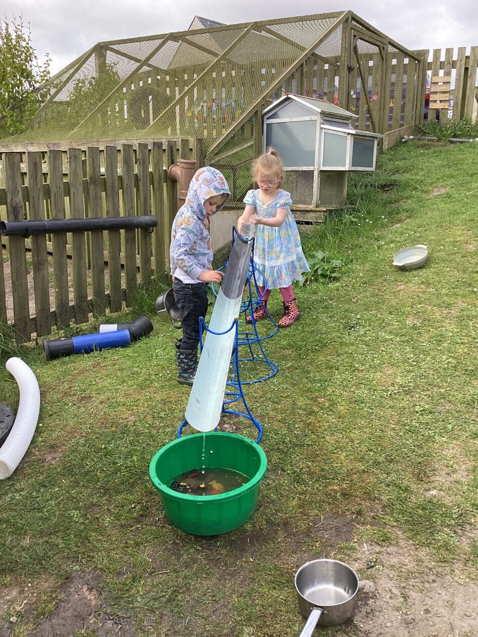 The bairns have been experimenting with different ways to slide down the steep hill in the garden.  They have used cardboard, cushions, carpet tiles and slithery breeks!  We have also seen lots of engagement with water play and managed to get the solar fountain working as the sun made a bit of a reappearance.  We headed to the playpark one afternoon too and the bairns played chasing games, spun on the swings, tried to walk up the slide and got wobbly as jelly on a plate.