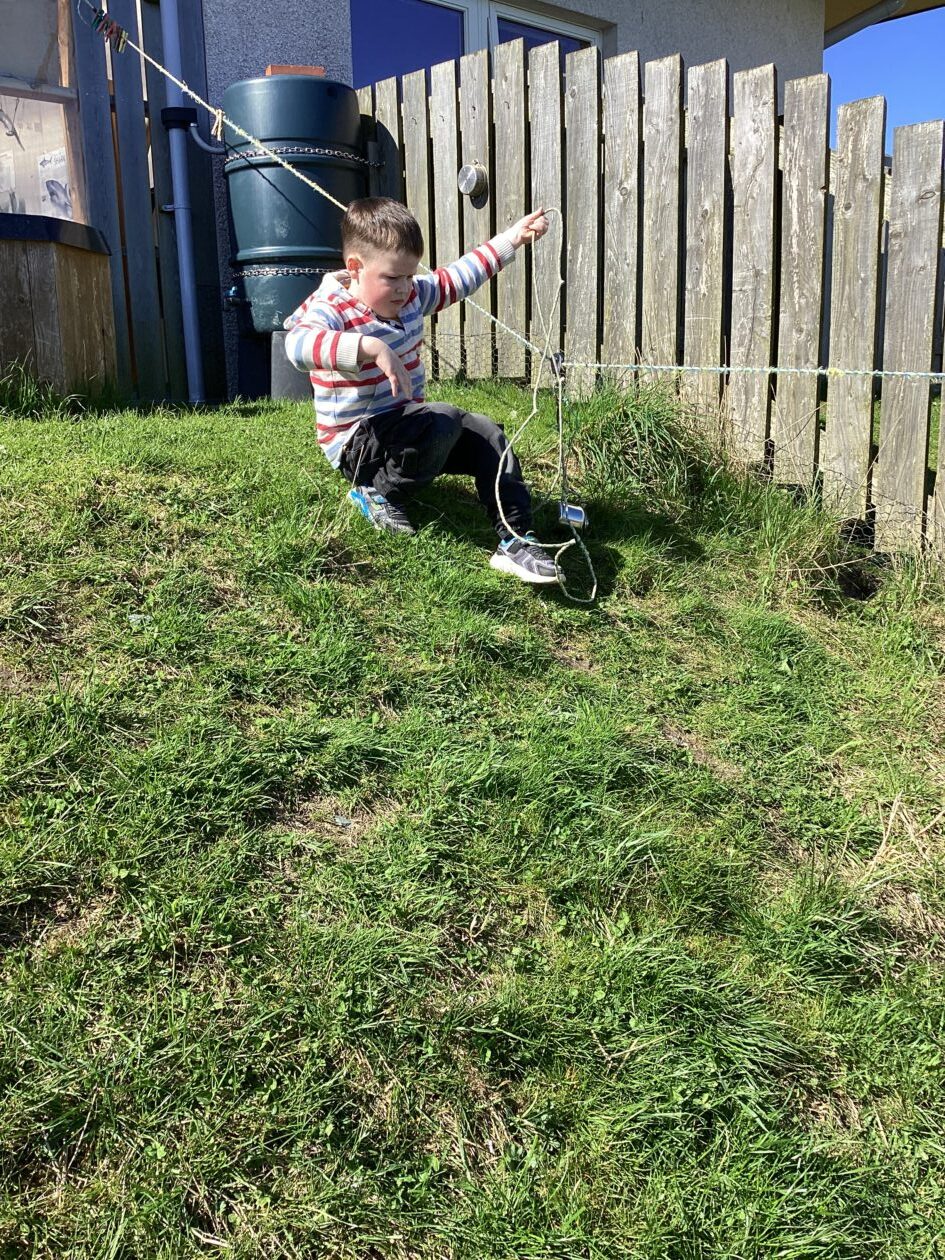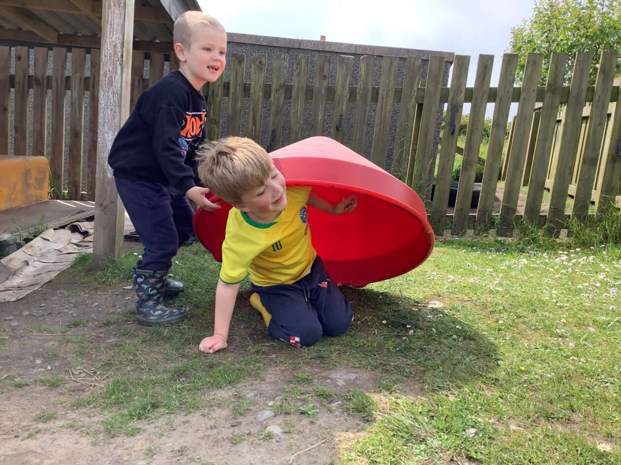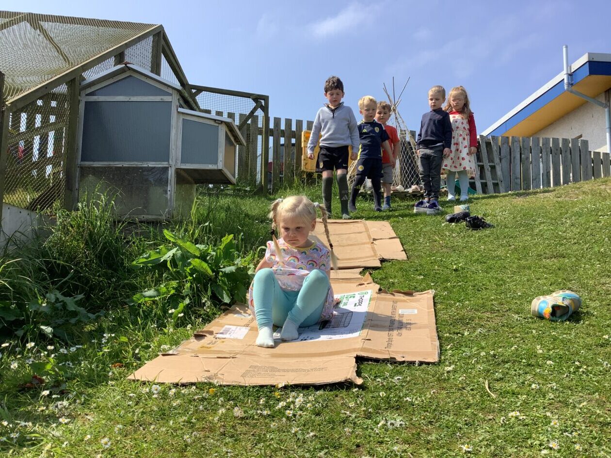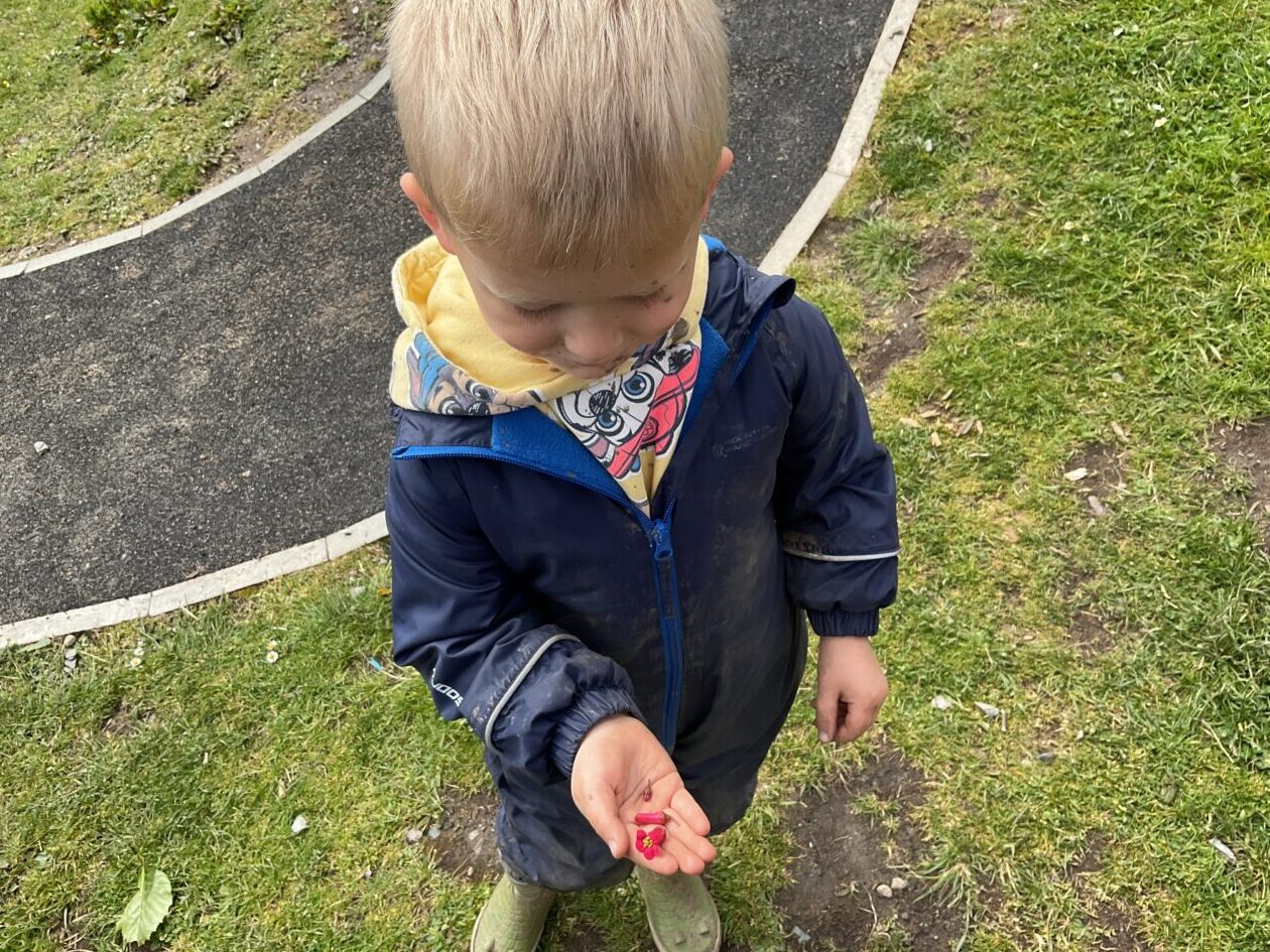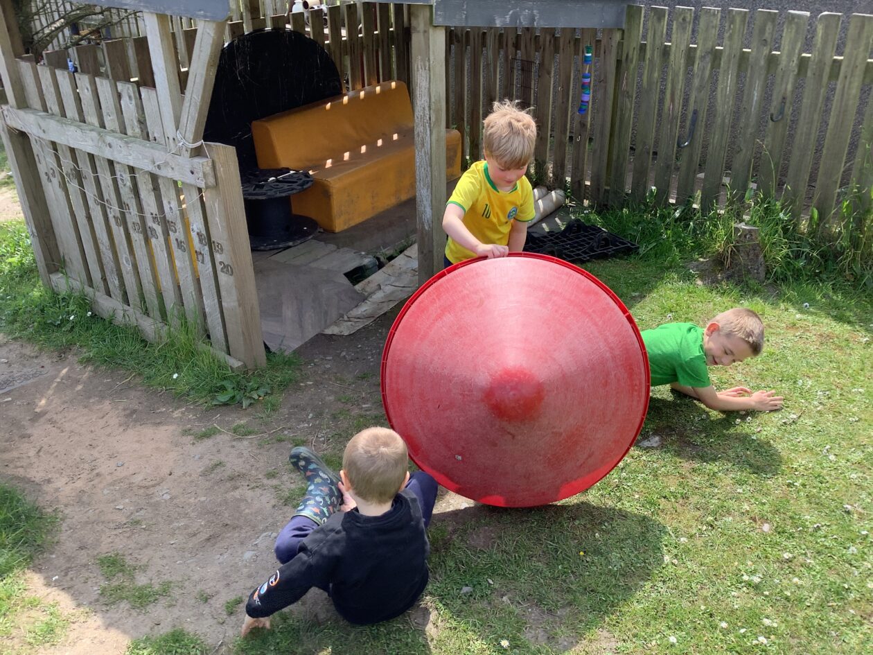 The bairns have been experimenting with different ways to slide down the steep hill in the garden.  They have used cardboard, cushions, carpet tiles and slithery breeks!  We have also seen lots of engagement with water play and managed to get the solar fountain working as the sun made a bit of a reappearance.  We headed to the playpark one afternoon too and the bairns played chasing games, spun on the swings, tried to walk up the slide and got wobbly as jelly on a plate.
