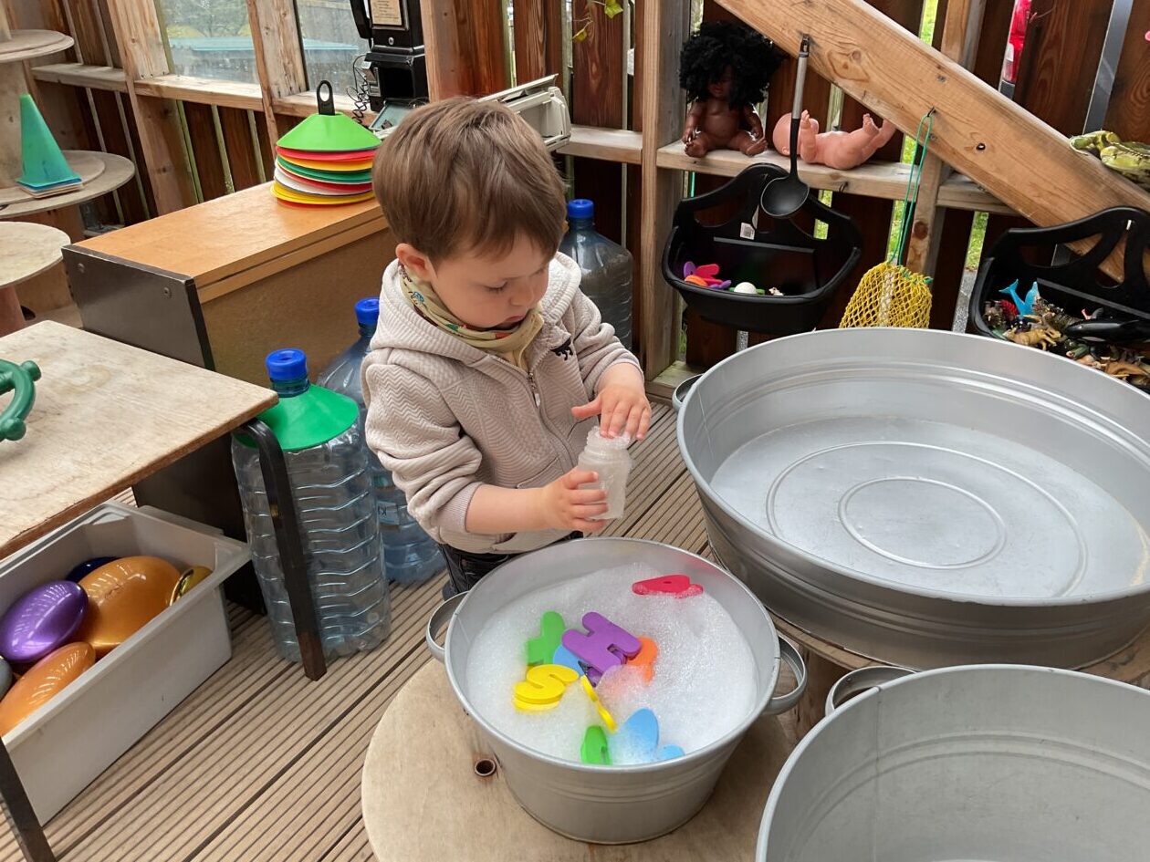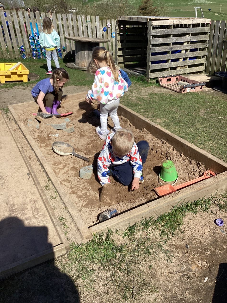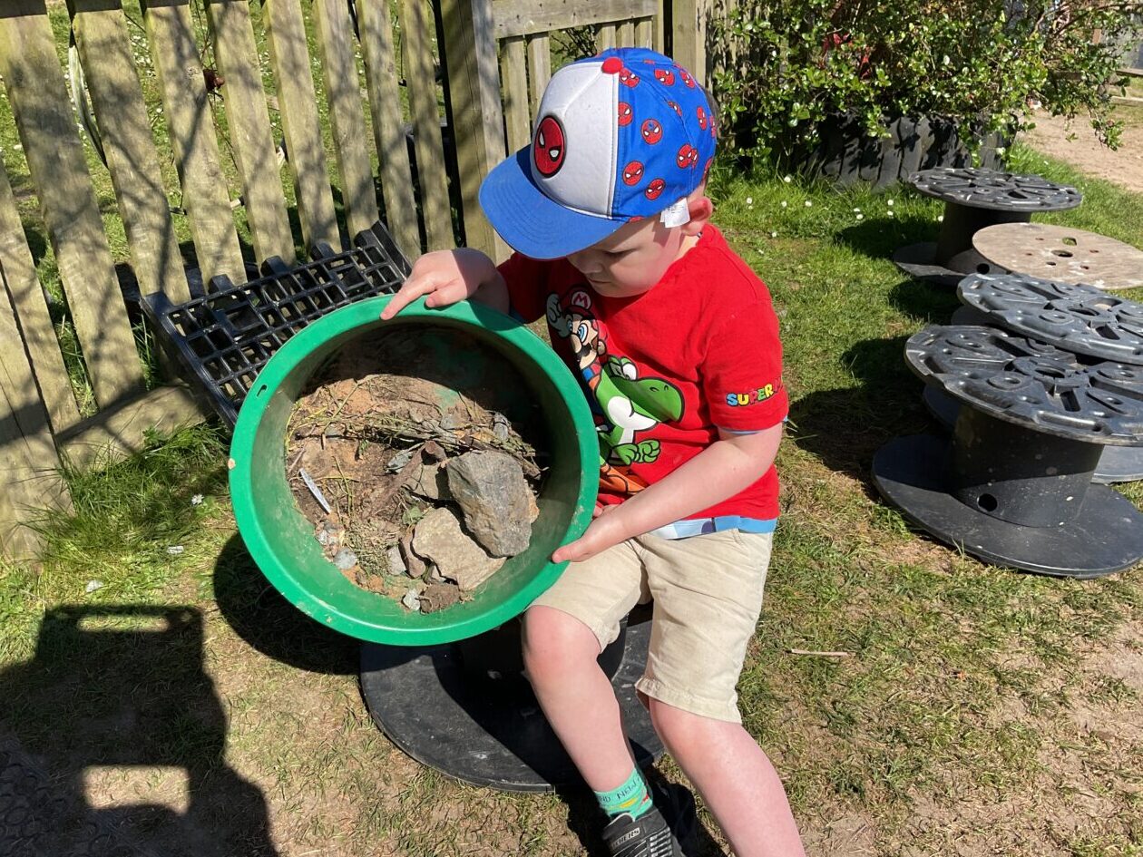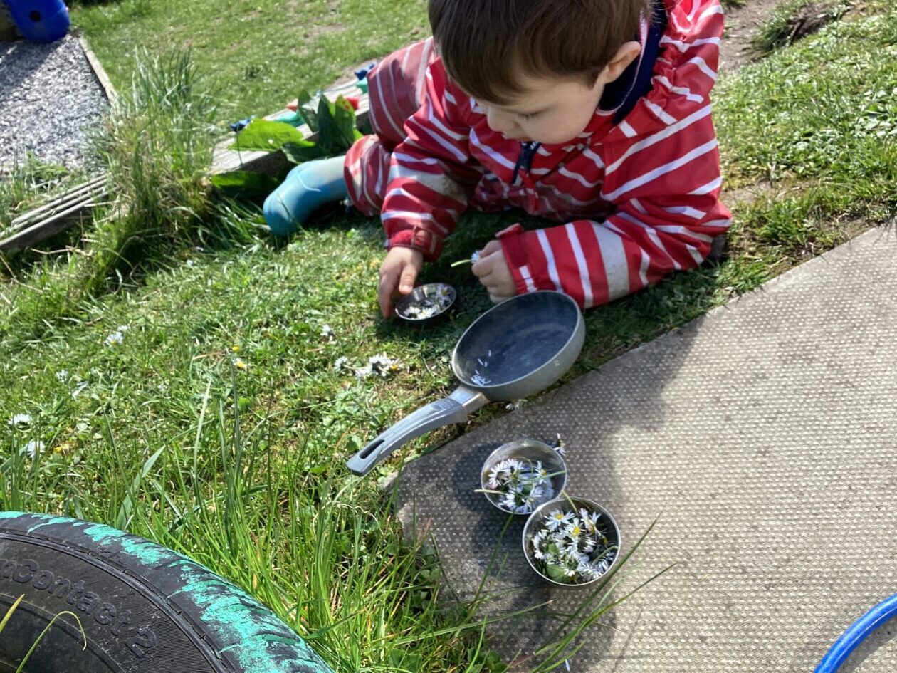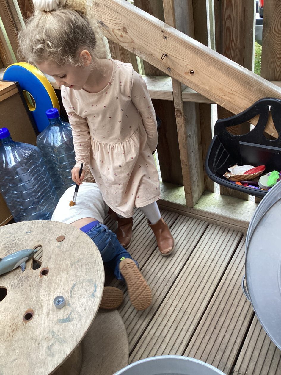 The bairns have been experimenting with different ways to slide down the steep hill in the garden.  They have used cardboard, cushions, carpet tiles and slithery breeks!  We have also seen lots of engagement with water play and managed to get the solar fountain working as the sun made a bit of a reappearance.  We headed to the playpark one afternoon too and the bairns played chasing games, spun on the swings, tried to walk up the slide and got wobbly as jelly on a plate.