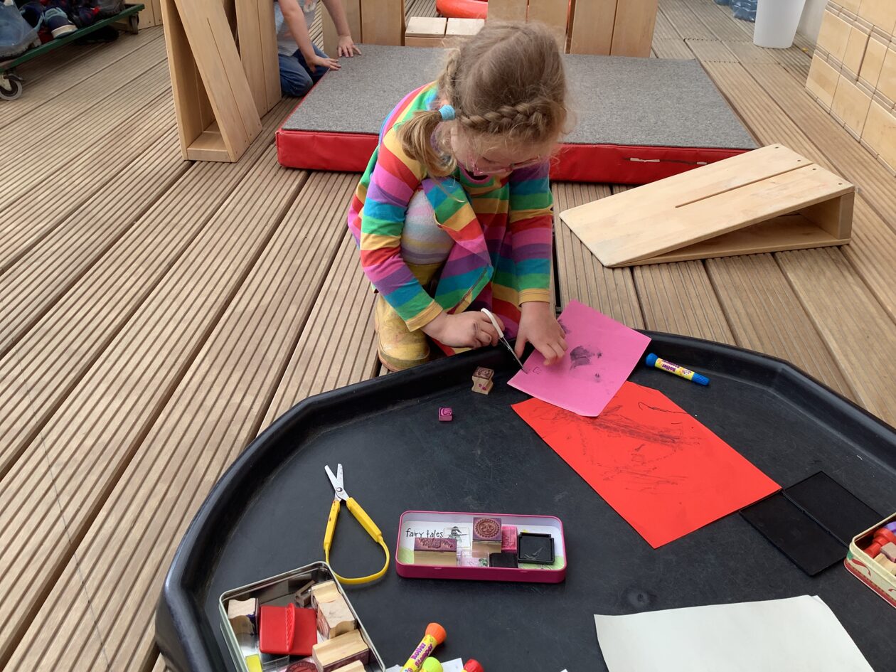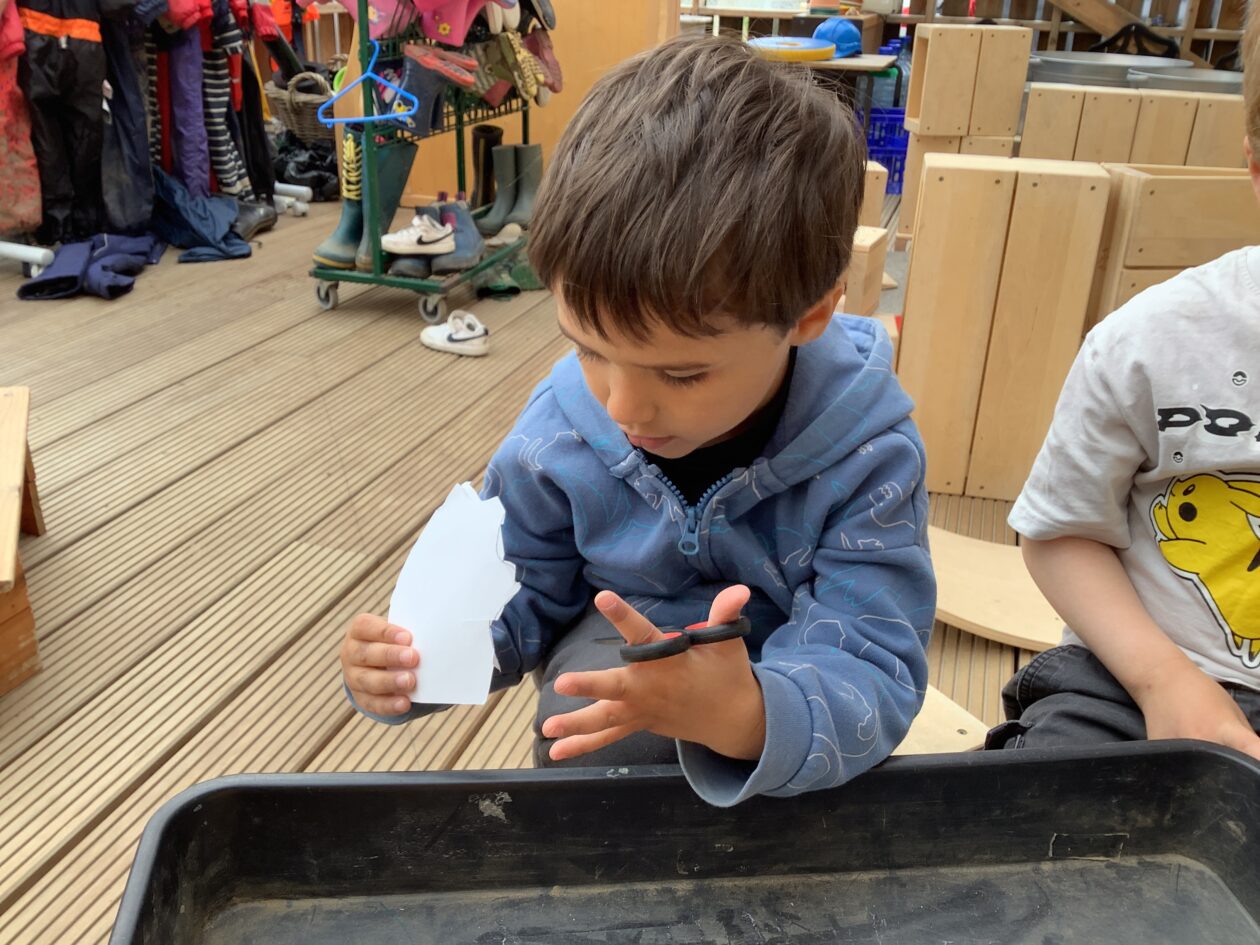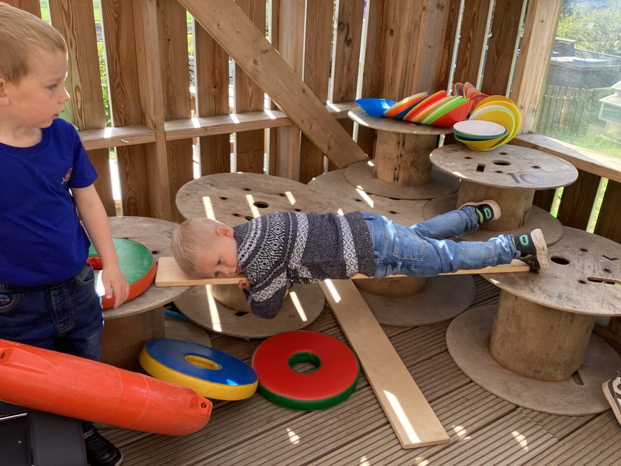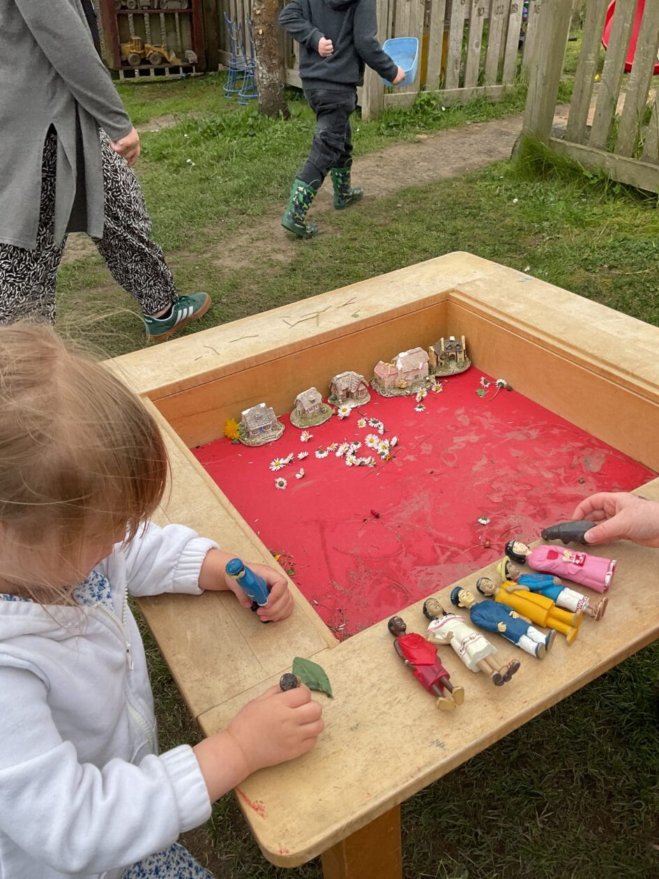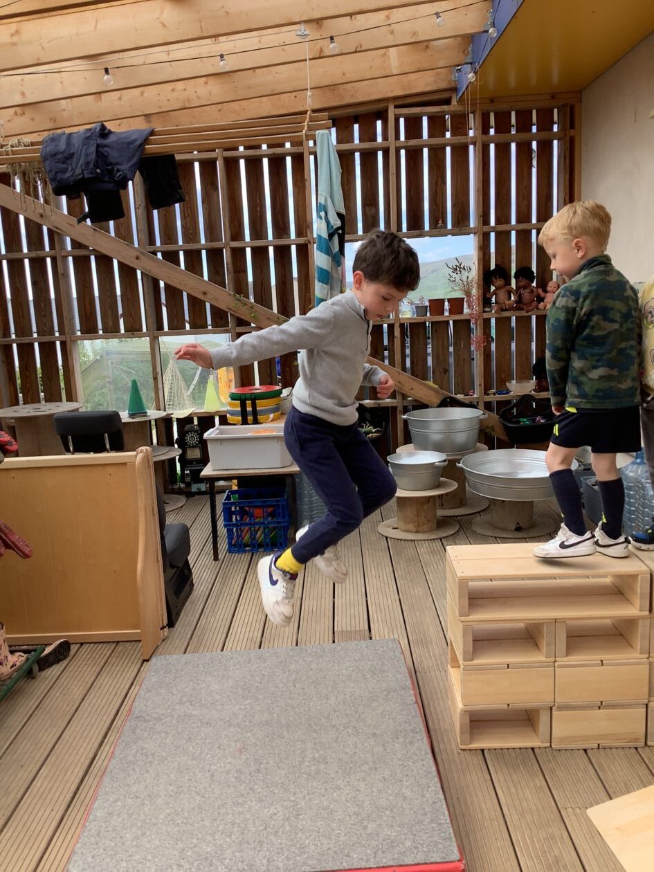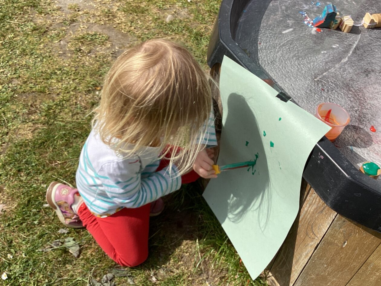 The bairns have been experimenting with different ways to slide down the steep hill in the garden.  They have used cardboard, cushions, carpet tiles and slithery breeks!  We have also seen lots of engagement with water play and managed to get the solar fountain working as the sun made a bit of a reappearance.  We headed to the playpark one afternoon too and the bairns played chasing games, spun on the swings, tried to walk up the slide and got wobbly as jelly on a plate.