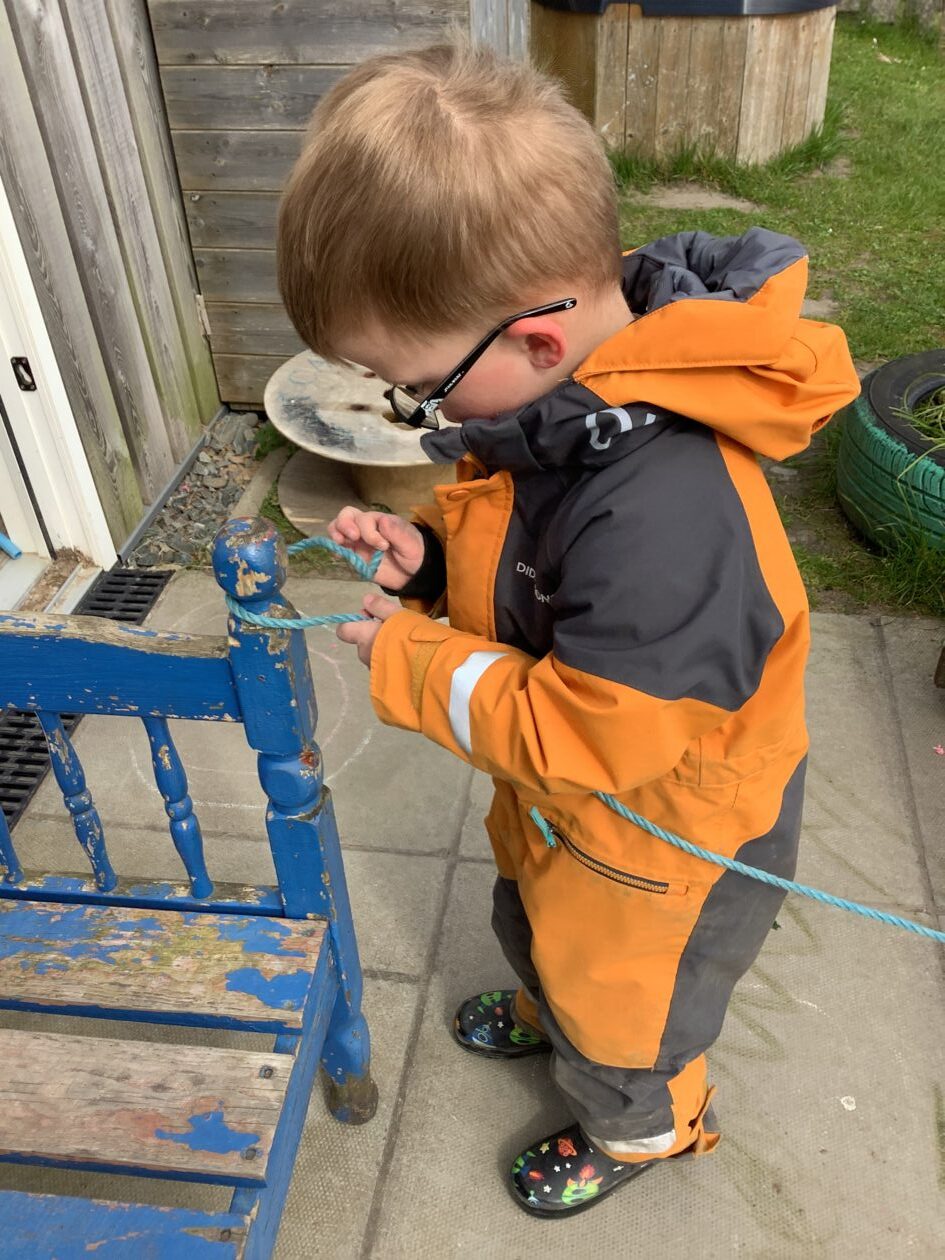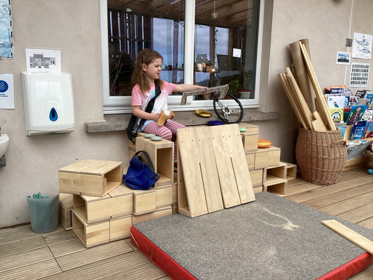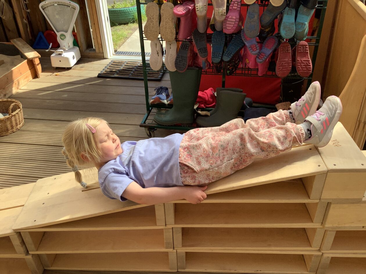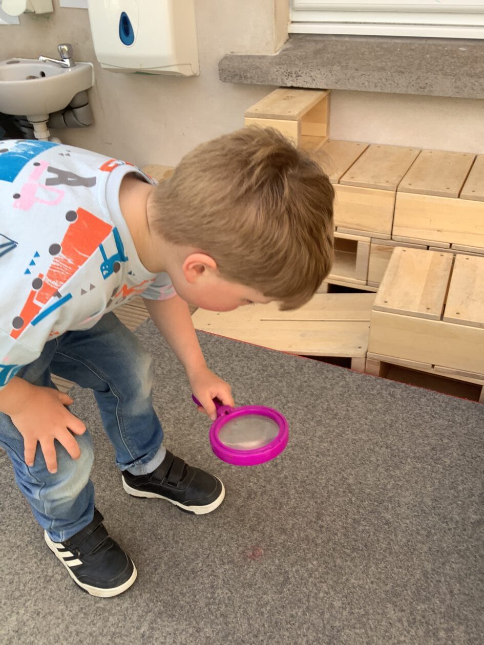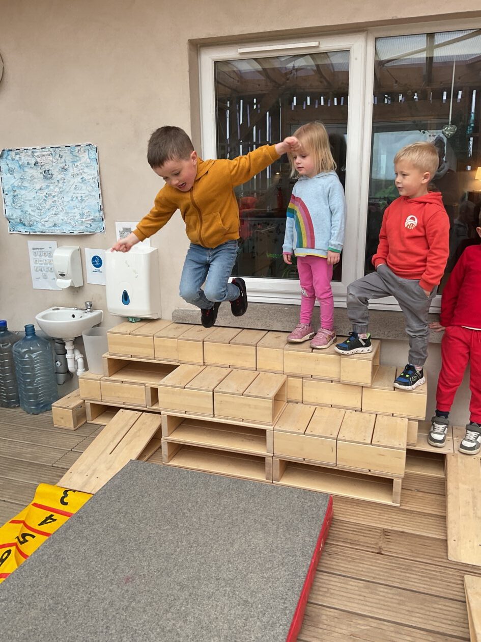 The bairns have been experimenting with different ways to slide down the steep hill in the garden.  They have used cardboard, cushions, carpet tiles and slithery breeks!  We have also seen lots of engagement with water play and managed to get the solar fountain working as the sun made a bit of a reappearance.  We headed to the playpark one afternoon too and the bairns played chasing games, spun on the swings, tried to walk up the slide and got wobbly as jelly on a plate.