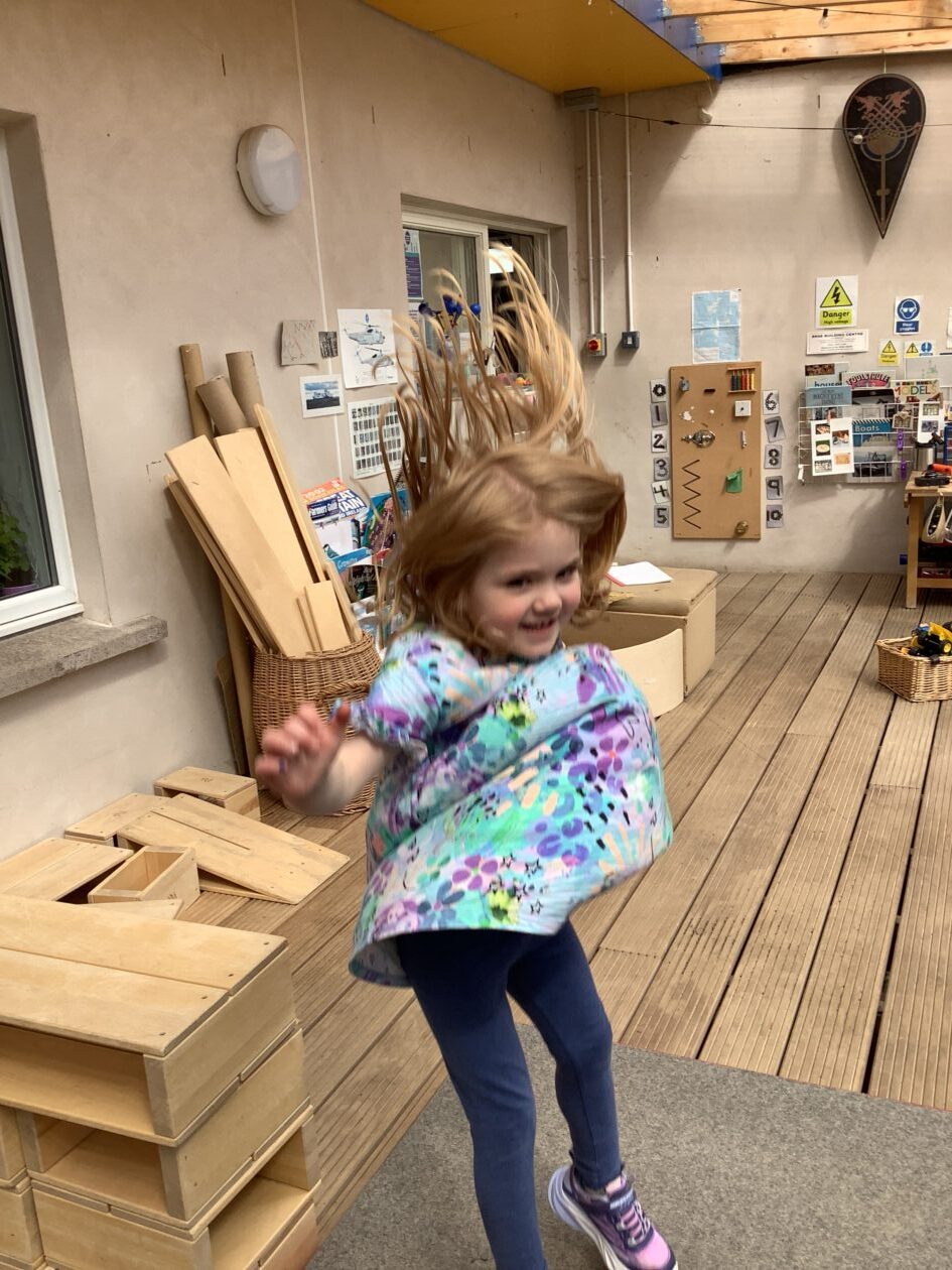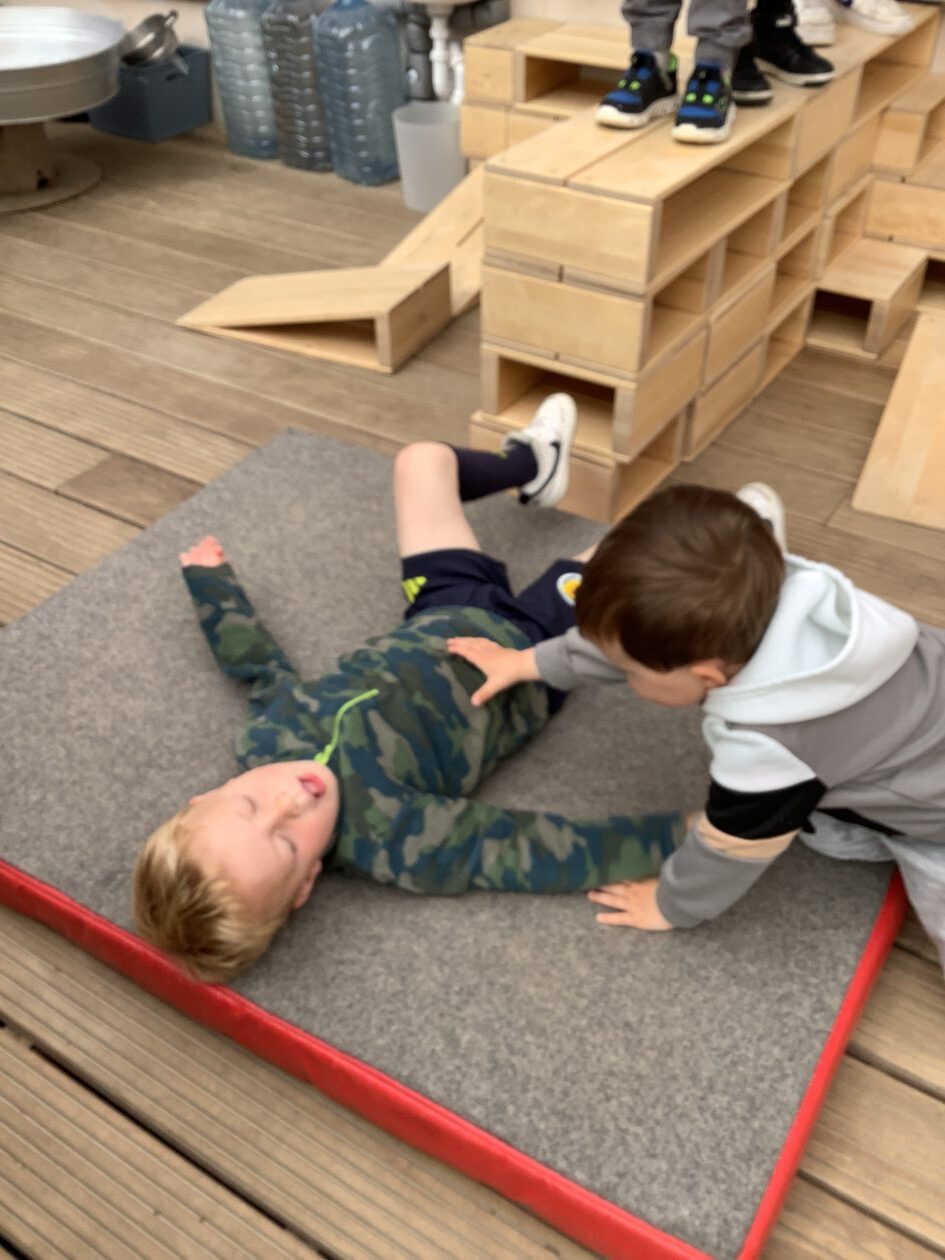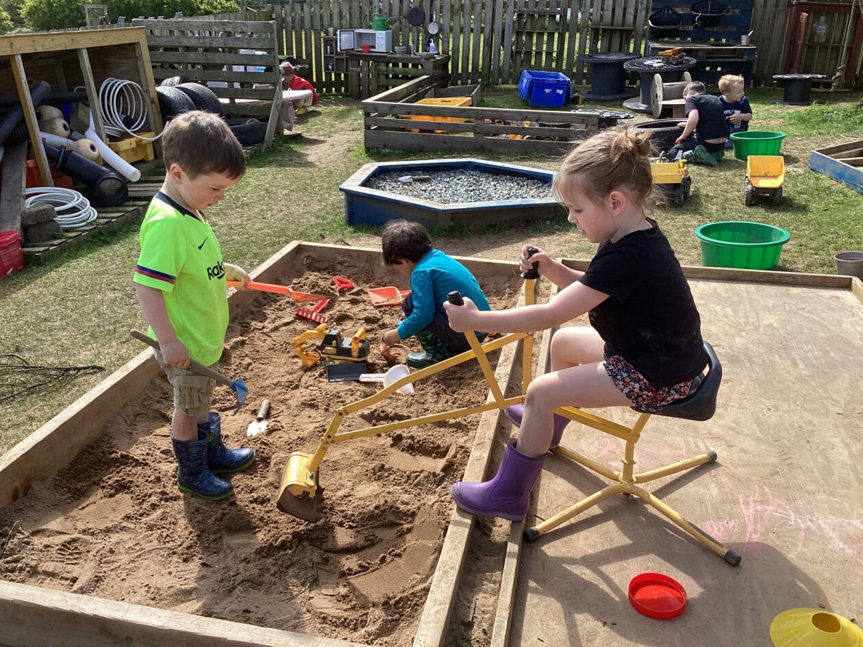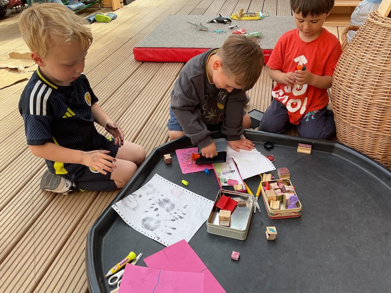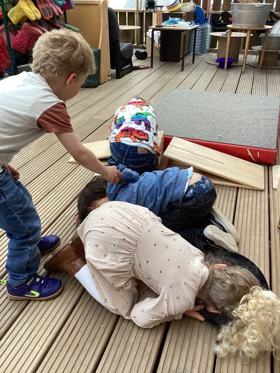 The bairns have been experimenting with different ways to slide down the steep hill in the garden.  They have used cardboard, cushions, carpet tiles and slithery breeks!  We have also seen lots of engagement with water play and managed to get the solar fountain working as the sun made a bit of a reappearance.  We headed to the playpark one afternoon too and the bairns played chasing games, spun on the swings, tried to walk up the slide and got wobbly as jelly on a plate.
