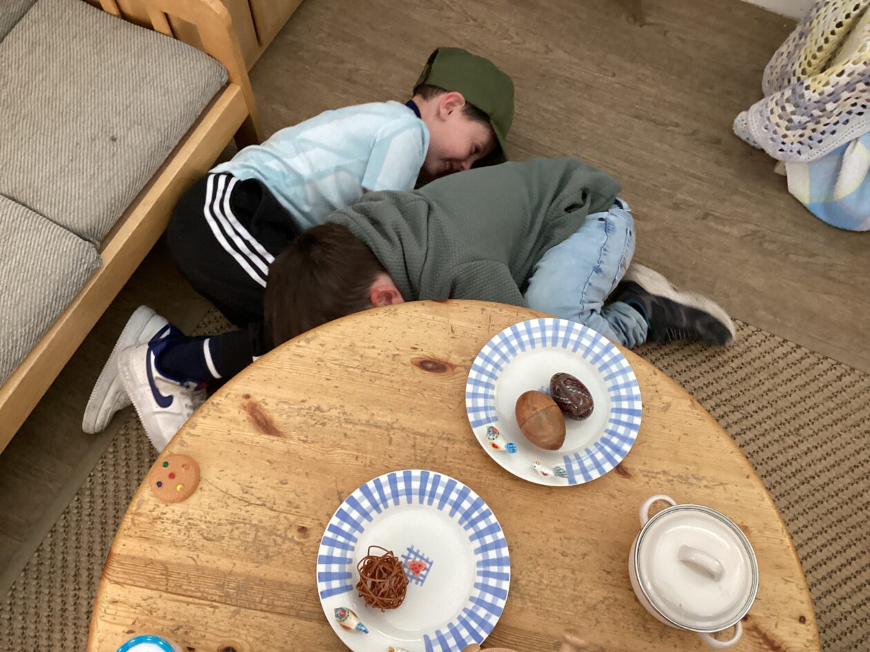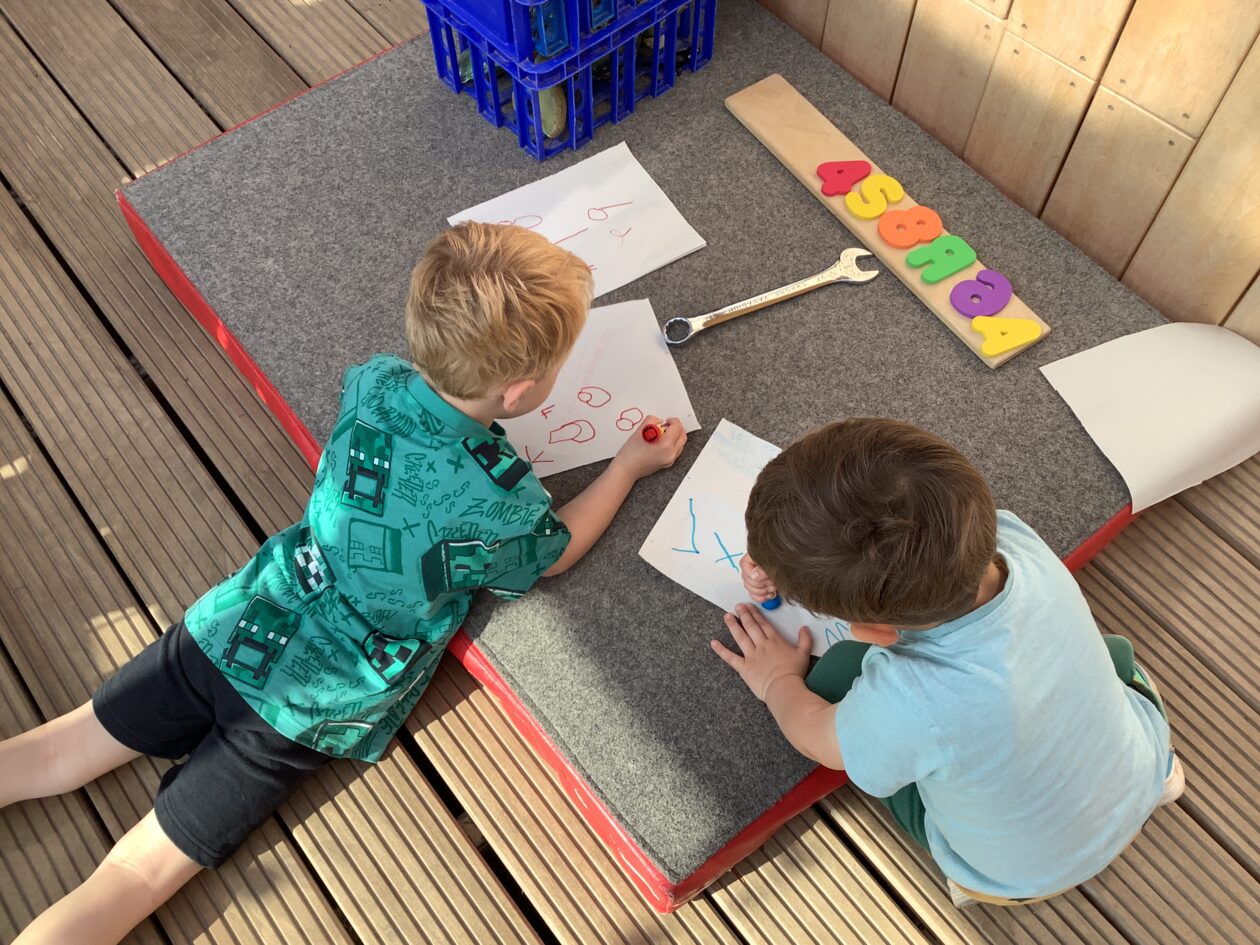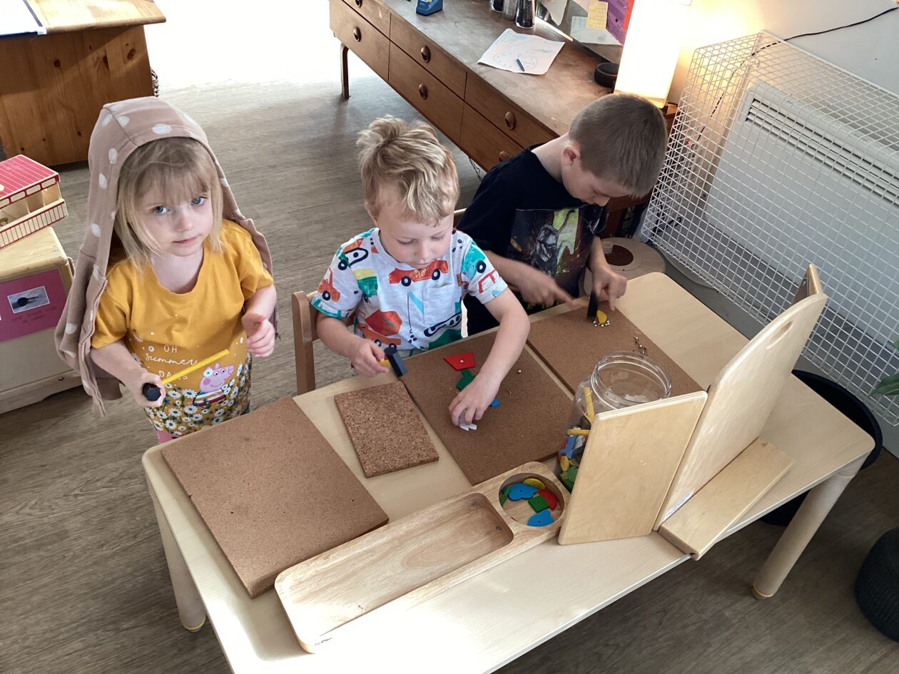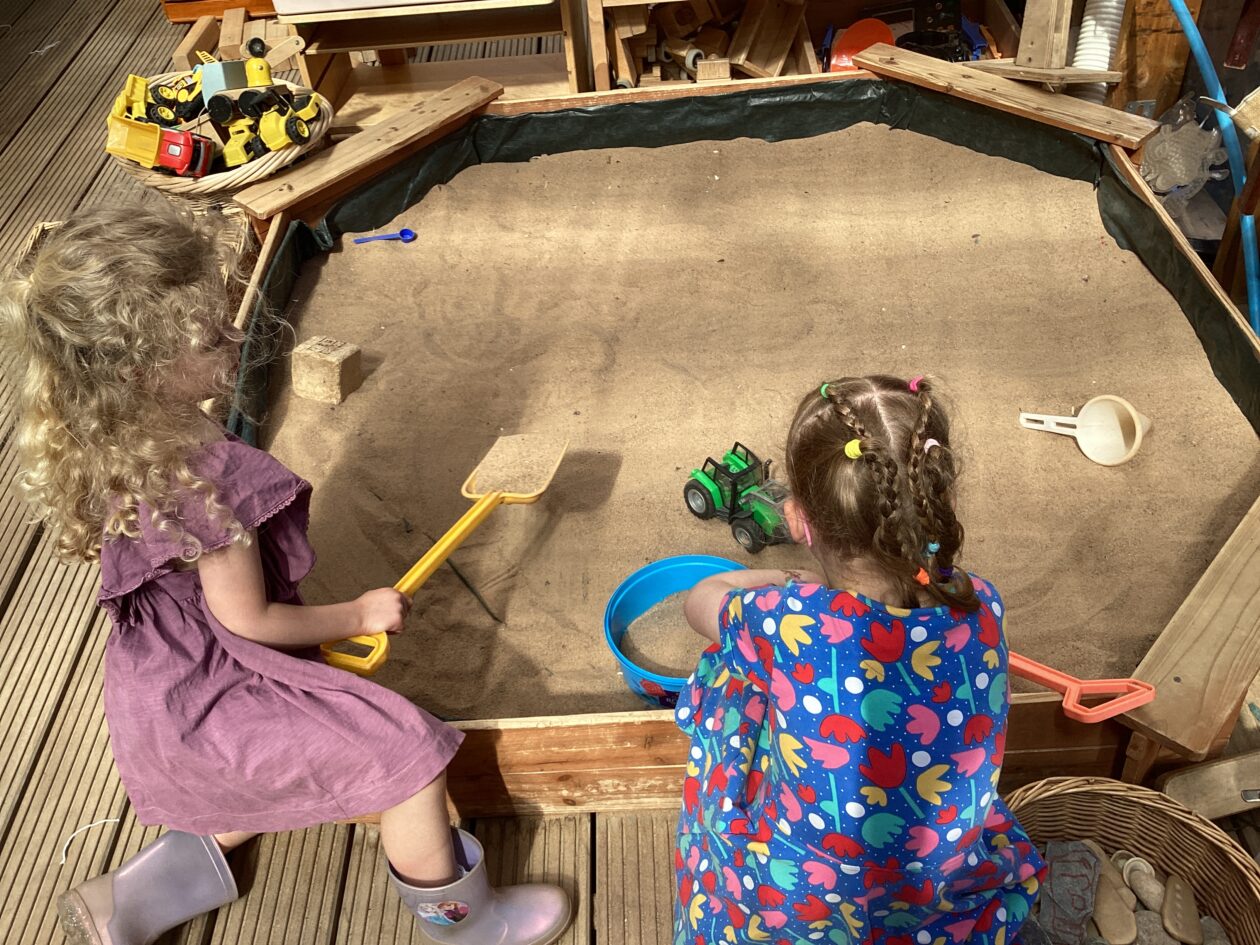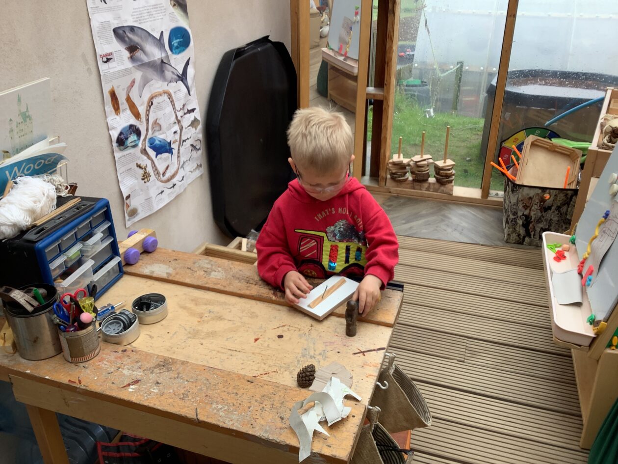 The bairns have been experimenting with different ways to slide down the steep hill in the garden.  They have used cardboard, cushions, carpet tiles and slithery breeks!  We have also seen lots of engagement with water play and managed to get the solar fountain working as the sun made a bit of a reappearance.  We headed to the playpark one afternoon too and the bairns played chasing games, spun on the swings, tried to walk up the slide and got wobbly as jelly on a plate.