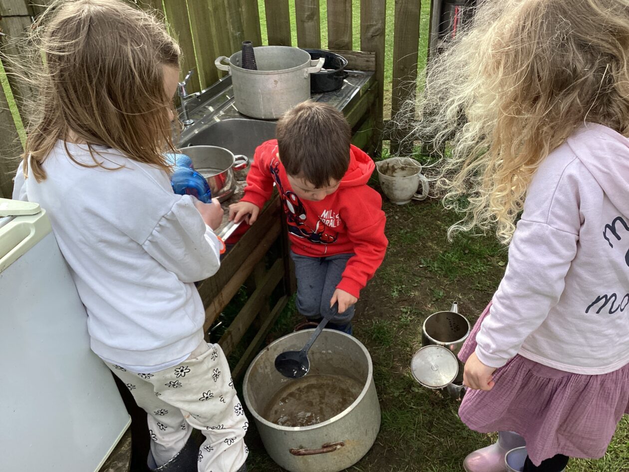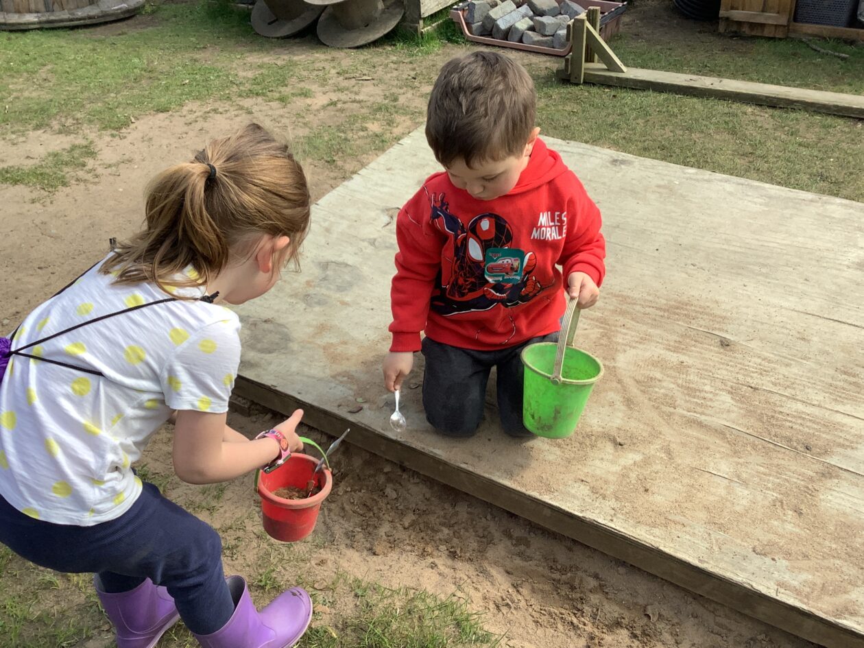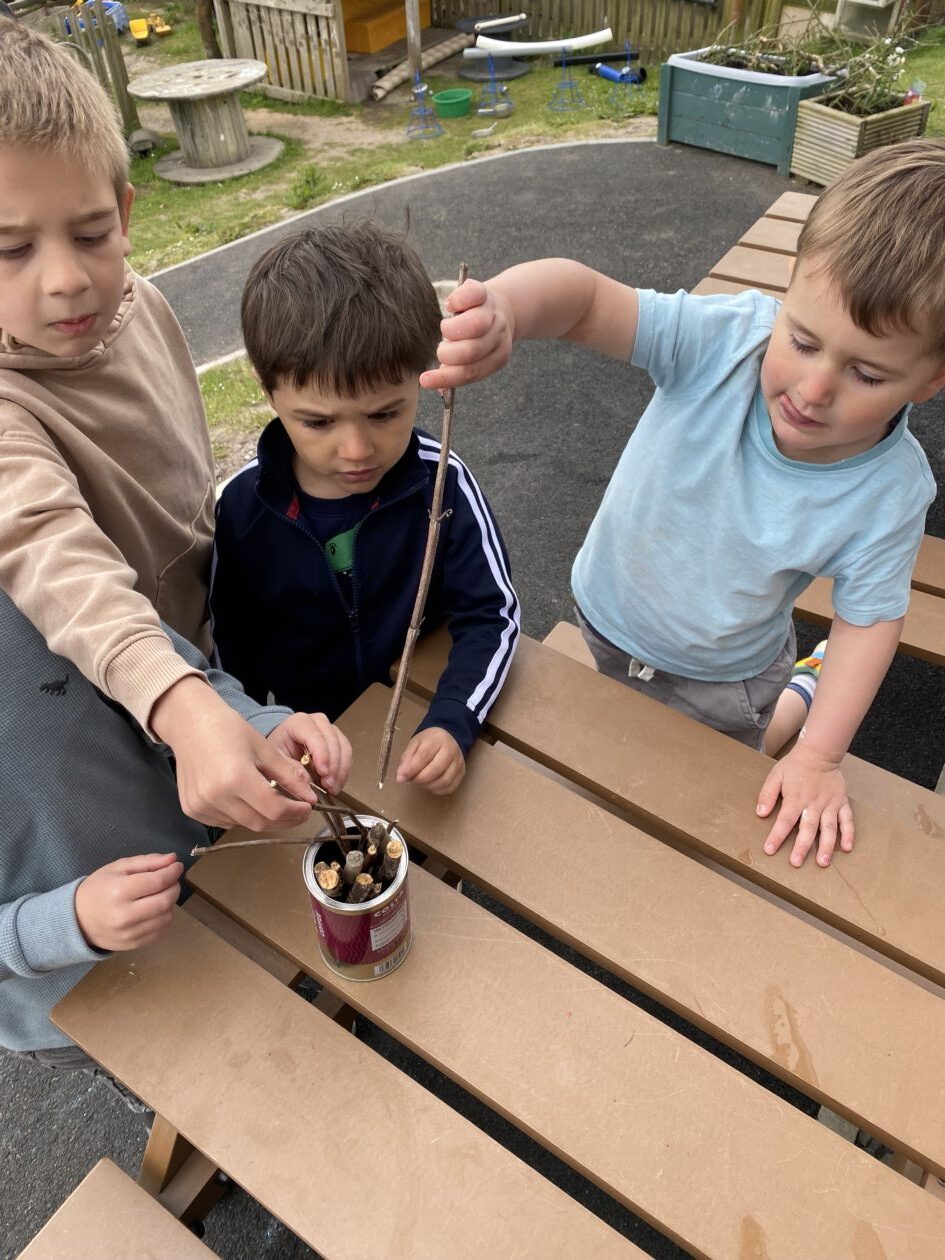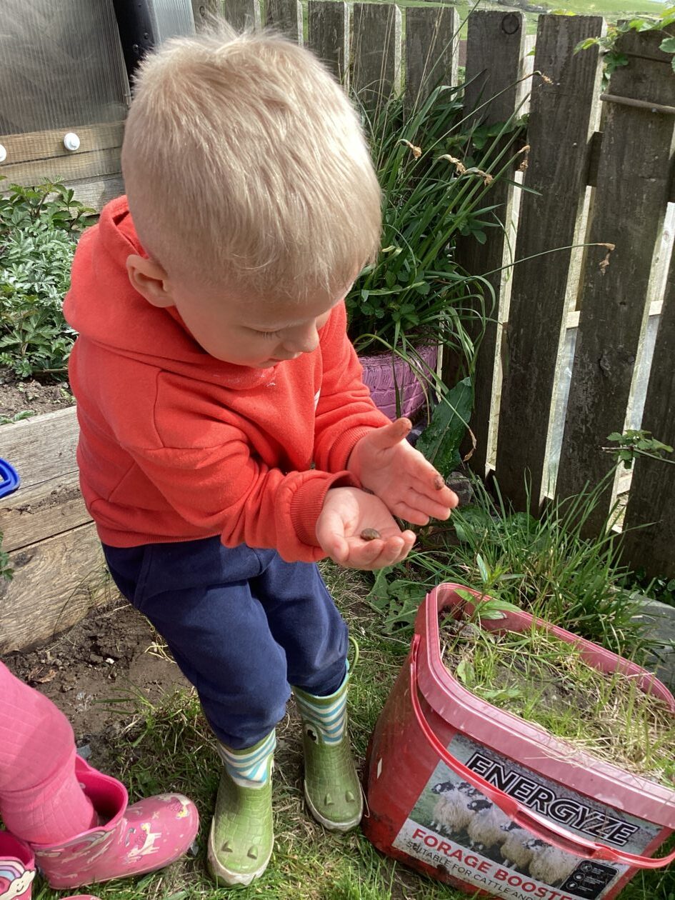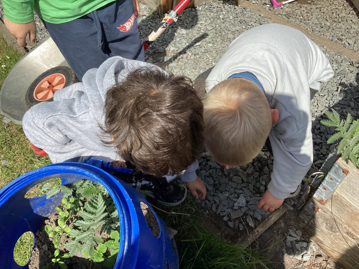 We have made the most of the fine weather again this week.  The bairns have planted brussel sprouts, used trowels and forks to dig in the dried up muddy puddle discovering many treasures, built dens, had band practice, created a potion station and a bug hotel.