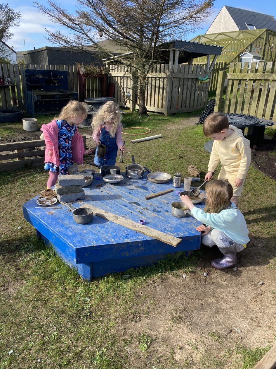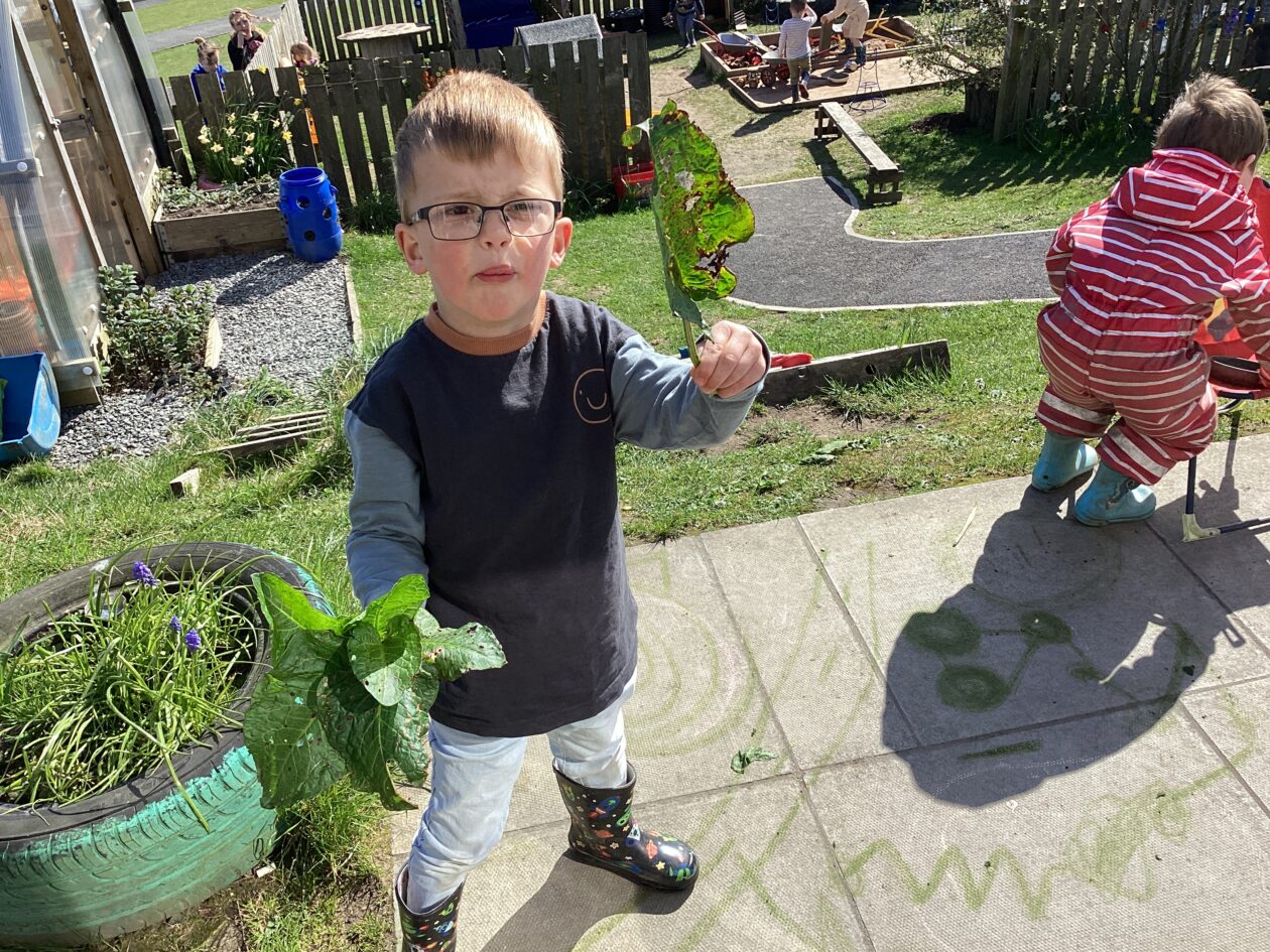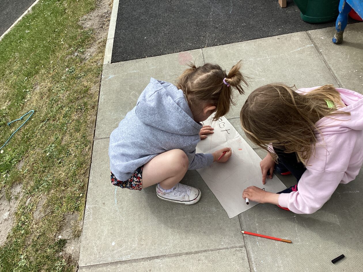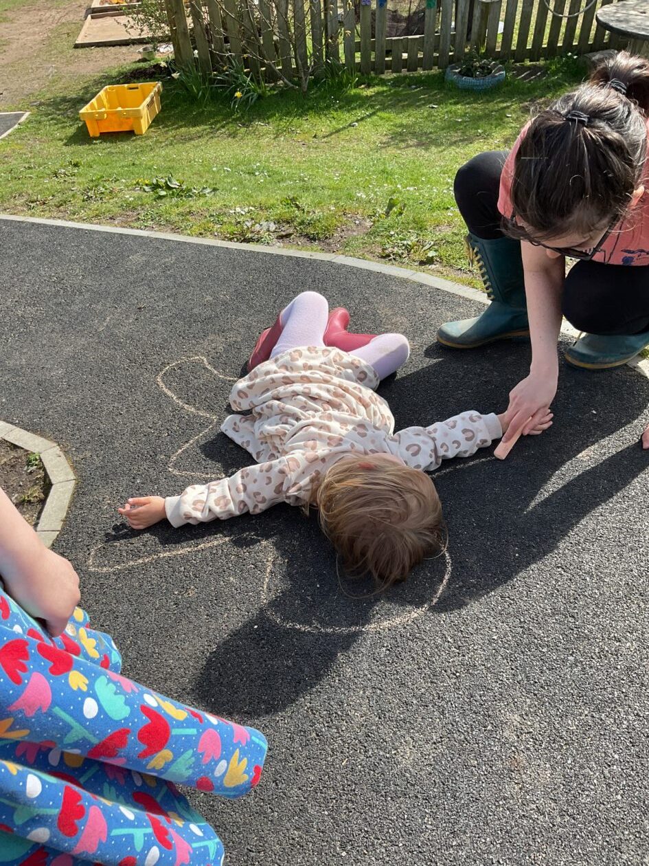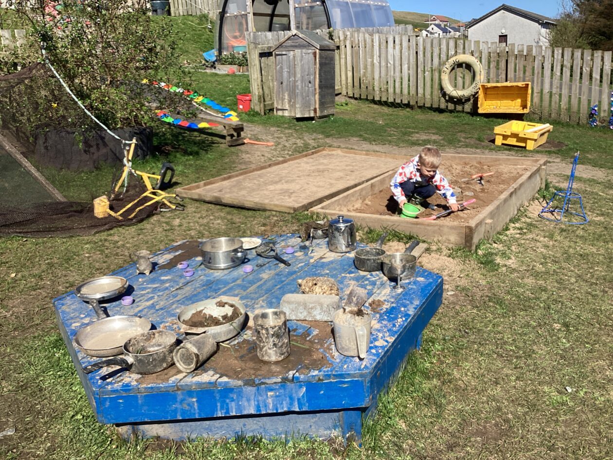The bairns have been revamping the mud kitchen by adding a tablecloth and tidying up the dishes.  Then the bairns had a tea party.  There has been lots of planting this week, including onions and geraniums.  The bairns have also used chalk to mark-make on the path by drawing around themselves, making treasures maps and drawing pictures.