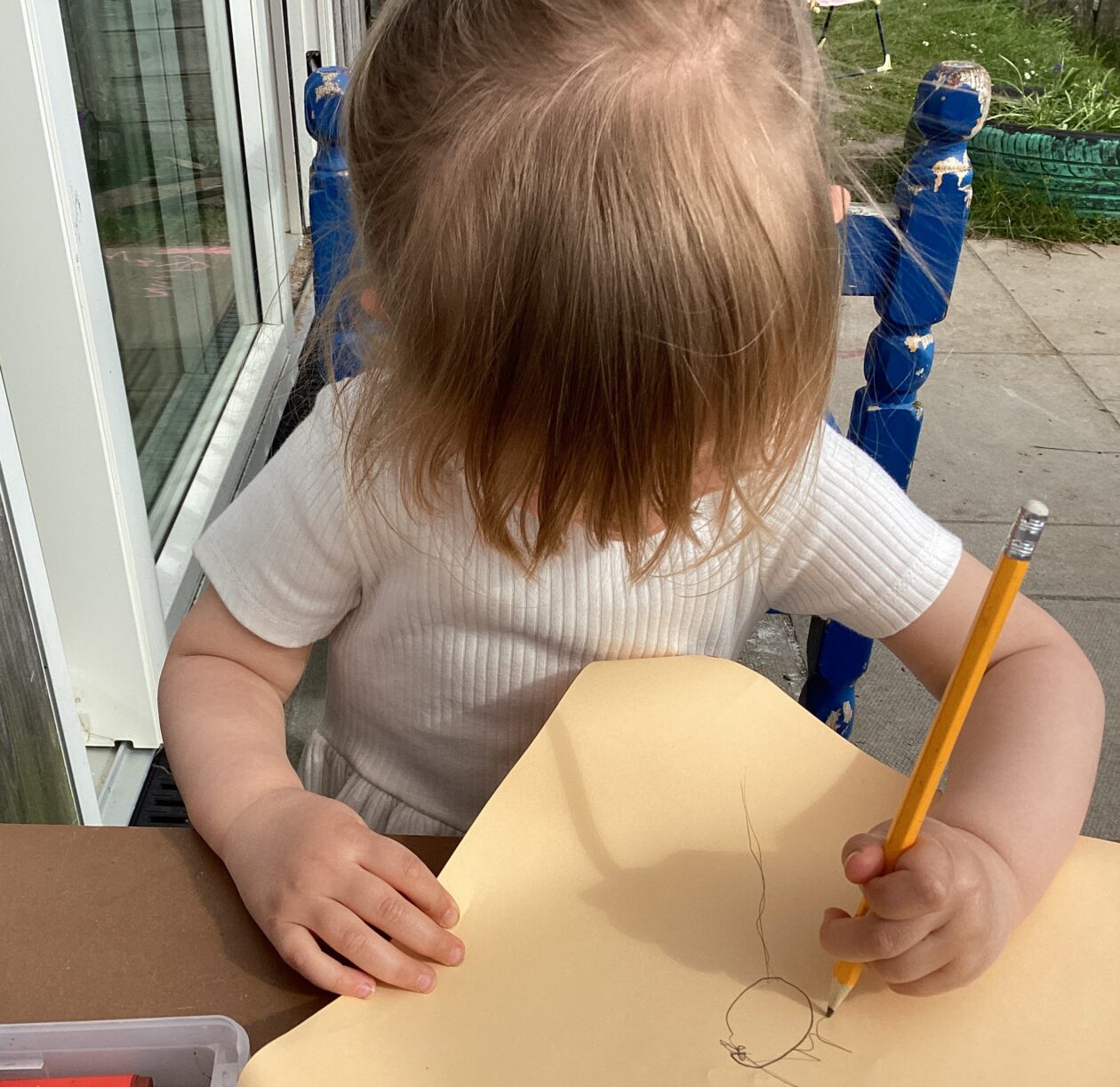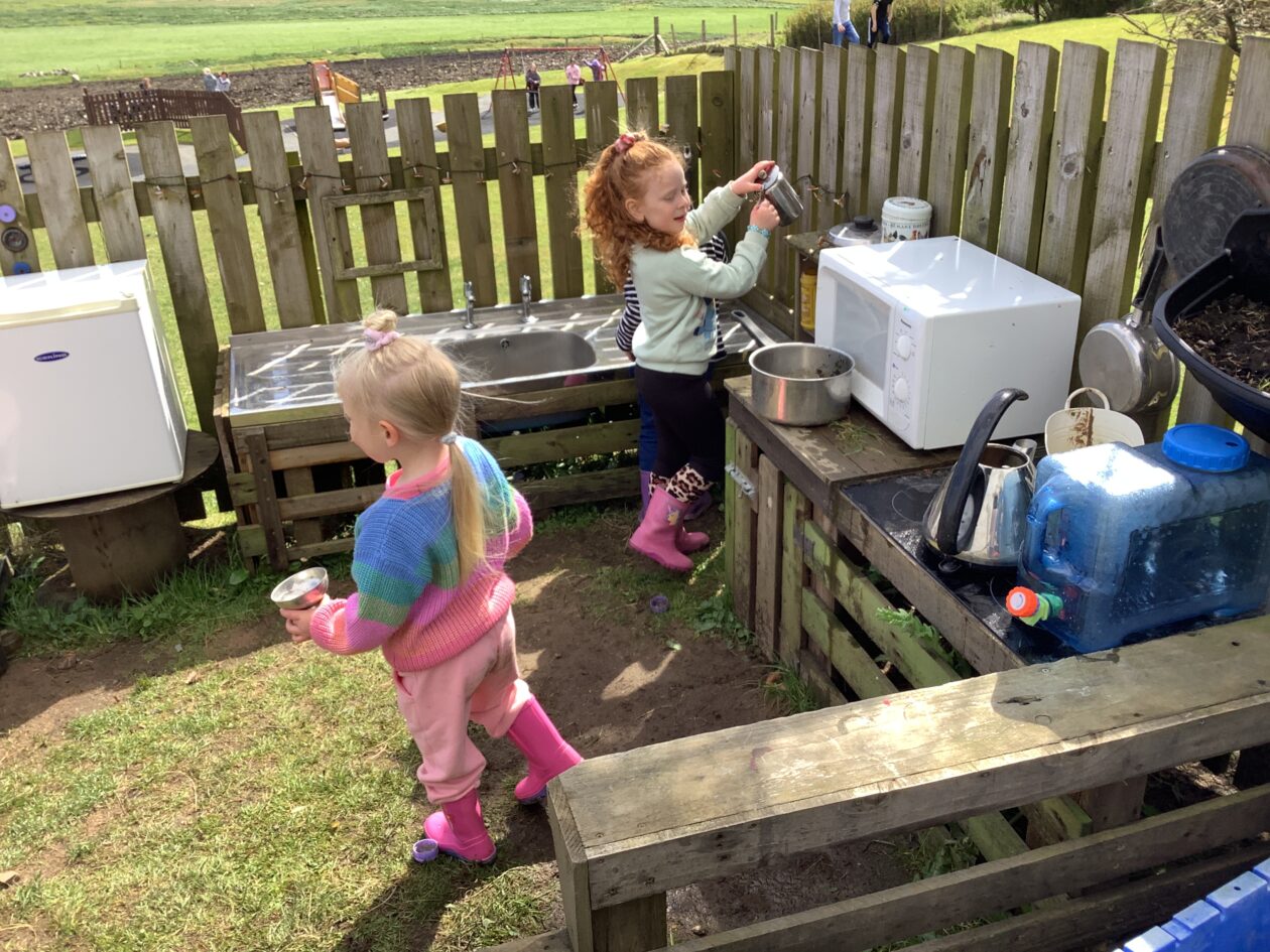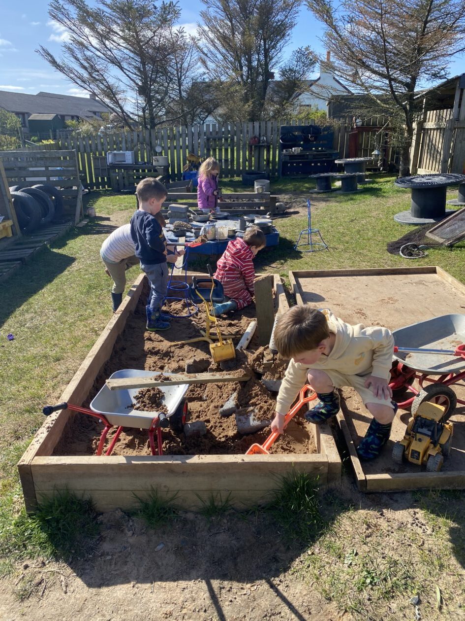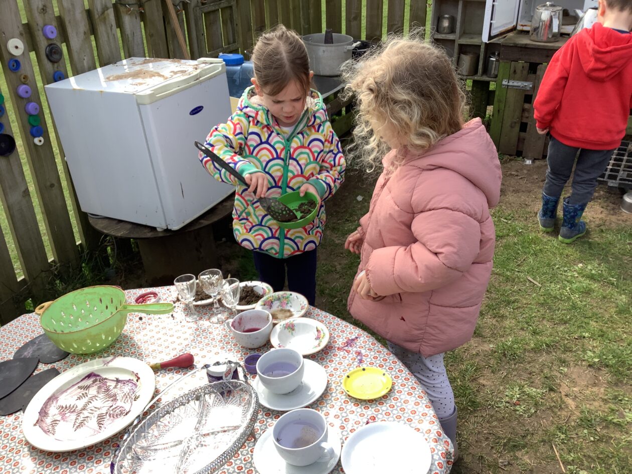 The bairns have been revamping the mud kitchen by adding a tablecloth and tidying up the dishes.  Then the bairns had a tea party.  There has been lots of planting this week, including onions and geraniums.  The bairns have also used chalk to mark-make on the path by drawing around themselves, making treasures maps and drawing pictures.