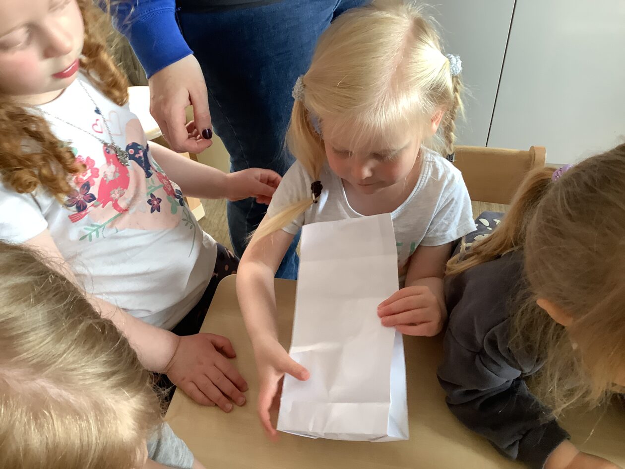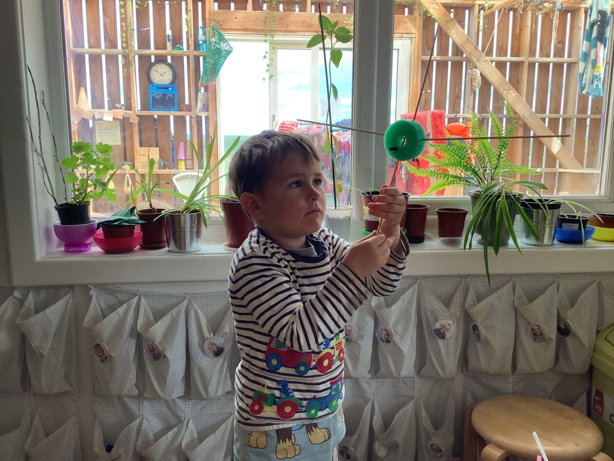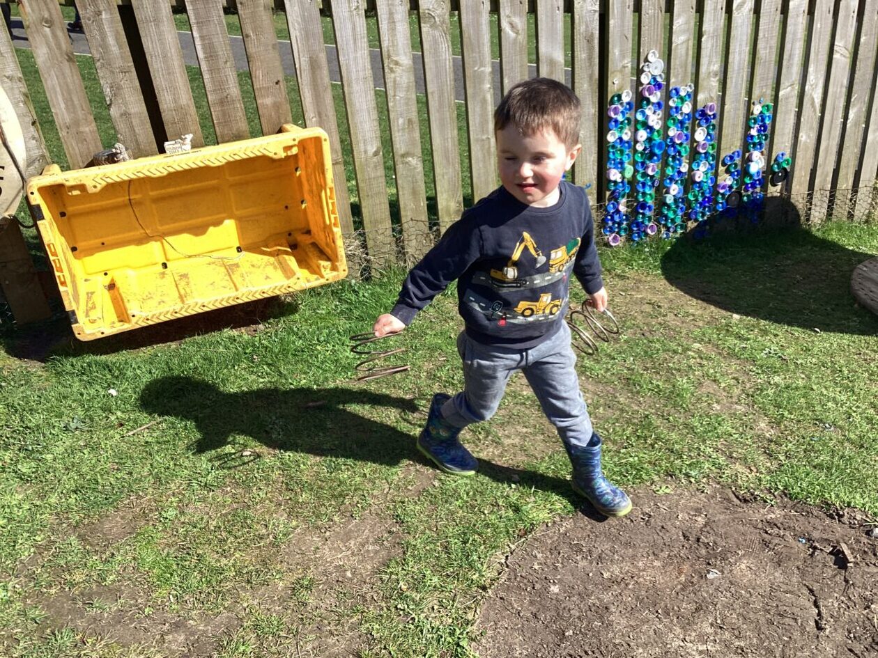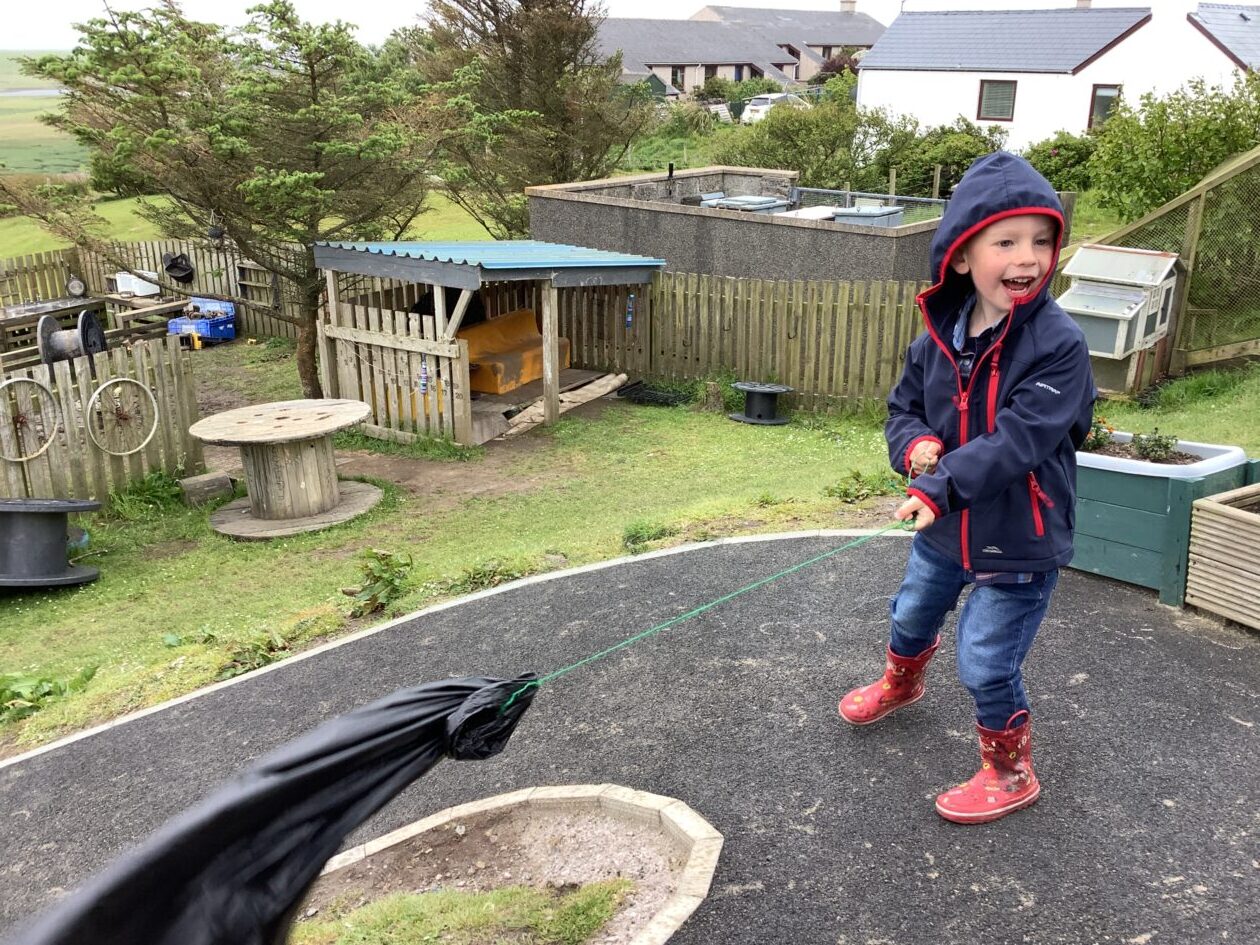 Wind, glorious wind!  The bairns explored the wind using a makeshift kite made from a black bag and a piece of string.  The bairns tried holding the kite low to the ground and then high up to see the changes.  They also ran fast around the garden.  “It was flapping!”