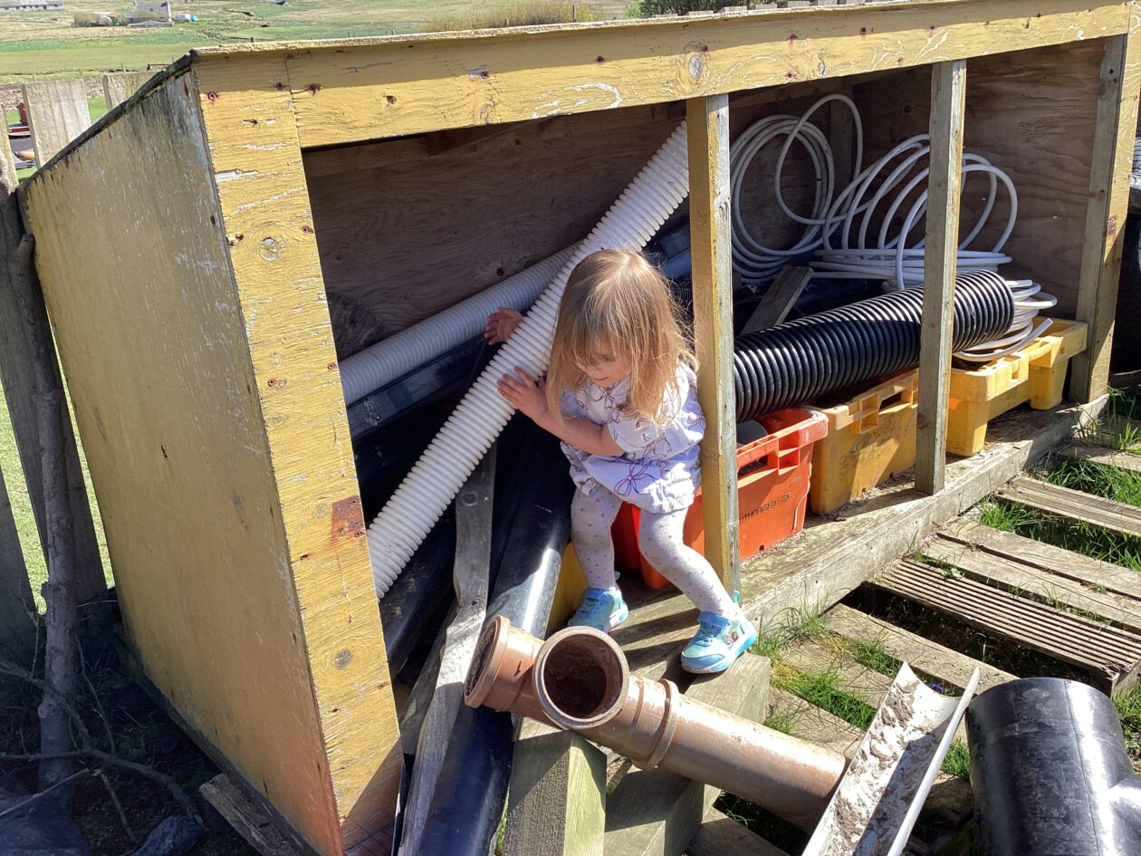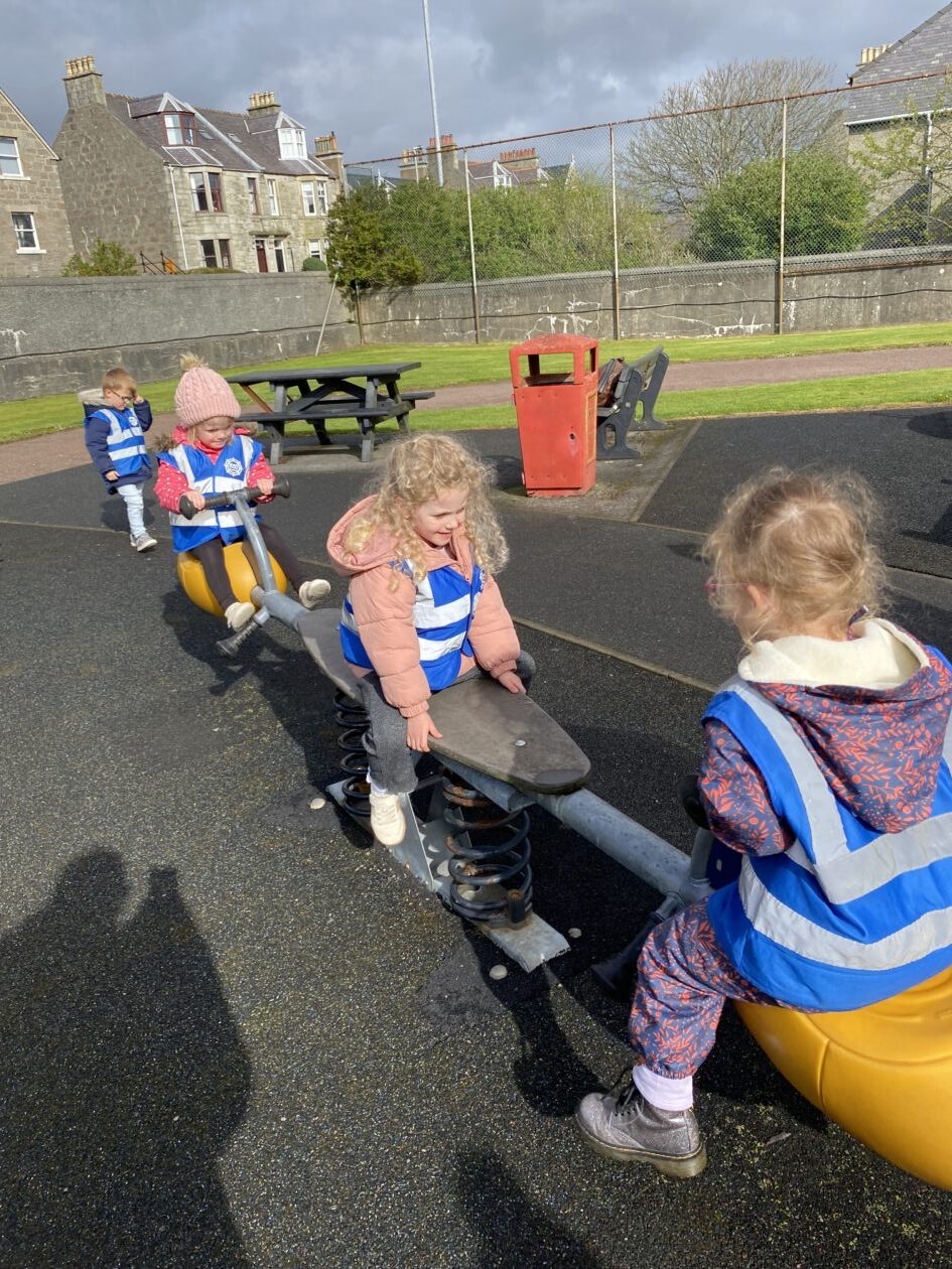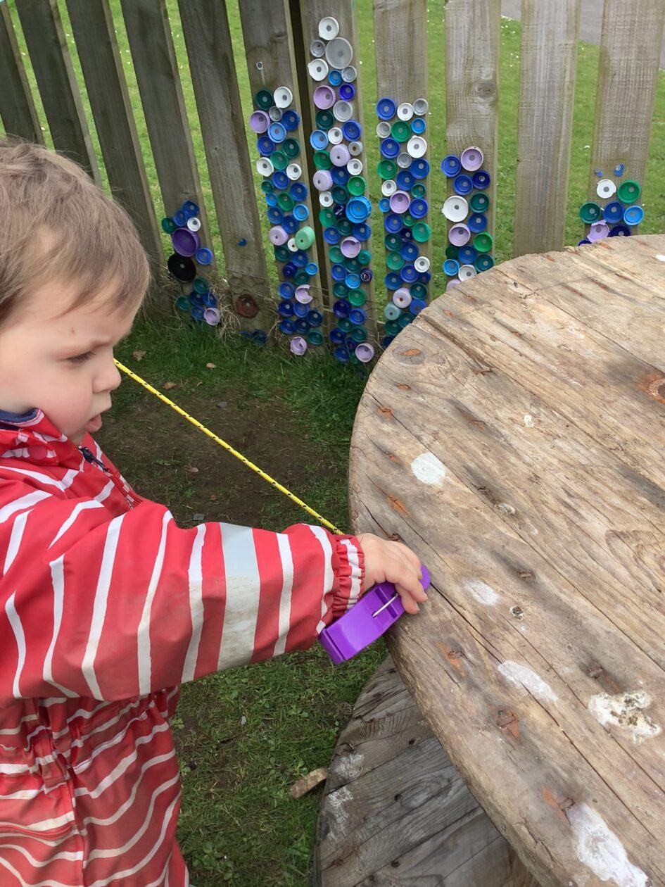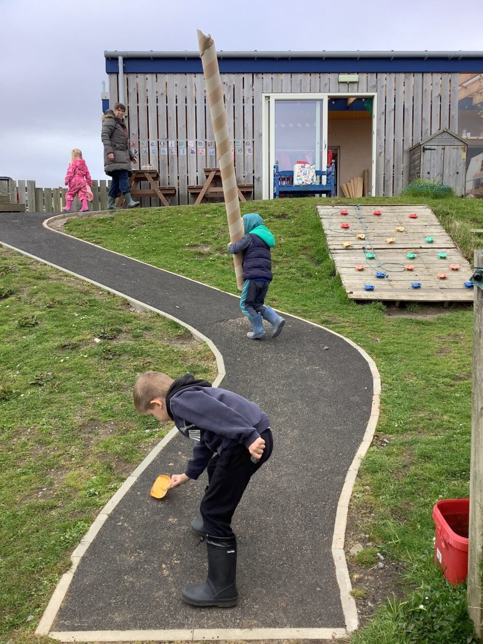 With all the new nursery babies on the way, the bairns have been interested in caring for their own babies.  We set up a baby bathing station outside with jugs for rinsing and towels for drying off.  The bairns also made a very impressive obstacle course on the path.  They had to slow down to climb over the cable drums due to the steep slope.  We took a trip to the playpark and the bairns took turns on the new nursery scooters.  We spoke about how to stay safe while scooting. “You have to wear a helmet or you might fall off and bump your head.”