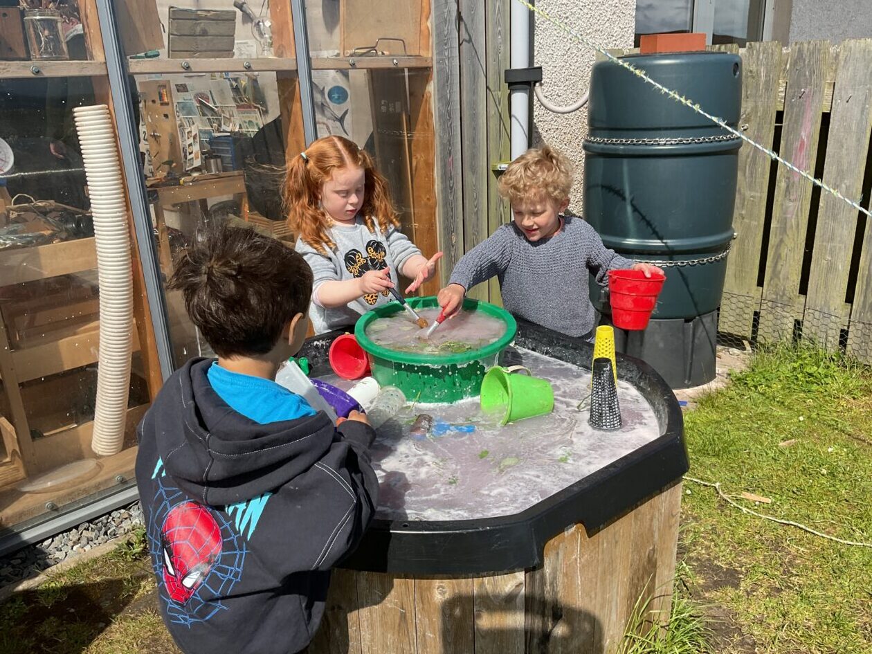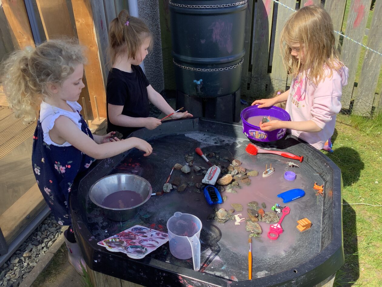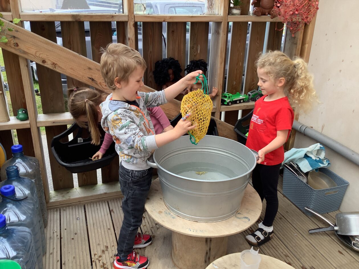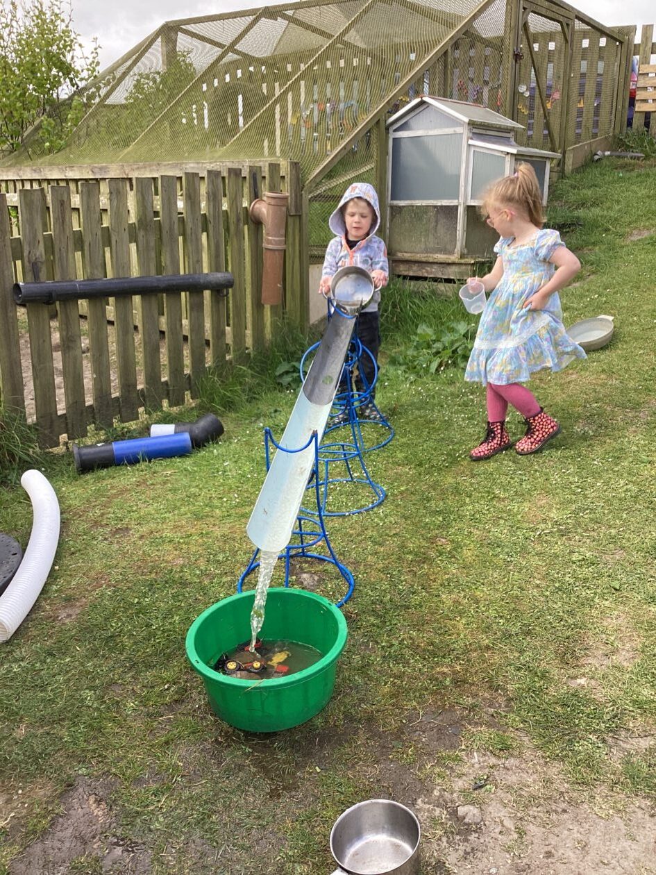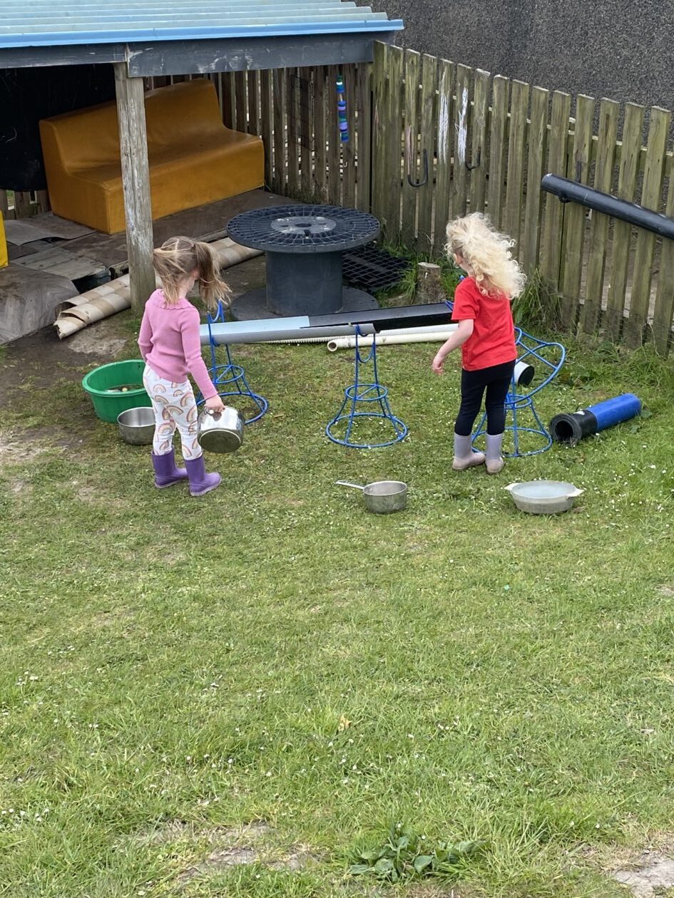 Our outdoor play has focused on water play, bug hunting and singing about the rain.  The bairns have been engaged in sensory play with water, paint and shaving foam.  Trevor put up our new basketball hoop and we’ve planted neeps.