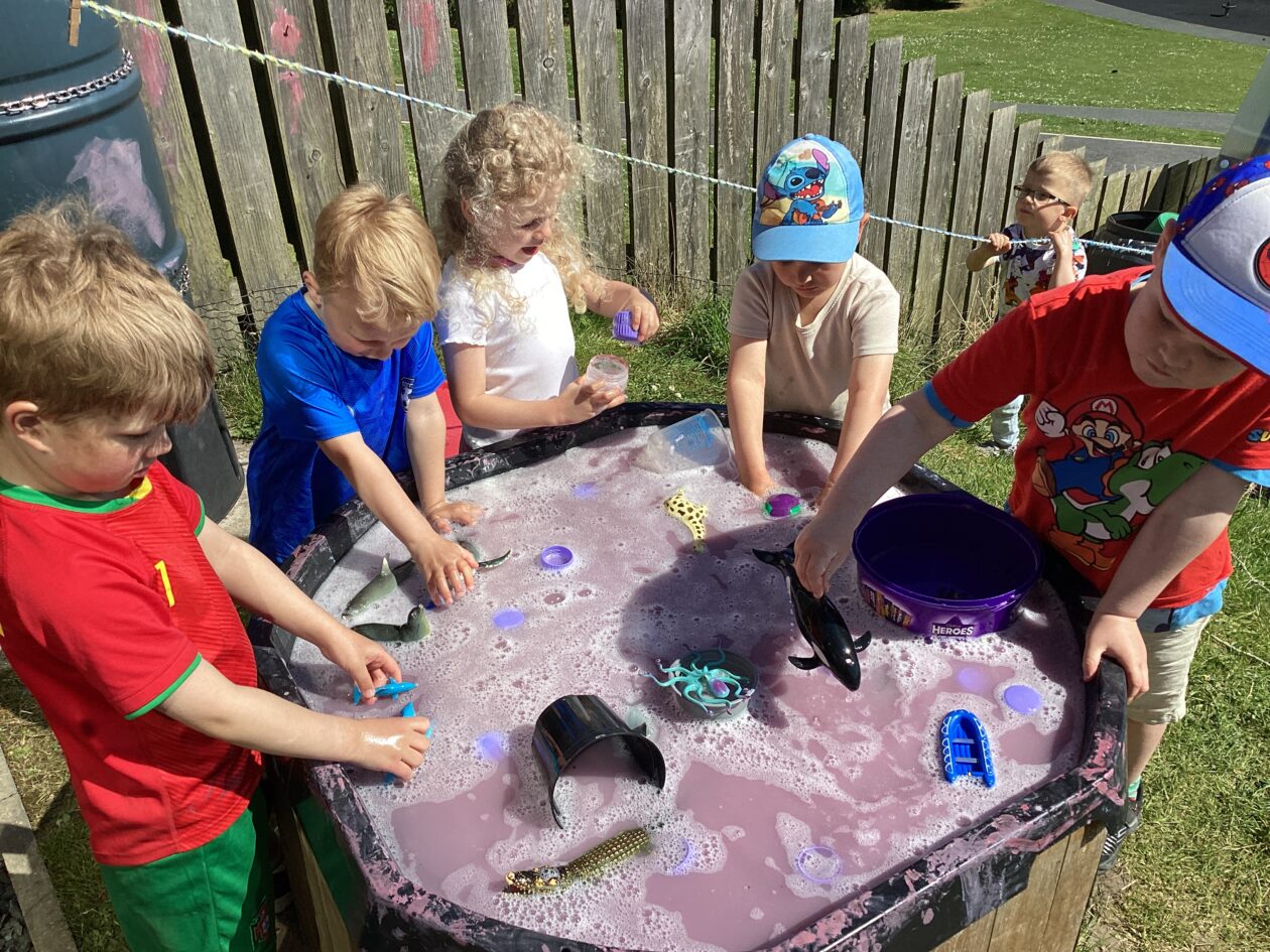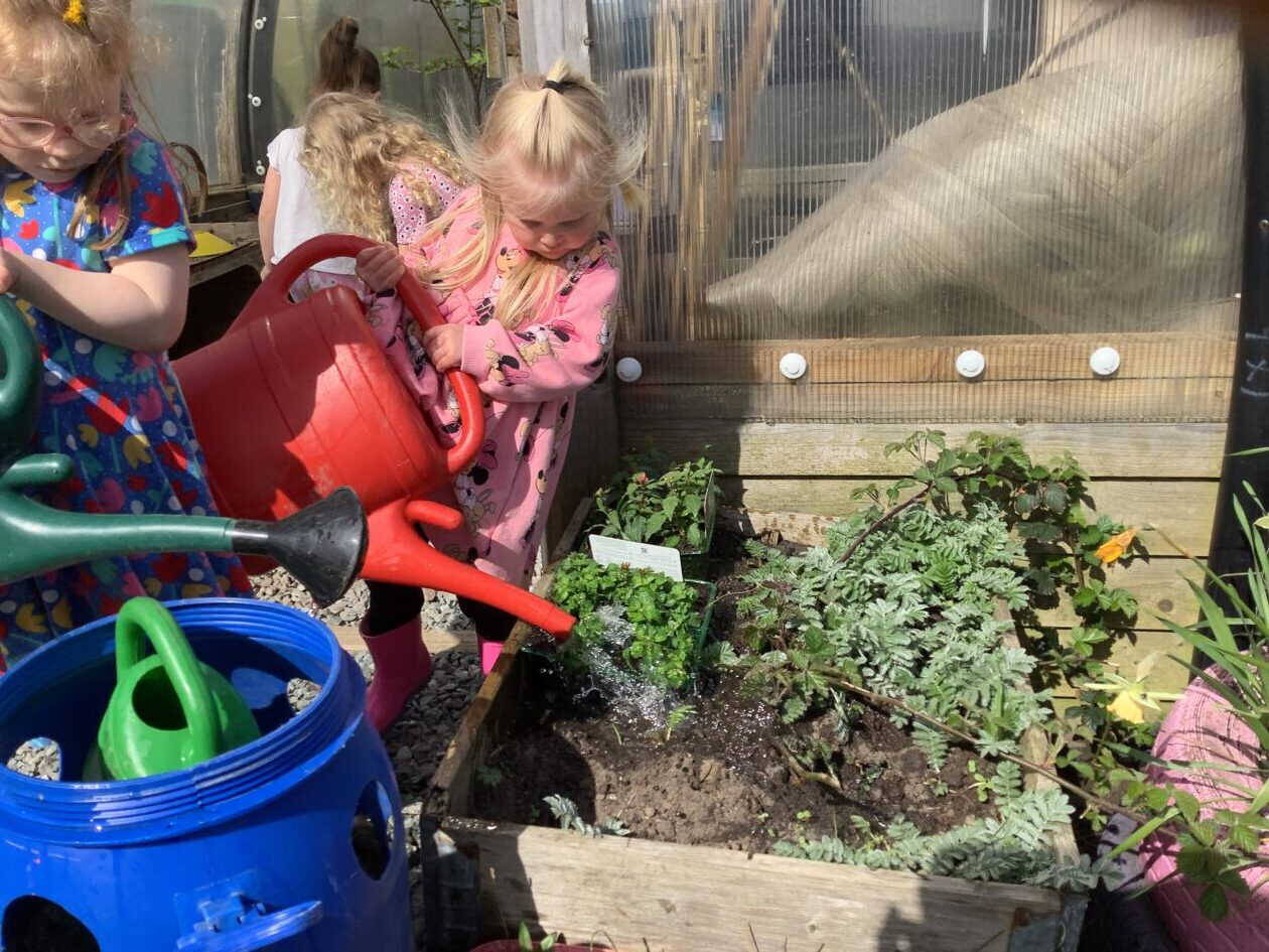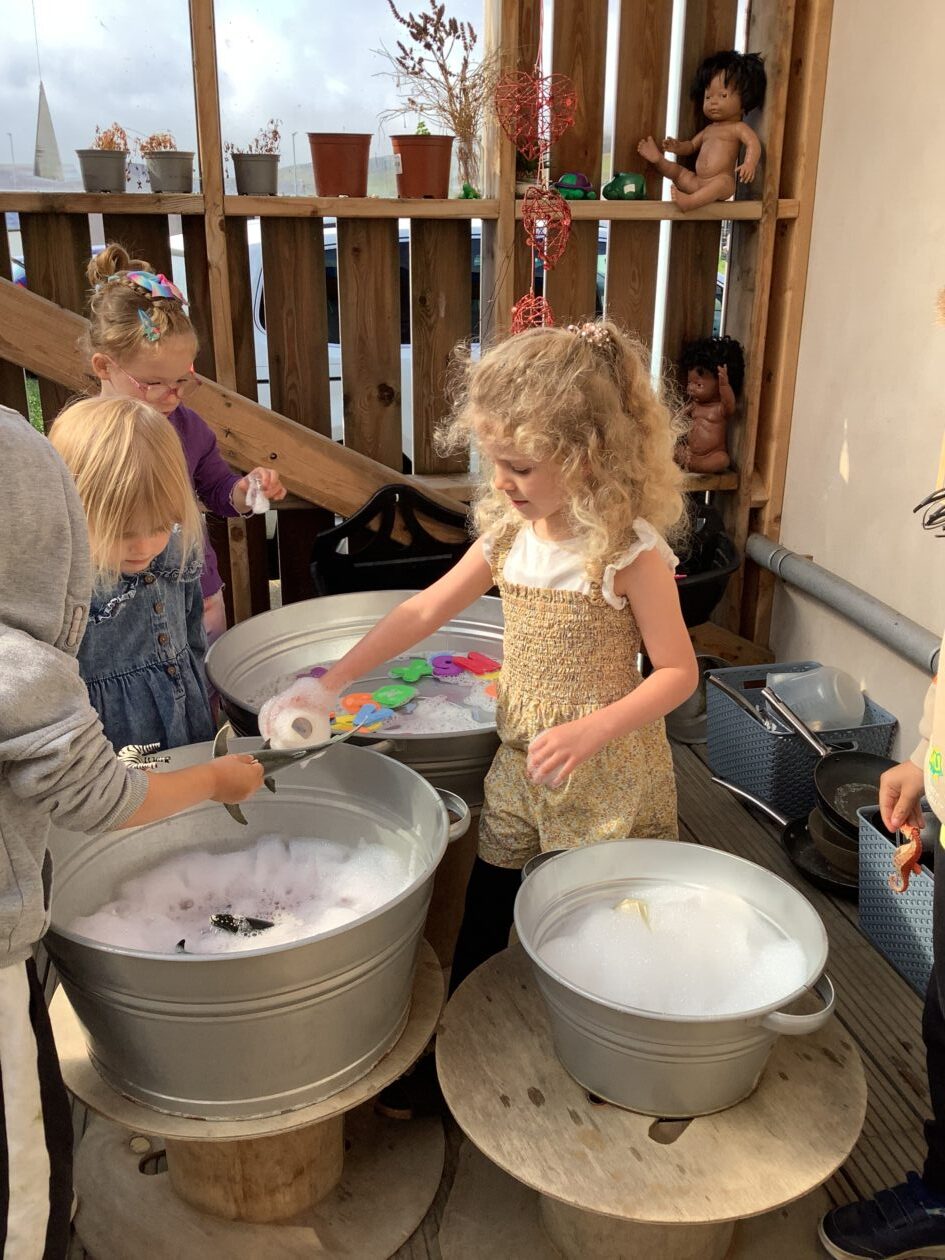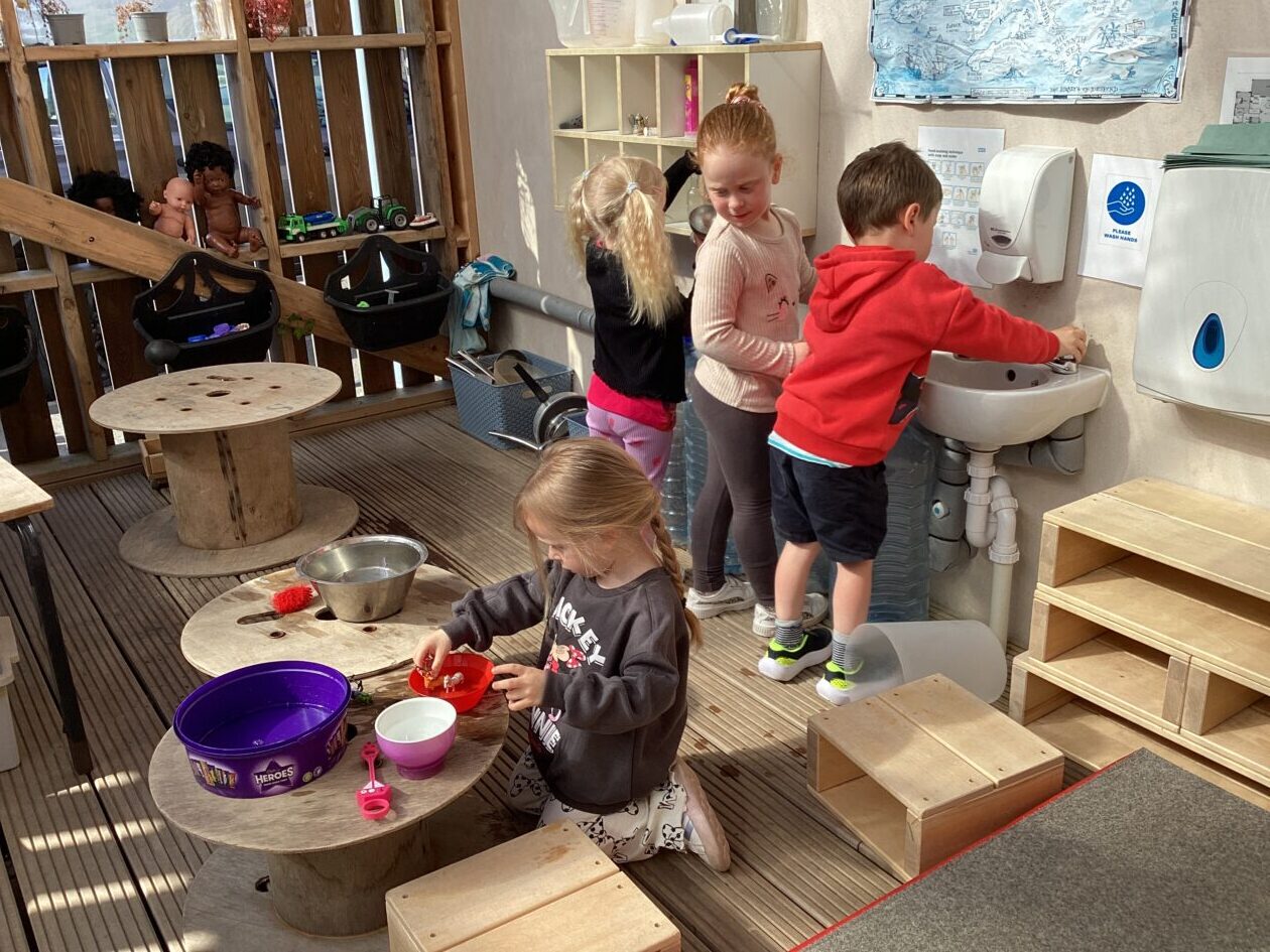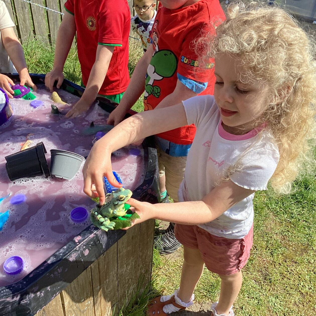 Our outdoor play has focused on water play, bug hunting and singing about the rain.  The bairns have been engaged in sensory play with water, paint and shaving foam.  Trevor put up our new basketball hoop and we’ve planted neeps.