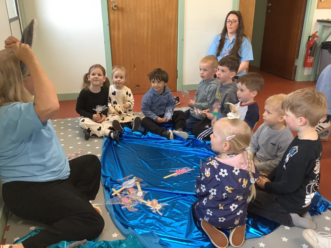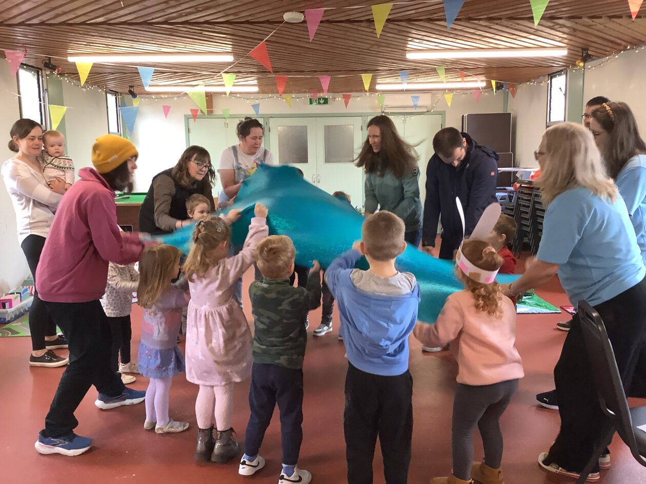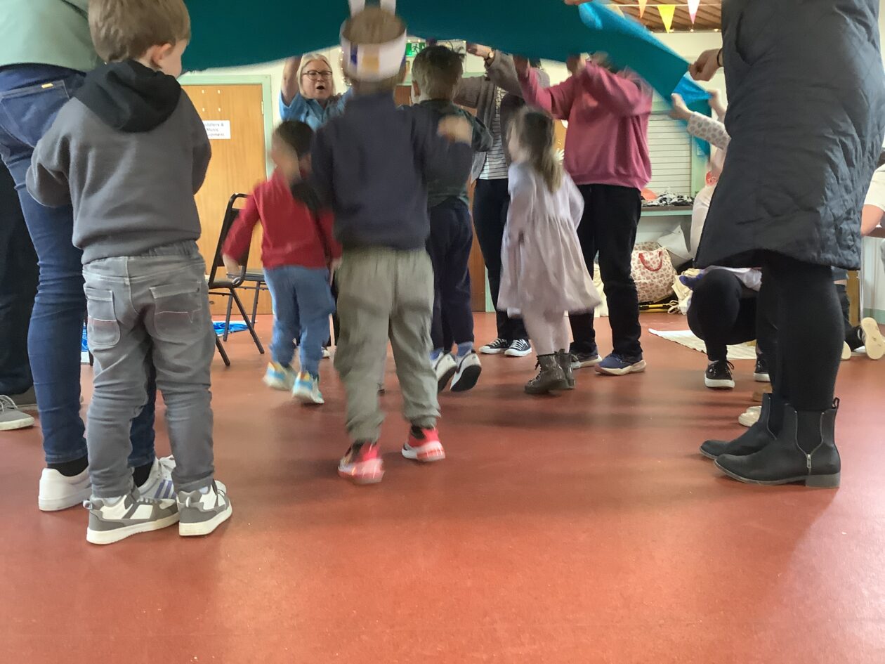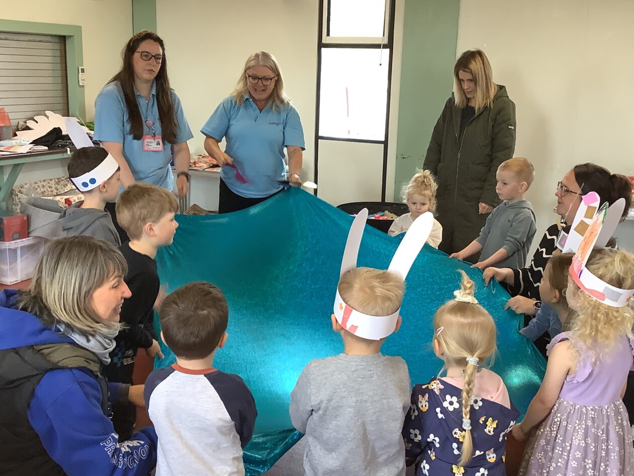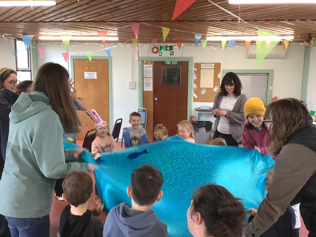 The bairns and families were invited to attend a PlayTalkRead session in the club.  We listened to a story called Bunnies on a Boat which followed a group of mischievous bunnies having an adventure at the seaside.  After the story, the bairns explored the activities that were on offer.  They made bunny headbands, had a bunny picnic, tried to catch a fish, played in the moon sand and lots of other great games.  Then we gathered in a circle, taking hold of the stretchy blanket.  We pulled and pushed, moved up and down, side to side and in and out.  In another game, the bairns and their families made the fish jump on the blanket.  The bairns huddled under the blanket for Sleeping Bunnies to finish the session.