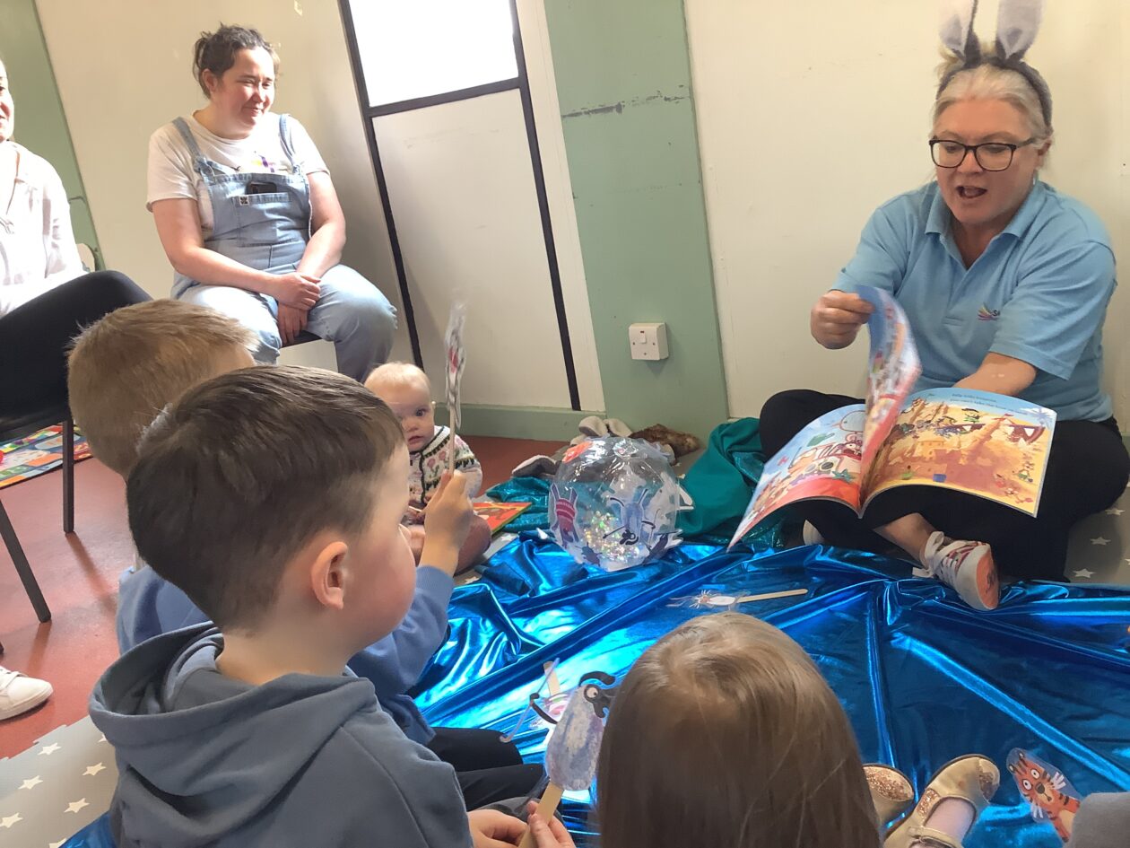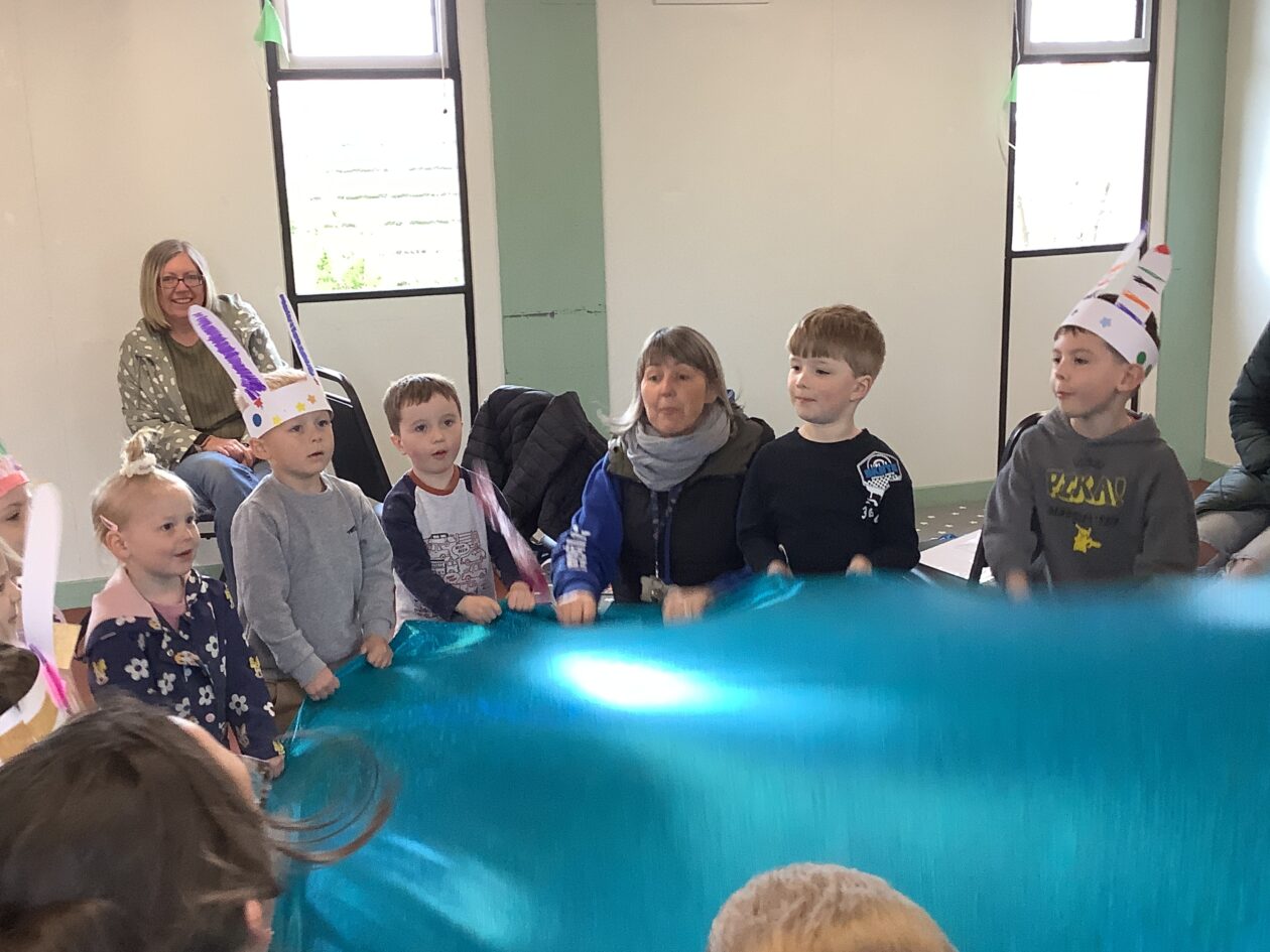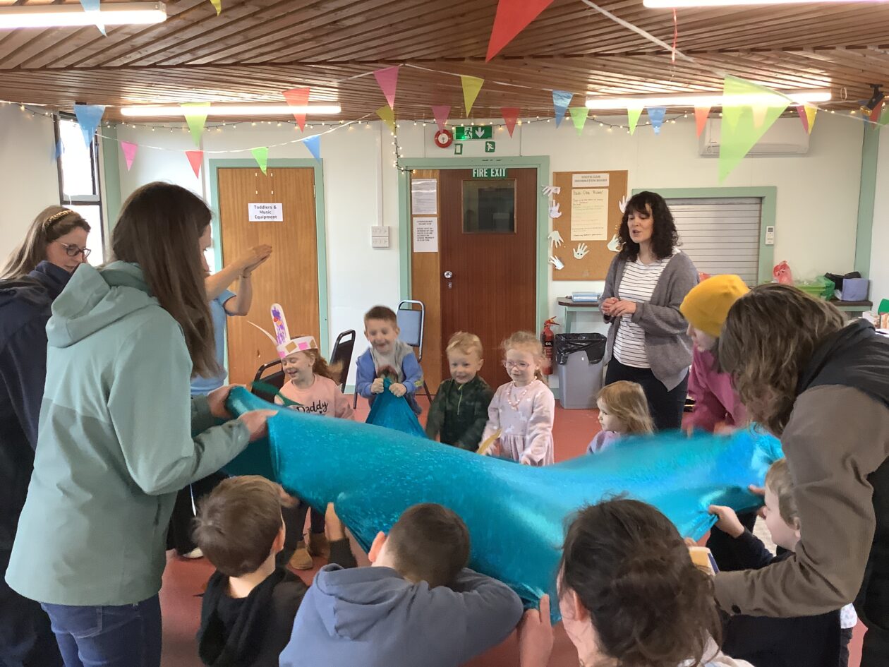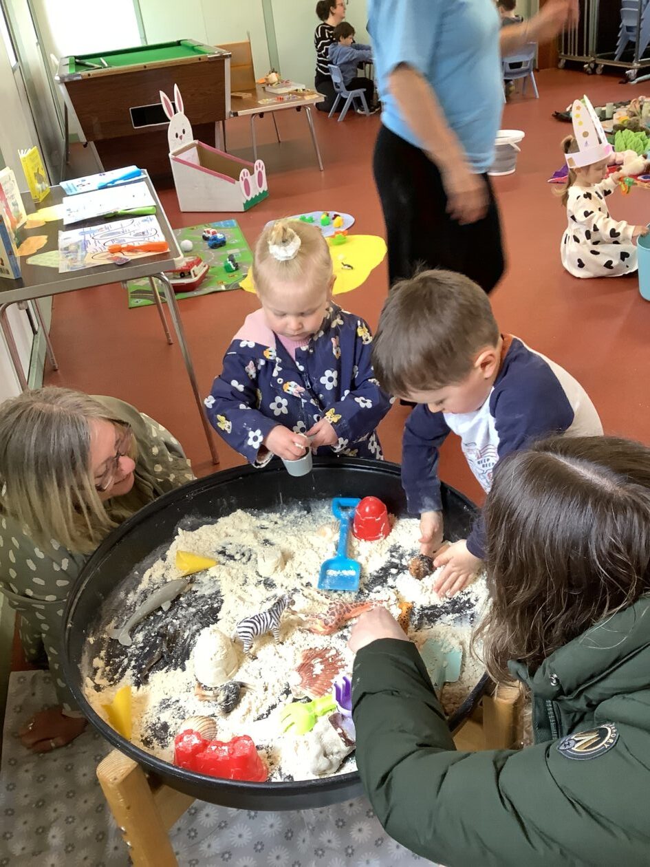 The bairns and families were invited to attend a PlayTalkRead session in the club.  We listened to a story called Bunnies on a Boat which followed a group of mischievous bunnies having an adventure at the seaside.  After the story, the bairns explored the activities that were on offer.  They made bunny headbands, had a bunny picnic, tried to catch a fish, played in the moon sand and lots of other great games.  Then we gathered in a circle, taking hold of the stretchy blanket.  We pulled and pushed, moved up and down, side to side and in and out.  In another game, the bairns and their families made the fish jump on the blanket.  The bairns huddled under the blanket for Sleeping Bunnies to finish the session.