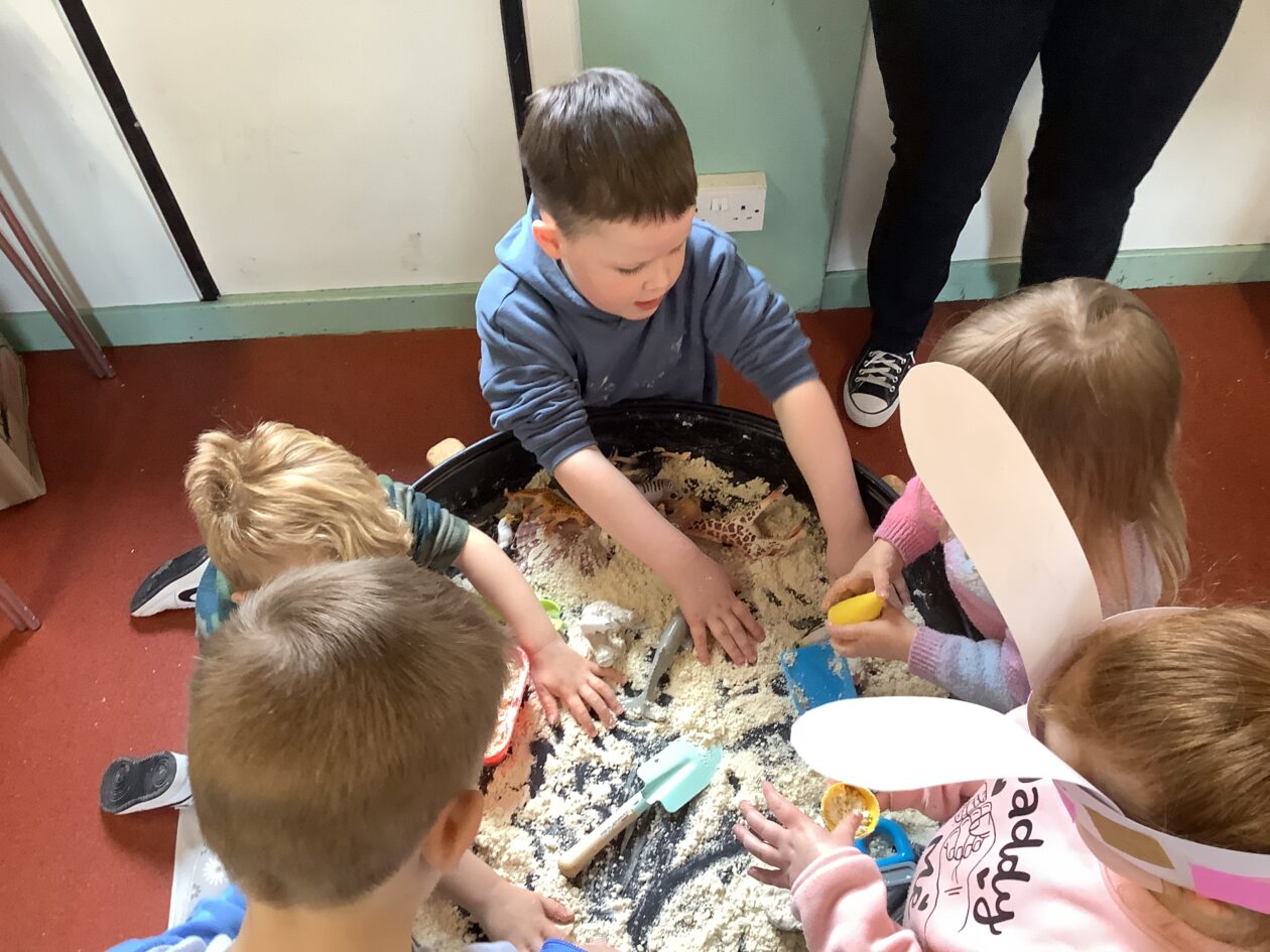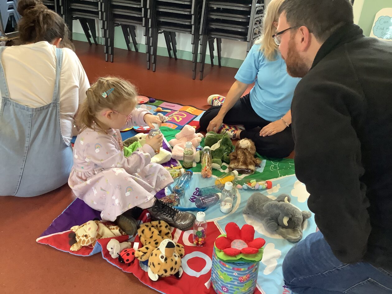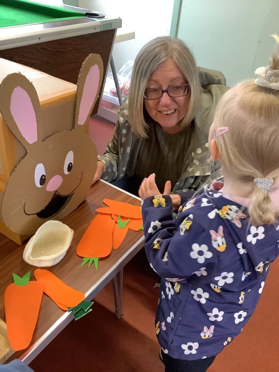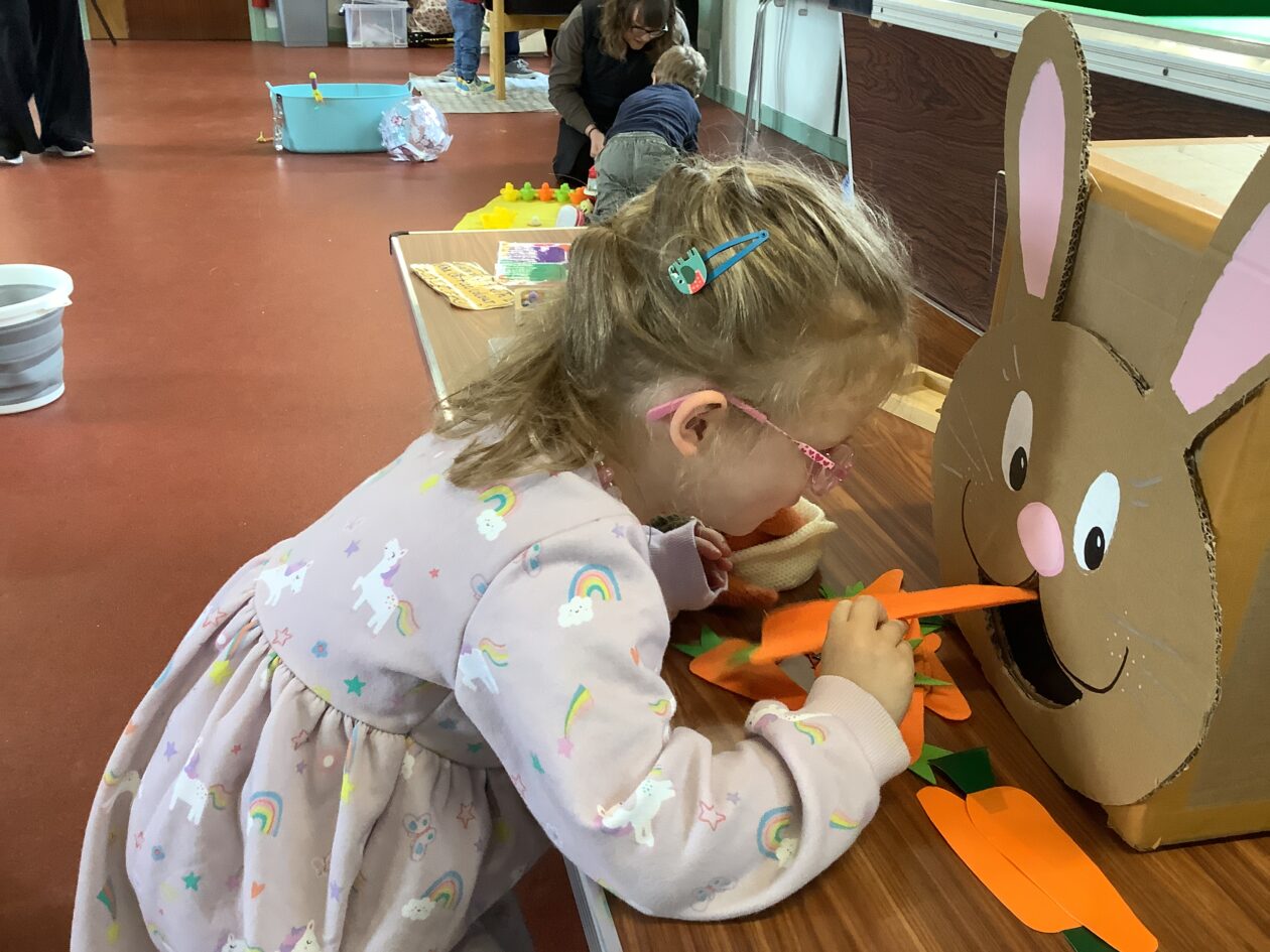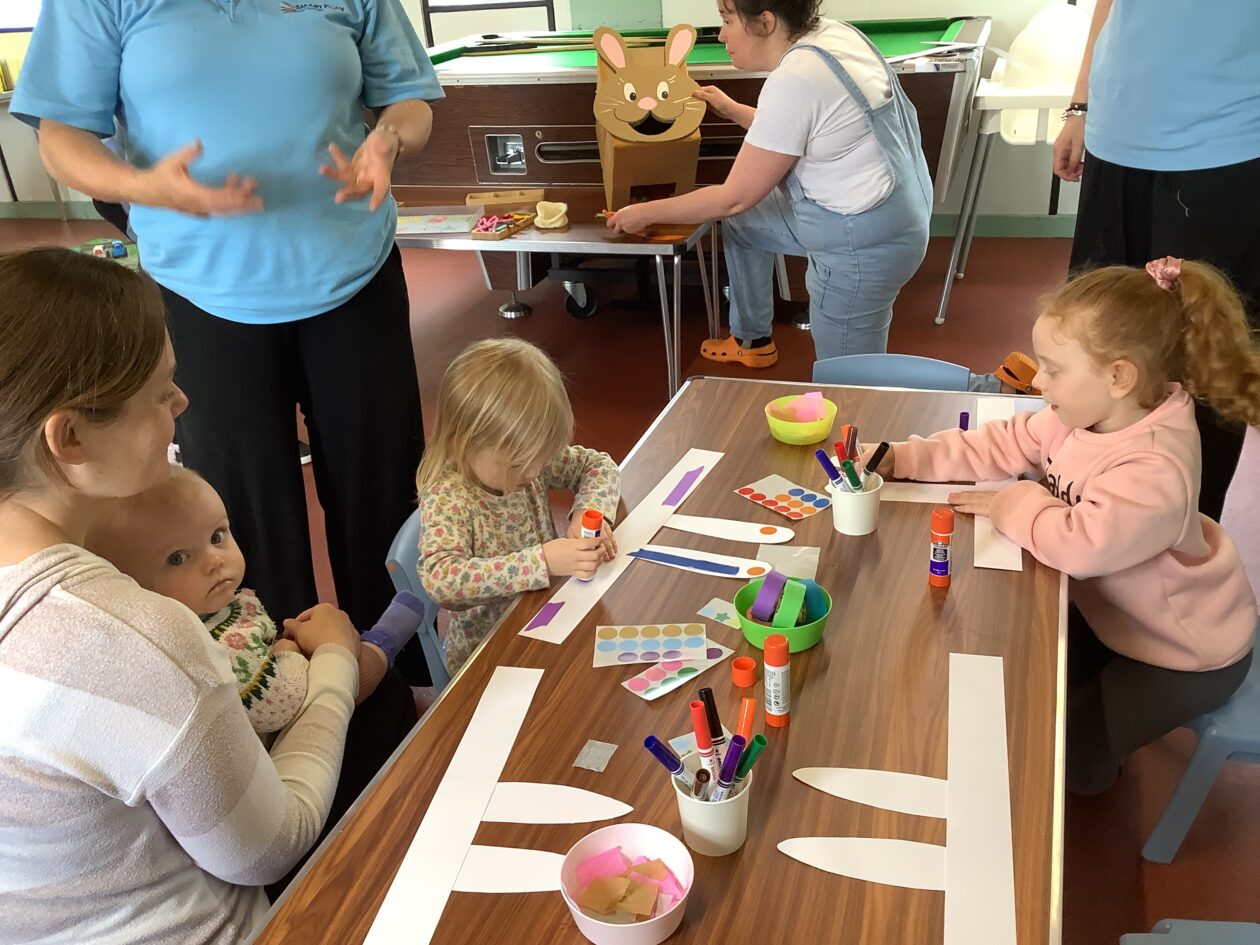 The bairns and families were invited to attend a PlayTalkRead session in the club.  We listened to a story called Bunnies on a Boat which followed a group of mischievous bunnies having an adventure at the seaside.  After the story, the bairns explored the activities that were on offer.  They made bunny headbands, had a bunny picnic, tried to catch a fish, played in the moon sand and lots of other great games.  Then we gathered in a circle, taking hold of the stretchy blanket.  We pulled and pushed, moved up and down, side to side and in and out.  In another game, the bairns and their families made the fish jump on the blanket.  The bairns huddled under the blanket for Sleeping Bunnies to finish the session.