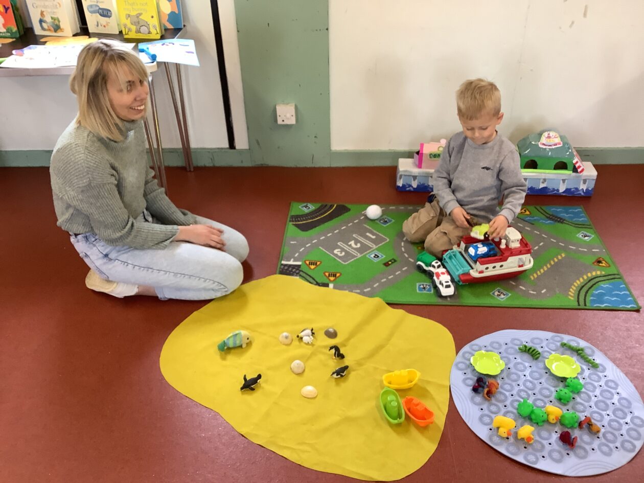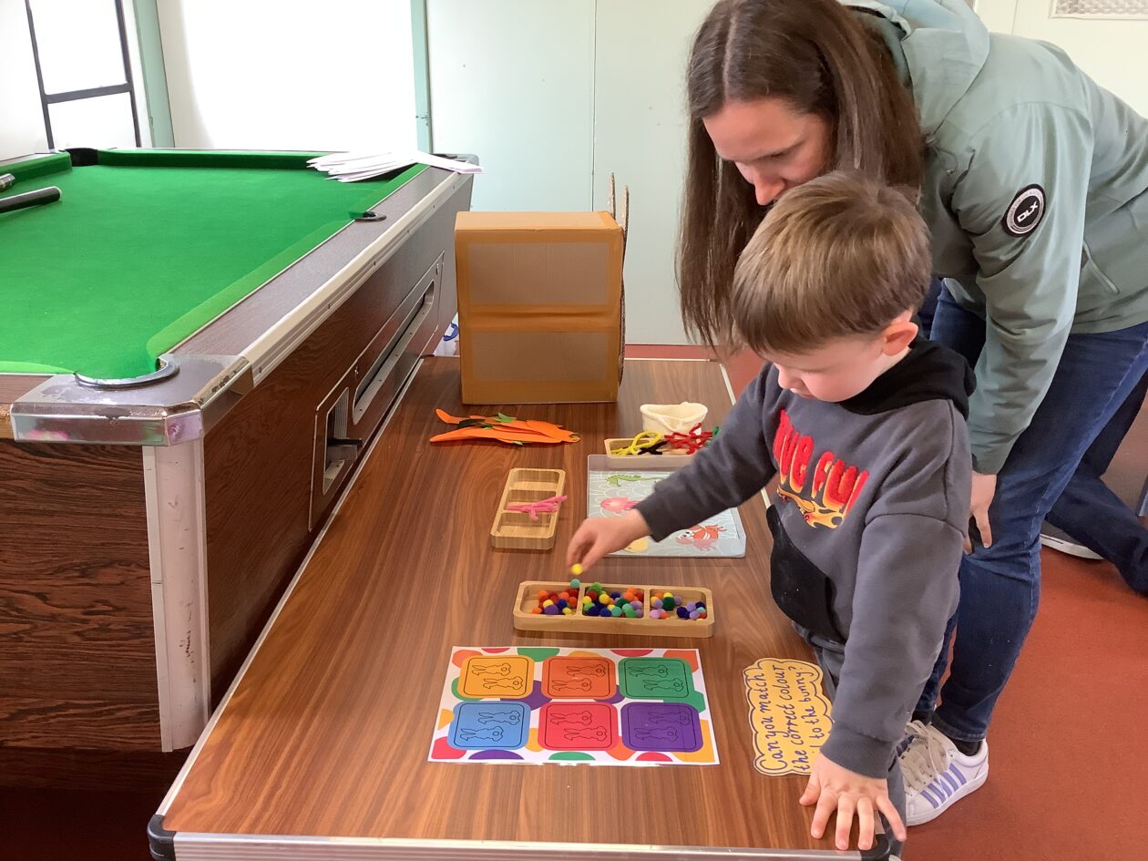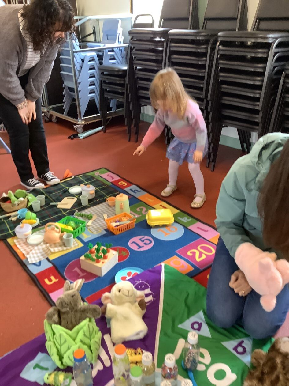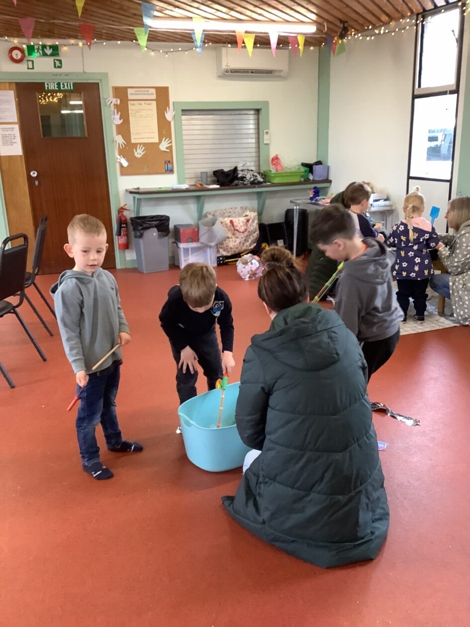 The bairns and families were invited to attend a PlayTalkRead session in the club.  We listened to a story called Bunnies on a Boat which followed a group of mischievous bunnies having an adventure at the seaside.  After the story, the bairns explored the activities that were on offer.  They made bunny headbands, had a bunny picnic, tried to catch a fish, played in the moon sand and lots of other great games.  Then we gathered in a circle, taking hold of the stretchy blanket.  We pulled and pushed, moved up and down, side to side and in and out.  In another game, the bairns and their families made the fish jump on the blanket.  The bairns huddled under the blanket for Sleeping Bunnies to finish the session.