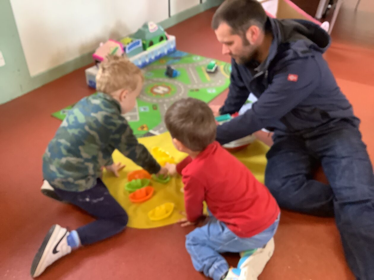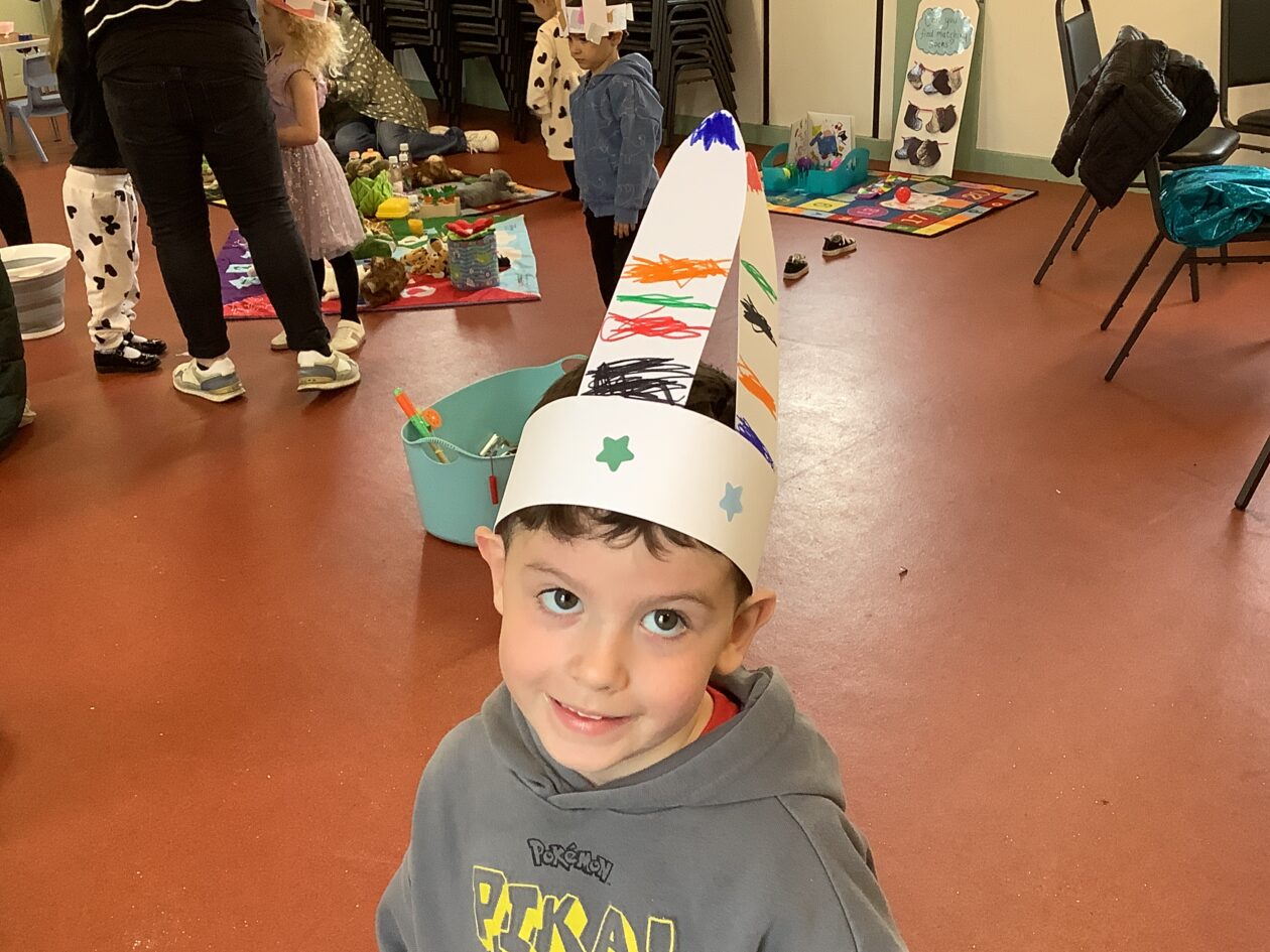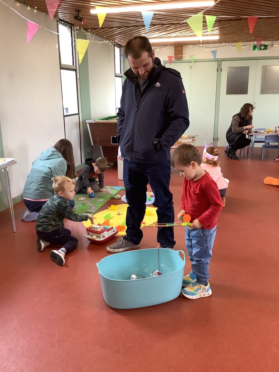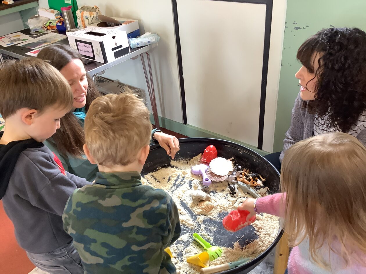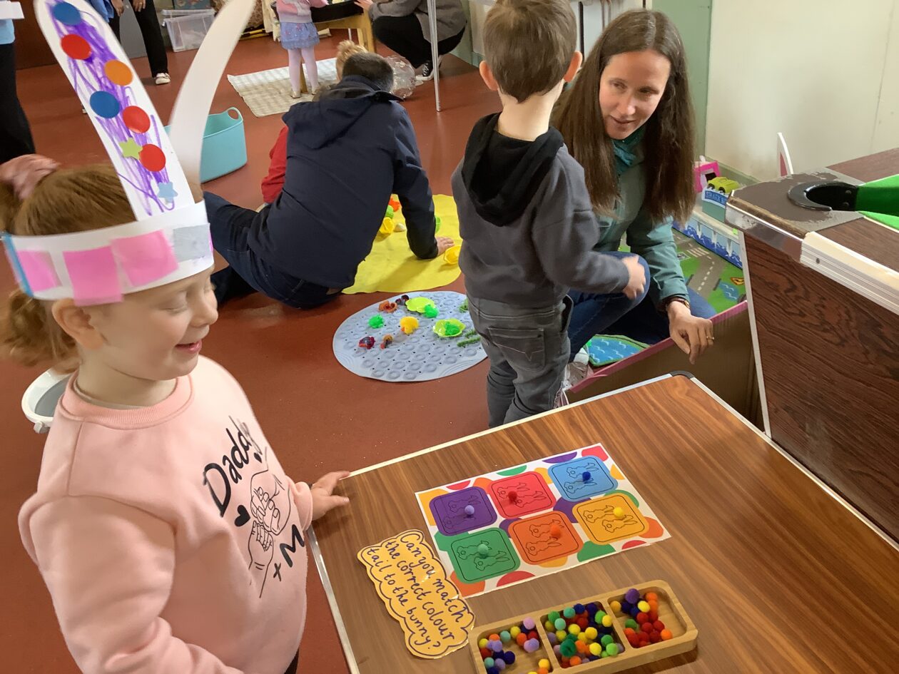 The bairns and families were invited to attend a PlayTalkRead session in the club.  We listened to a story called Bunnies on a Boat which followed a group of mischievous bunnies having an adventure at the seaside.  After the story, the bairns explored the activities that were on offer.  They made bunny headbands, had a bunny picnic, tried to catch a fish, played in the moon sand and lots of other great games.  Then we gathered in a circle, taking hold of the stretchy blanket.  We pulled and pushed, moved up and down, side to side and in and out.  In another game, the bairns and their families made the fish jump on the blanket.  The bairns huddled under the blanket for Sleeping Bunnies to finish the session.