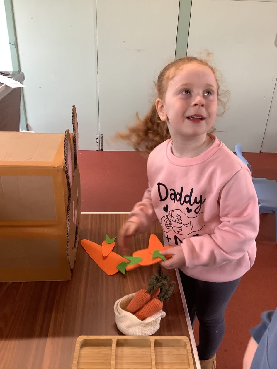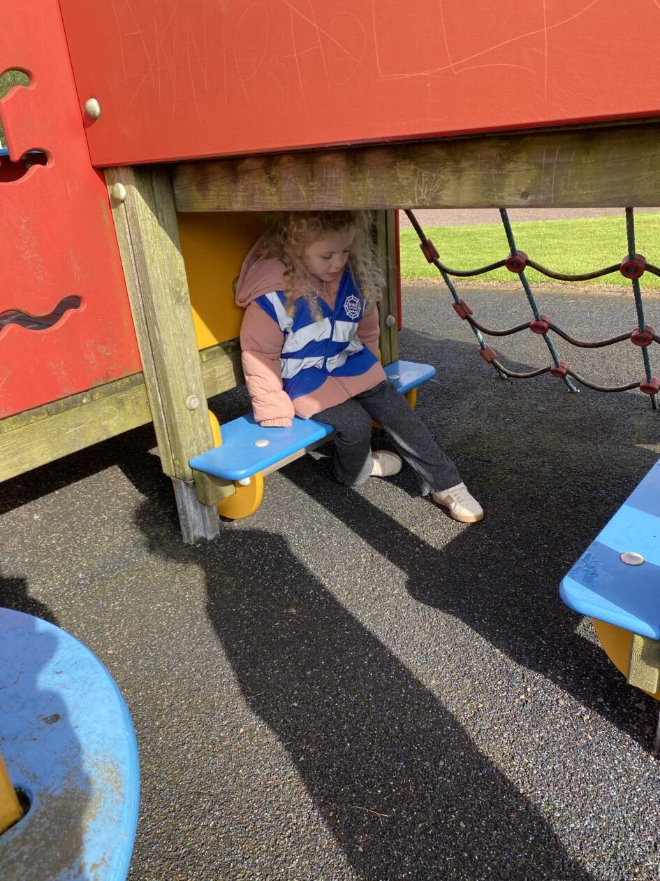 We took a wander down to the Salvation Army polycrubs.  On the way we spotted road signs, a tractor and lots of rabbits.  We said hello to the goats and then headed into the polycrub.  The bairns quickly found the toys and had an explore.  There were jigsaws, quizzes, farm vehicles and a rocking chair.  The bairns also found a pop-up ball and took turns to squish it down and wait for the pop!  We had a look at the honesty cupboard and clothes donation box and chatted about how to use it and when you might need it.  On our way out, we stopped at the hen house and saw the four lambs in the park next door.  On the way back to nursery we spoke about shadows and saw lots more rabbits.