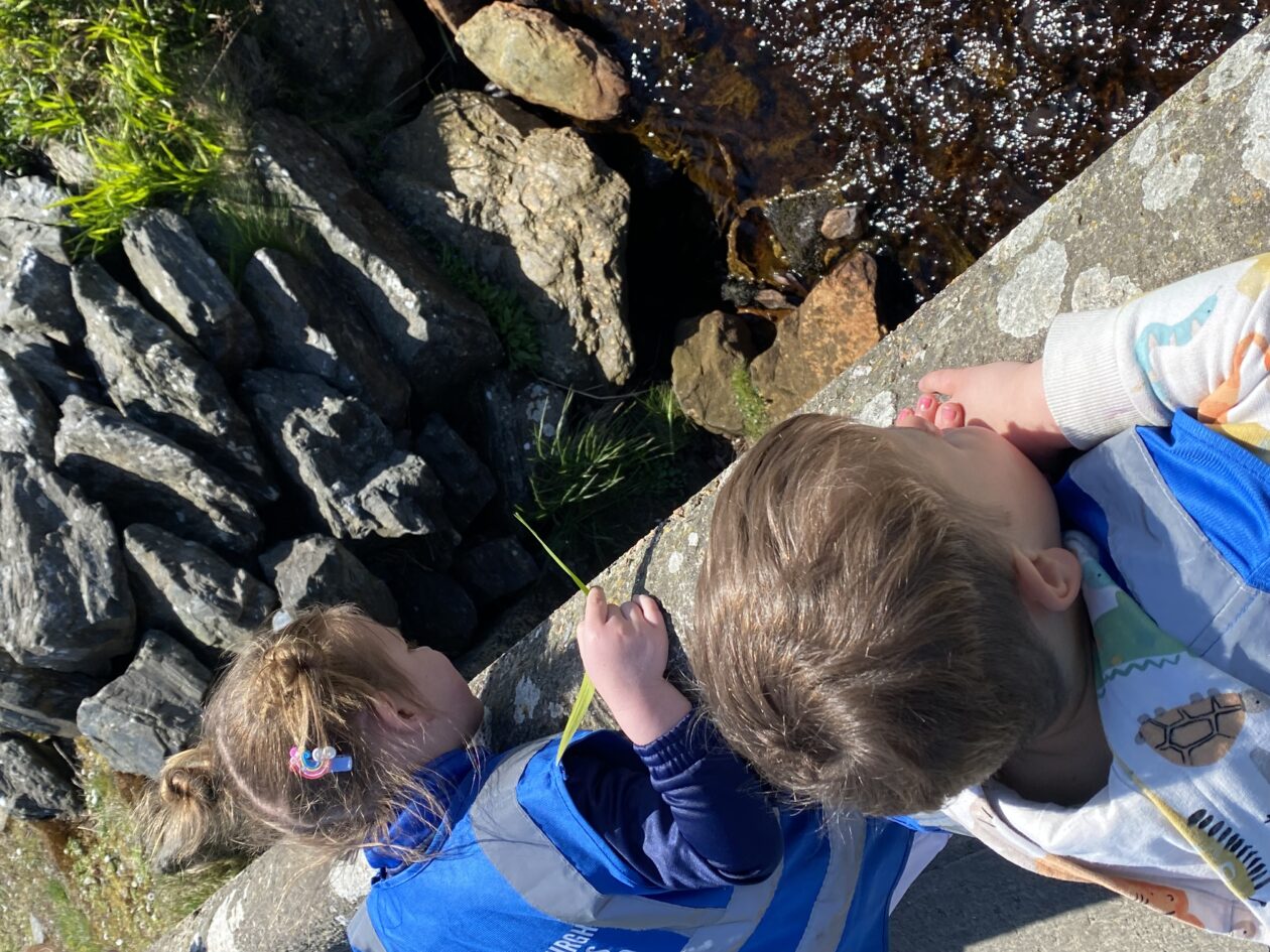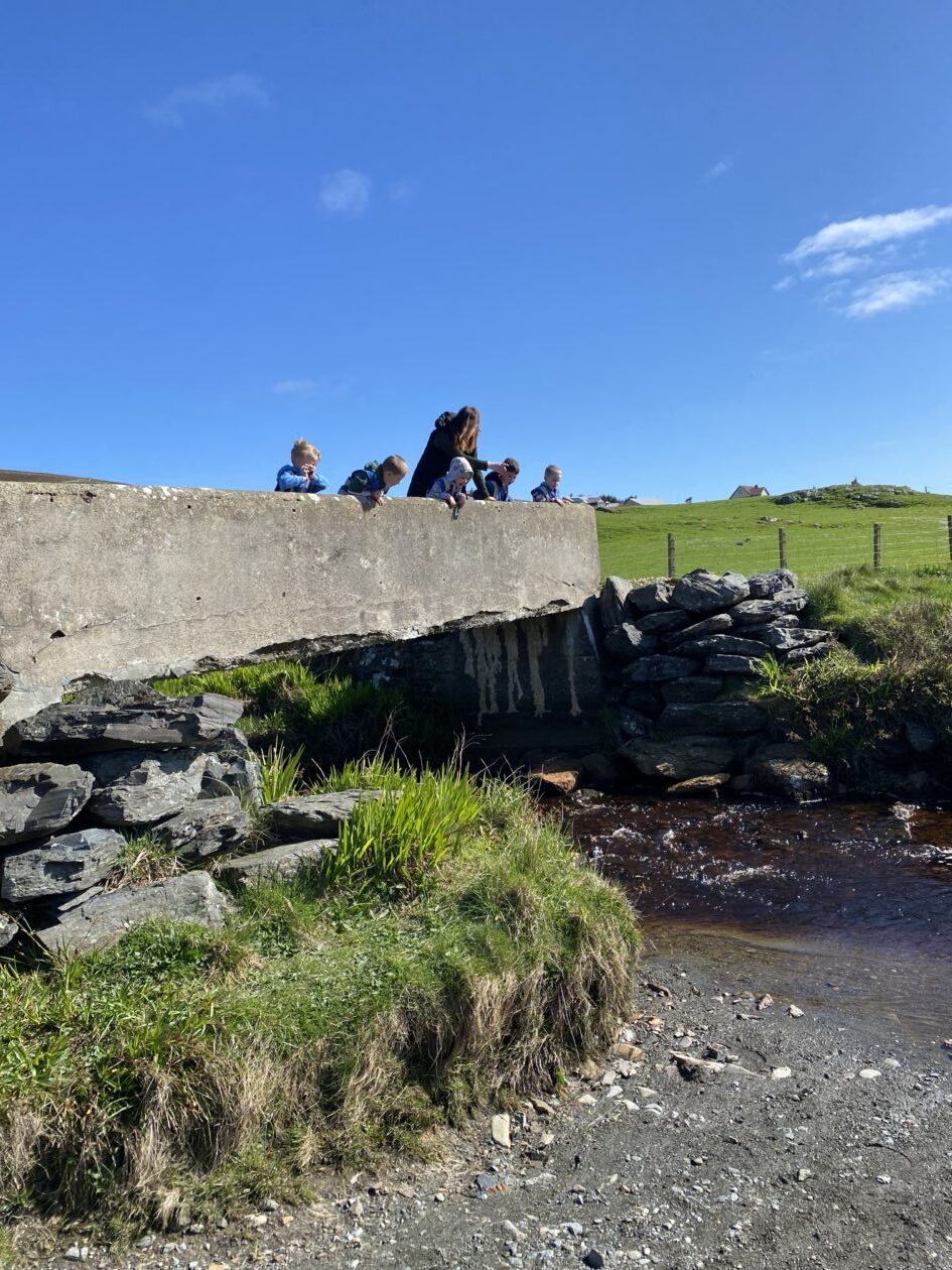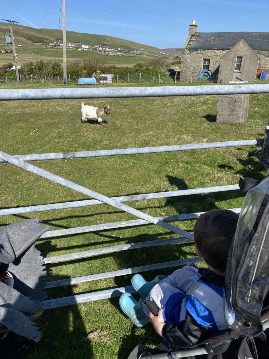 We set off on a walk around Cunningsburgh on Friday morning.  We saw lots of animals on our way – rabbits, sheep, lambs, goats, pigs, hens and a cow.  On the way back to nursery we stopped at the burn to throw stones and sail siggies down the water.  As we were nearly back at nursery one of the bairns asked “Are we back in Cunningsburgh now?”  It was a big walk for peerie legs!
