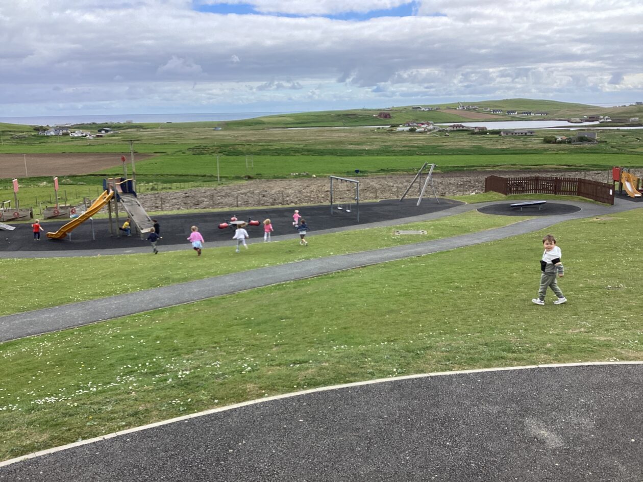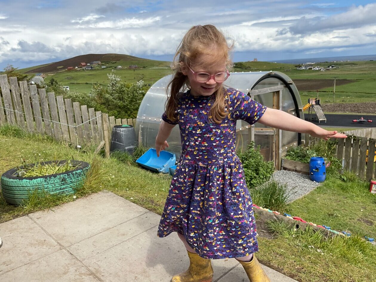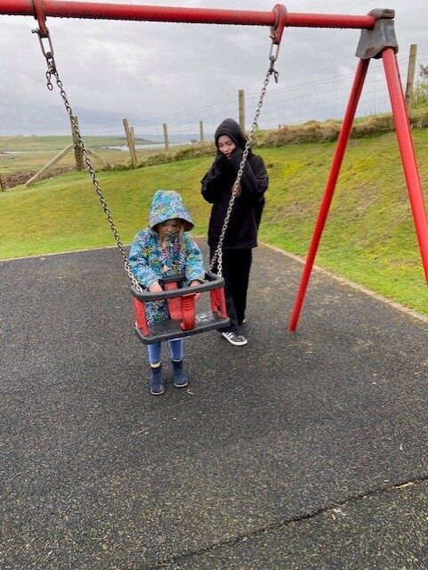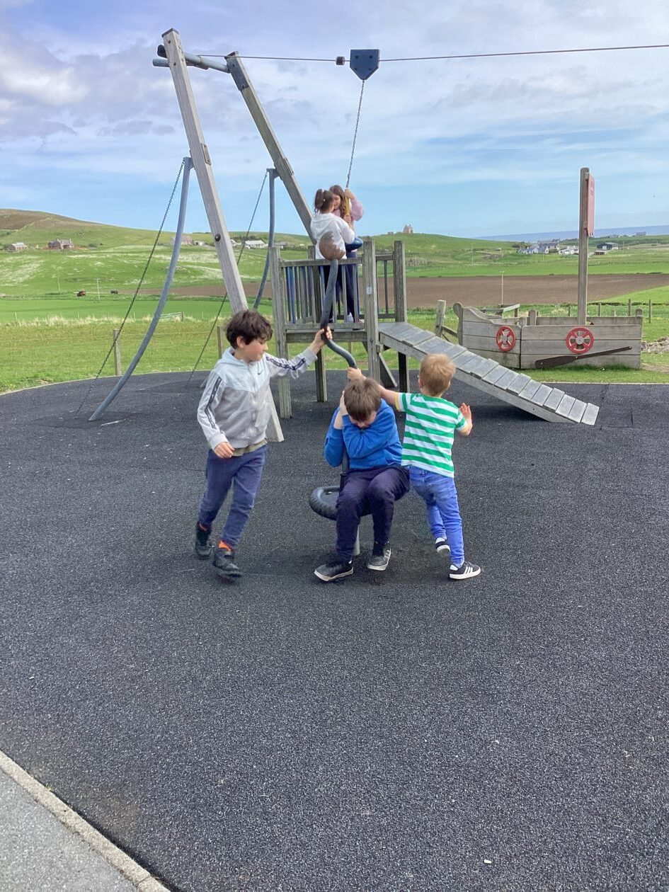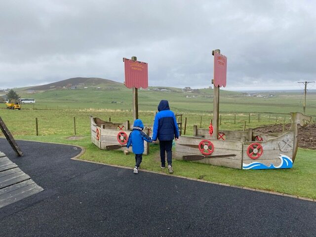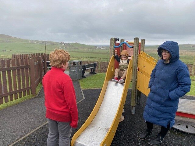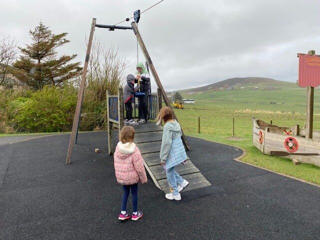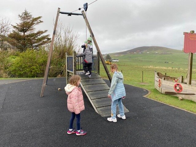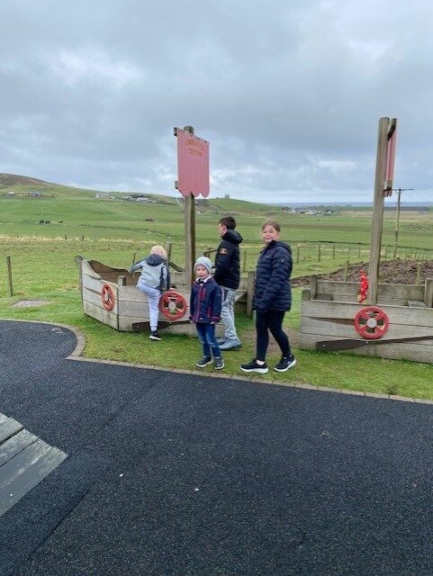 We had an adventure to Lerwick and were very grateful for parents dropping off in town.  After drying off the equipment, the bairns explored the area, teaming up for things like the see-saw and the balance frame. We had a snack under the shelter of the huts watching the rain.  When we set off for our walk to Mareel, it had dried up so we didn’t arrive soggy.  During our walk we looked for a car in every colour of the rainbow.  We saw red, orange, green, blue and purple cars pretty quickly so we just needed a yellow car.  On our way to the catch the bus home, we spotted a yellow van and our mission was complete.  The concert was very lively with over 200 bairns in the audience.  The band, Budapest Cafe Orchestra, was lively and had the bairns up dancing from the first tune.  They spoke about their instruments and how the pitch and tempo changes.  We also looked out for something weird on the stage!  “I liked the slide and I liked the concert and all the dancing.”