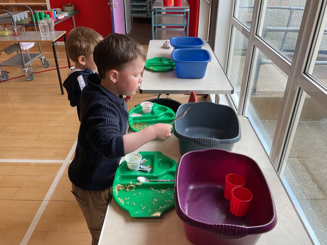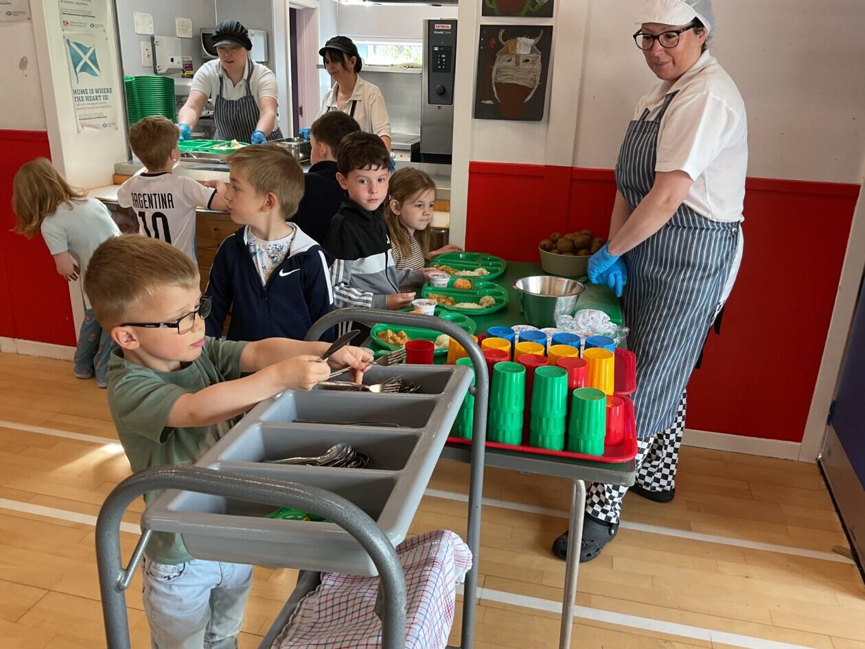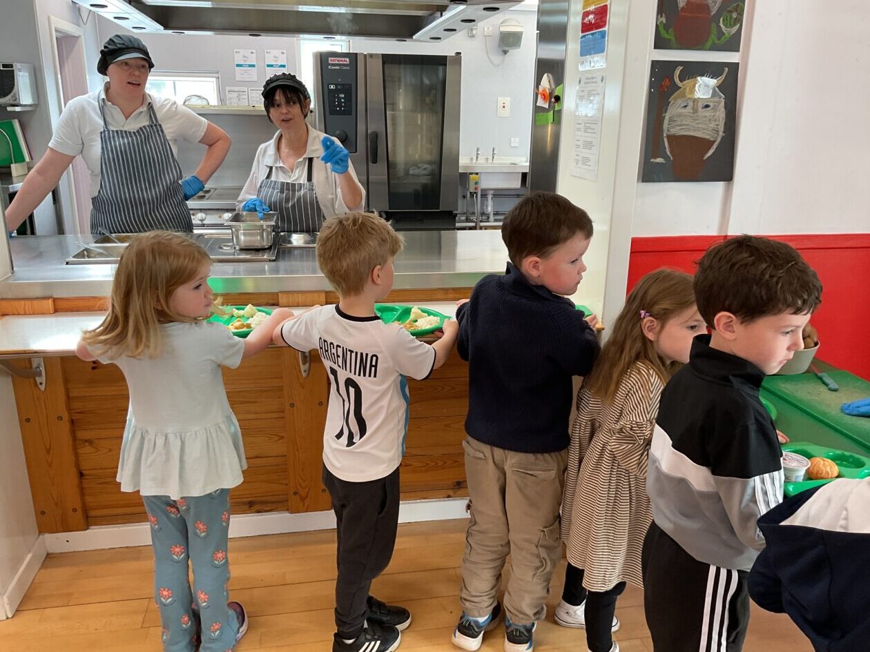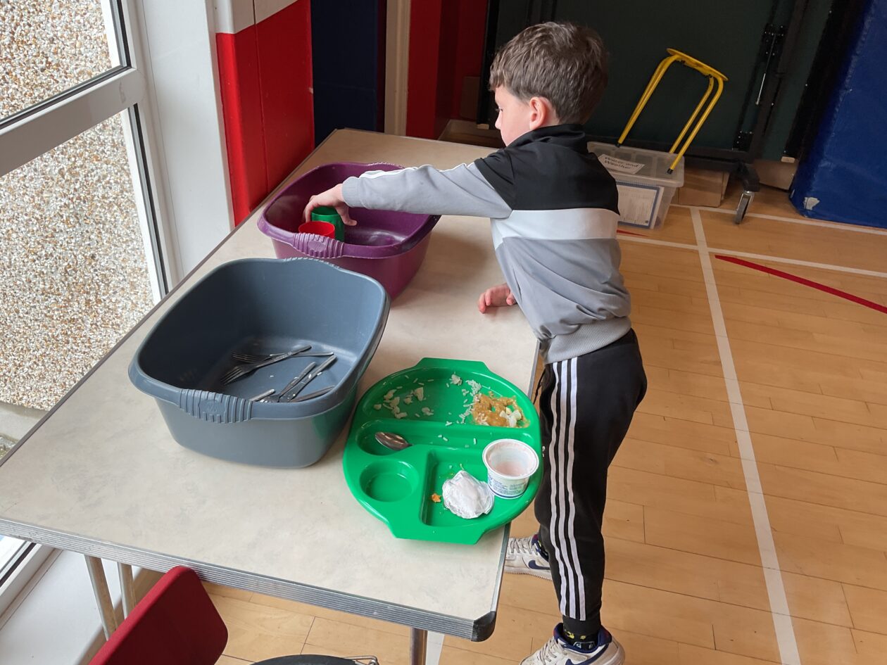 The bairns put their lunch transition skills to good use again this week.  They lined up , got their tray and pudding, collected their cutlery and filled up their cup with water.  When they were finished, they scaped their tray into the bin.