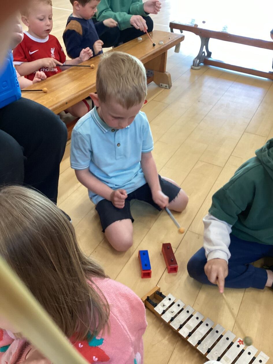 We did some stretching to get us warmed up for music.  Then it was time to sing Pop Goes the Weasel.  The bairns took turns to play instruments in time with the pop.  We moved around the hall, listening for the changing notes and then practised for our graduation ceremony.  On their way back to nursery, the bairns had a turn with the Zen bowl.