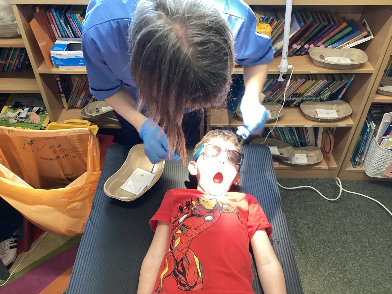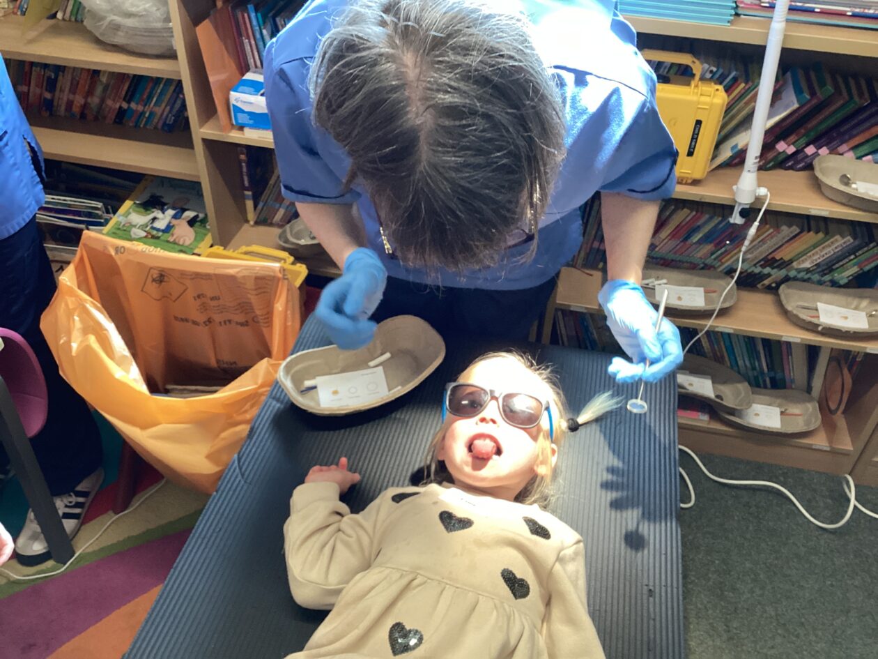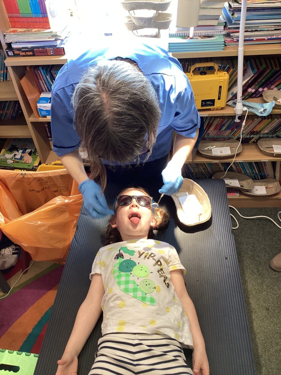 Childsmile visited on Monday to apply fluoride varnishing to the bairns’ teeth.  They were given sunglasses to wear and asked to open wide for the varnish to be applied.  “It tasted like ‘nanas!”