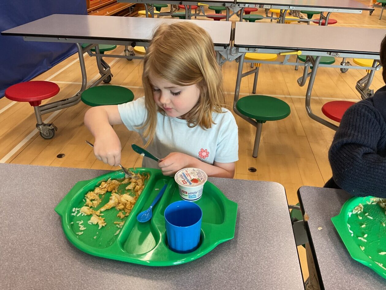 The preschoolers had their first transition lunch this week.  They lined up in the hall to receive their tray.  They listened to the school dinner routines and with two more sessions planned, they will be experts before parents come in to join them for dinner.