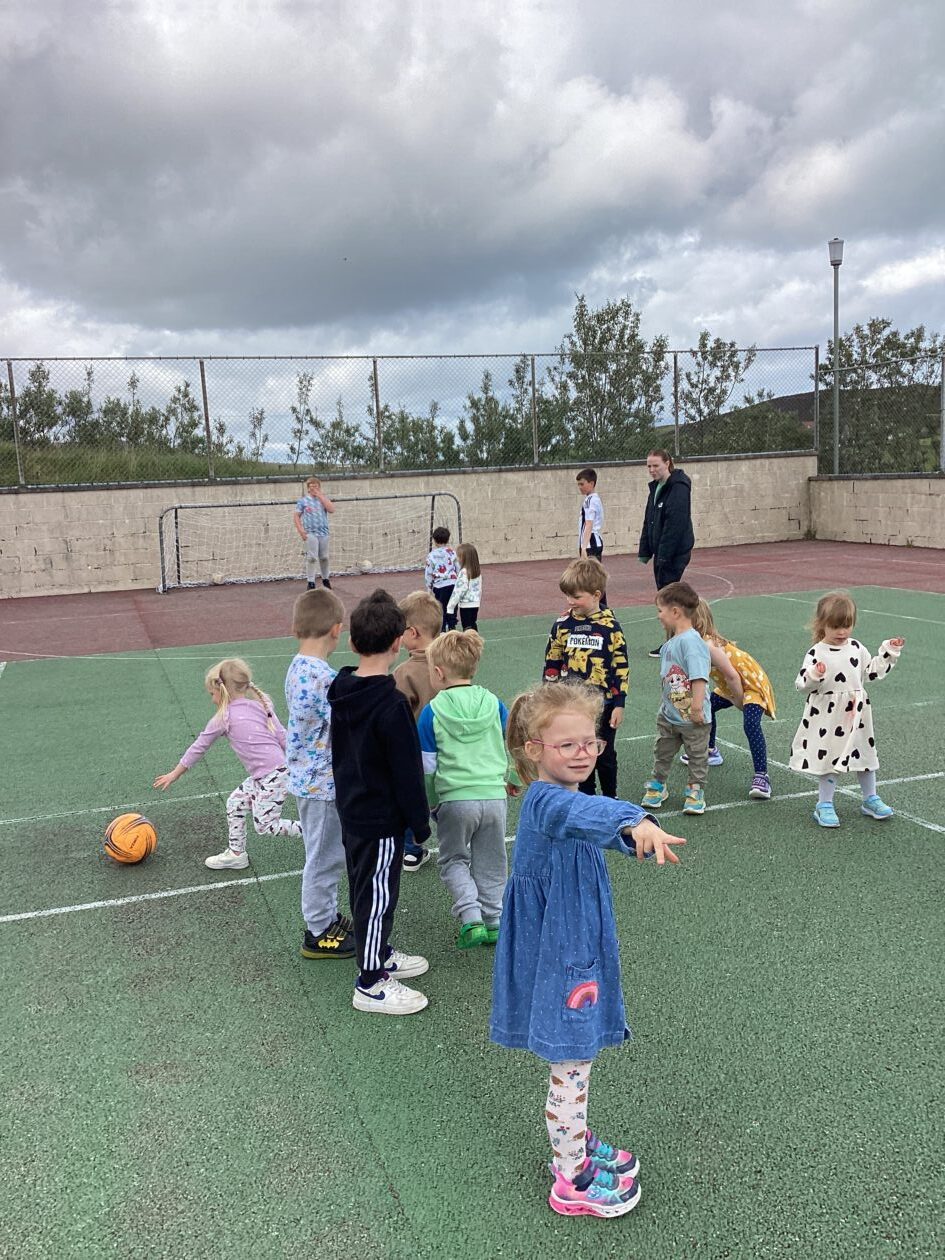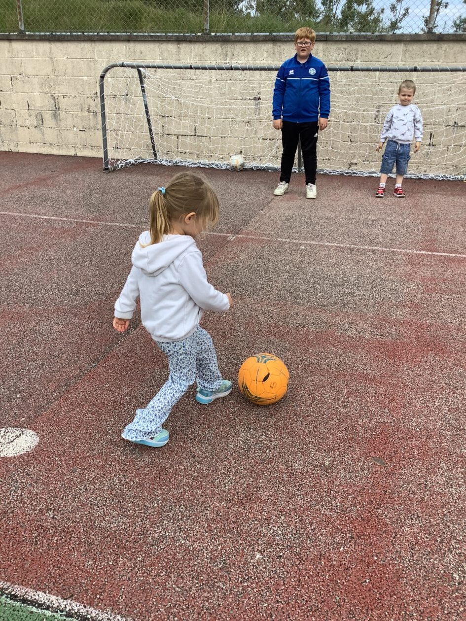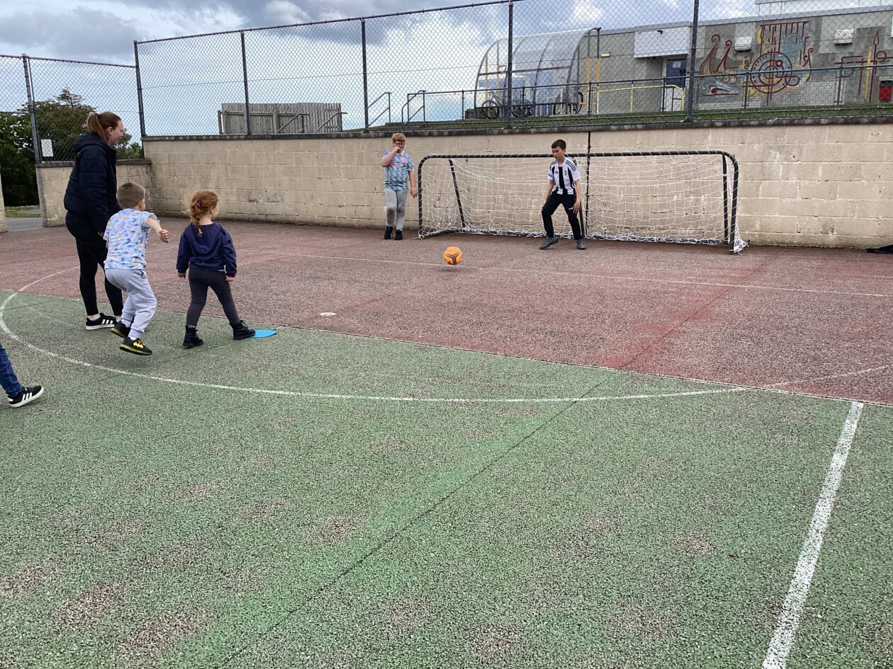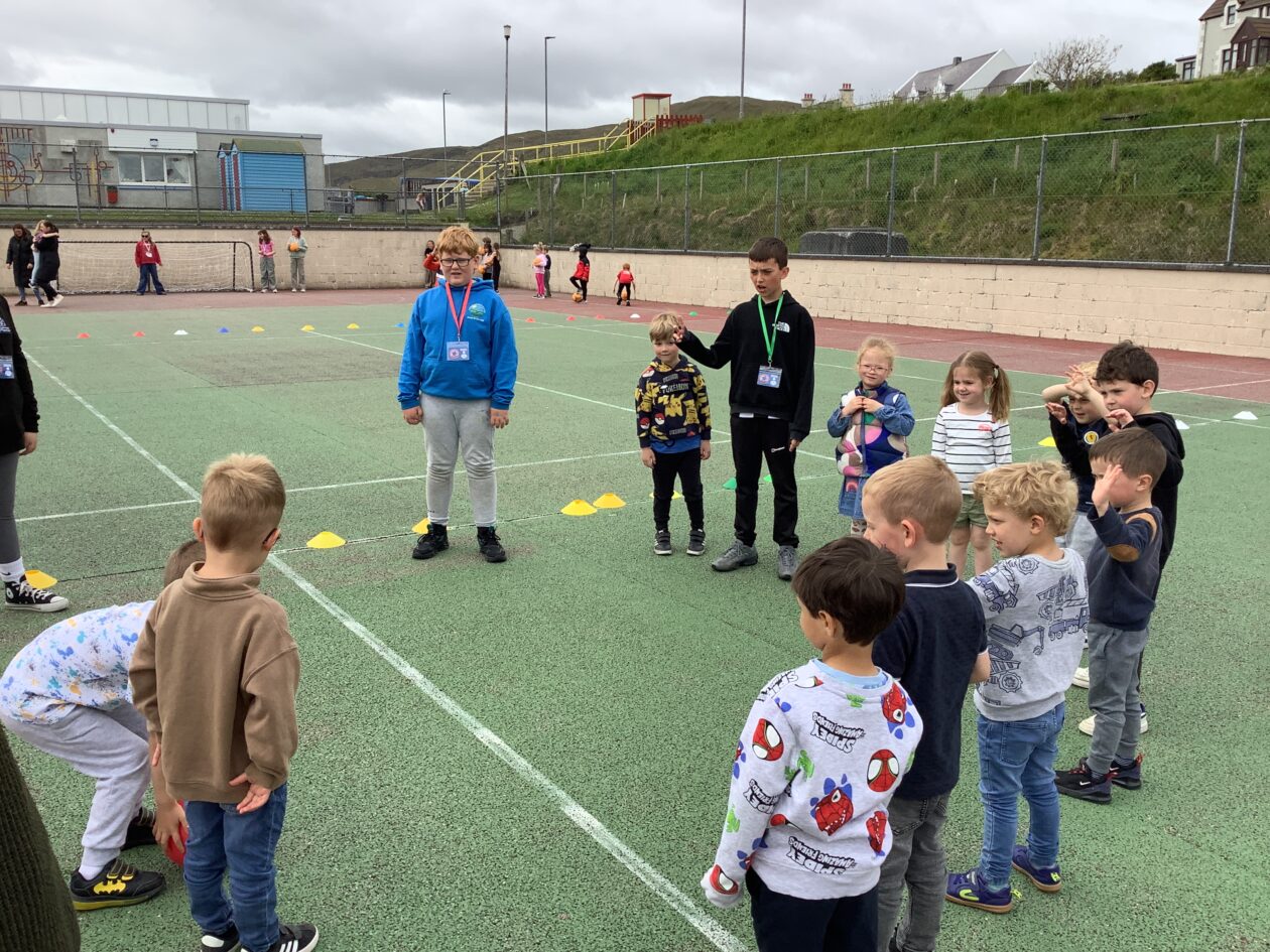 The Primary 7 bairns held another Monster Kickabout and took the nursery bairns to the multicourt for coaching sessions focusing on football skills.  They played games like Duck Duck Goose, Simon Says and Ship Shore Sea.  The bairns had a turn at dribbling and a penalty shoot-out.  They made a circle and practiced passing the ball to each other.  The bairns also submitted their medal colouring in sheets.