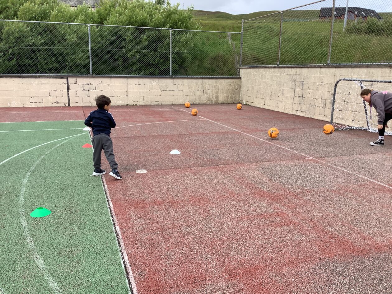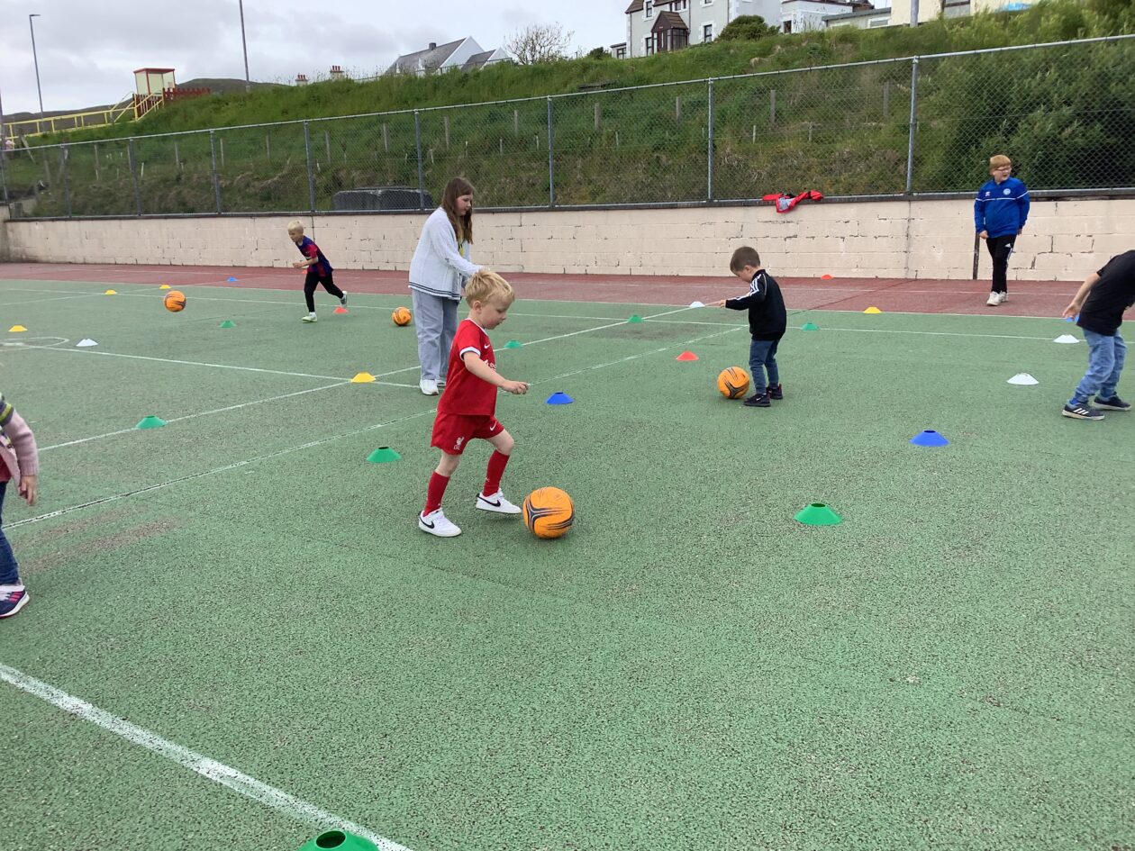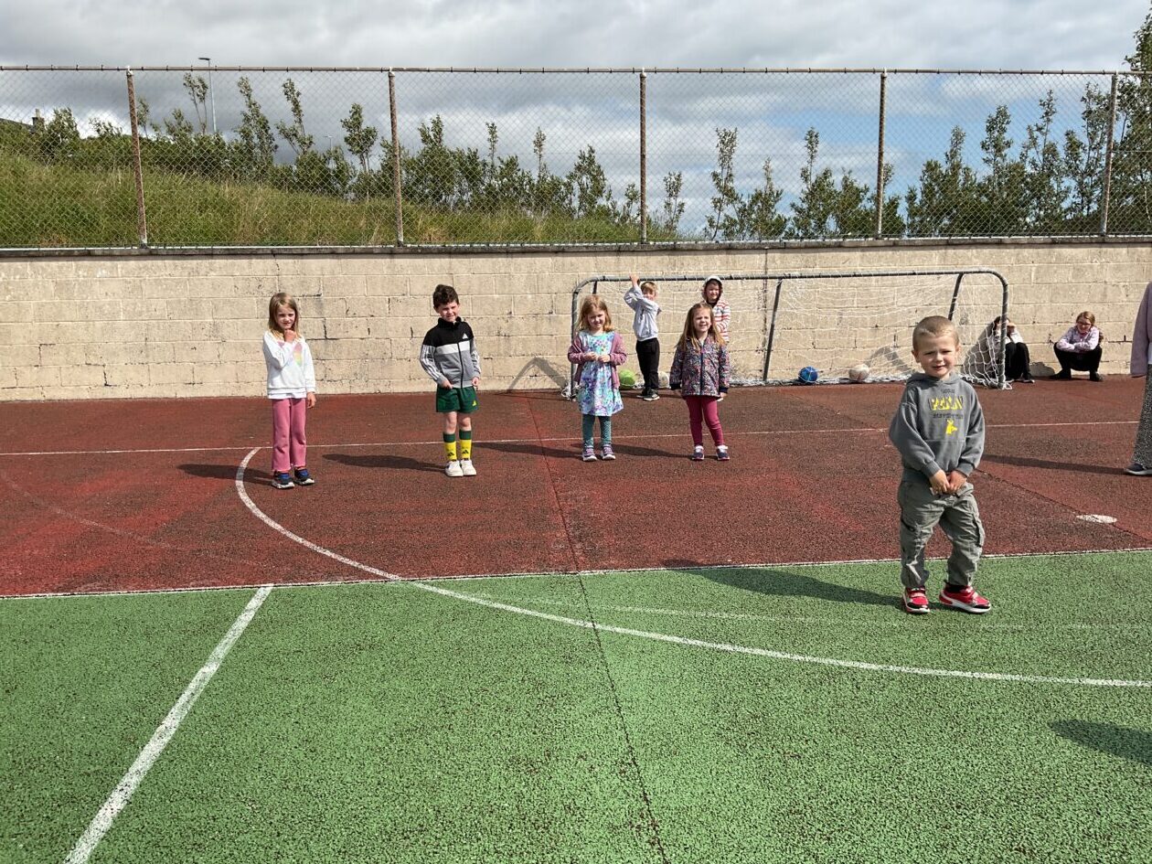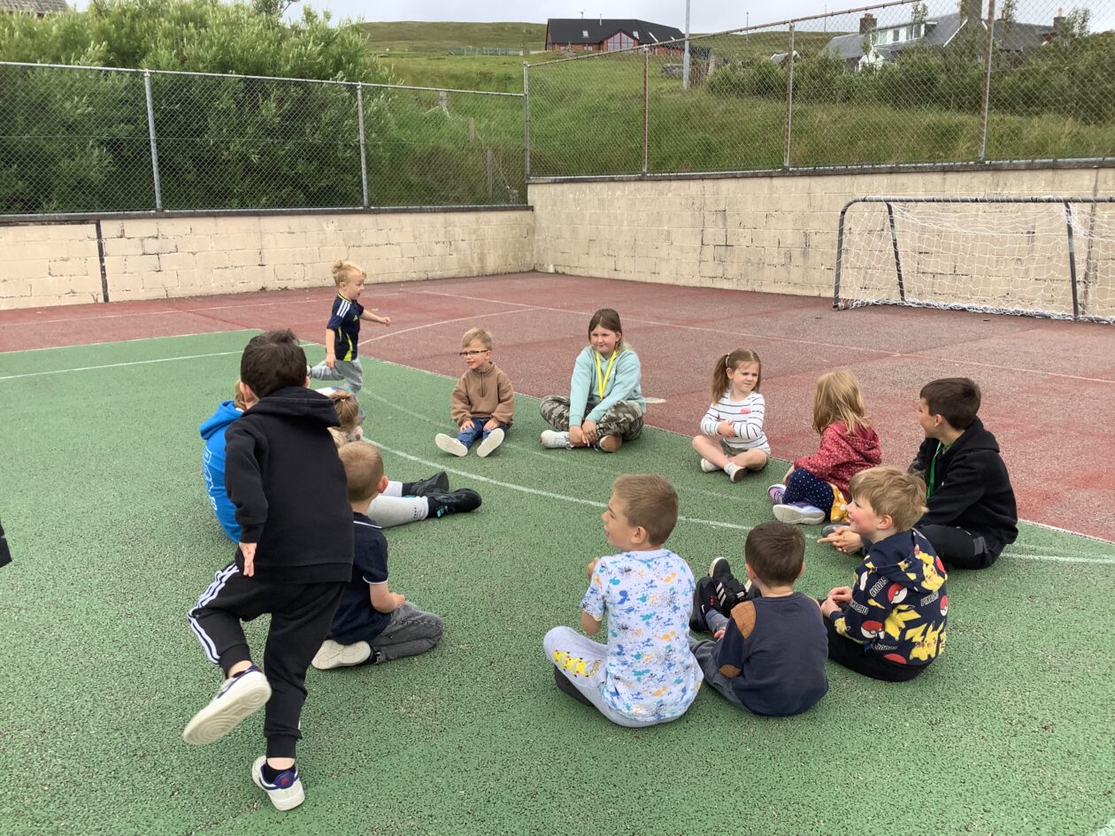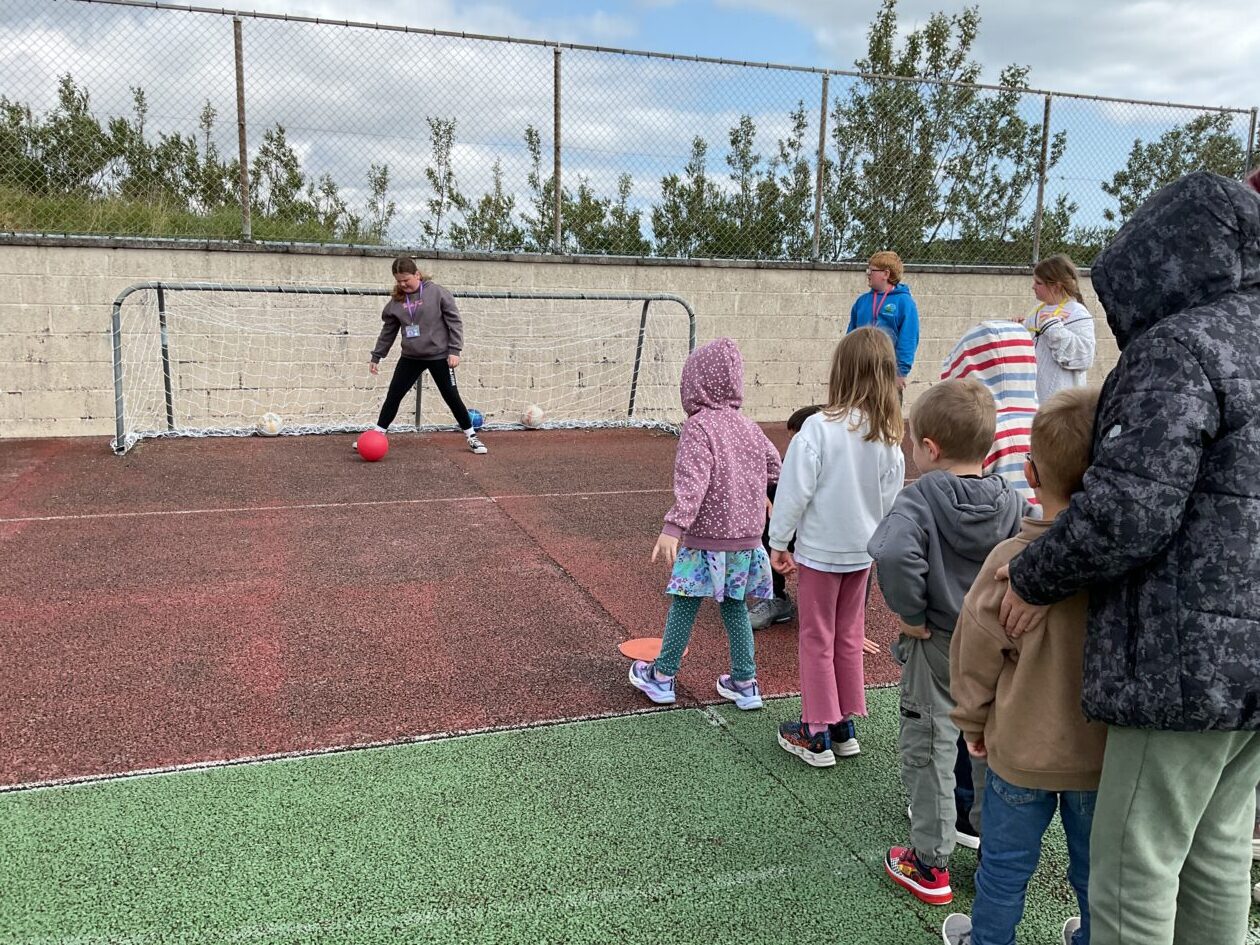 The Primary 7 bairns held another Monster Kickabout and took the nursery bairns to the multicourt for coaching sessions focusing on football skills.  They played games like Duck Duck Goose, Simon Says and Ship Shore Sea.  The bairns had a turn at dribbling and a penalty shoot-out.  They made a circle and practiced passing the ball to each other.  The bairns also submitted their medal colouring in sheets.
