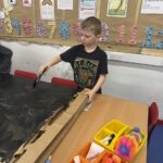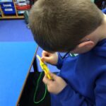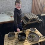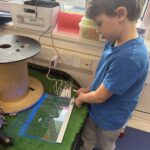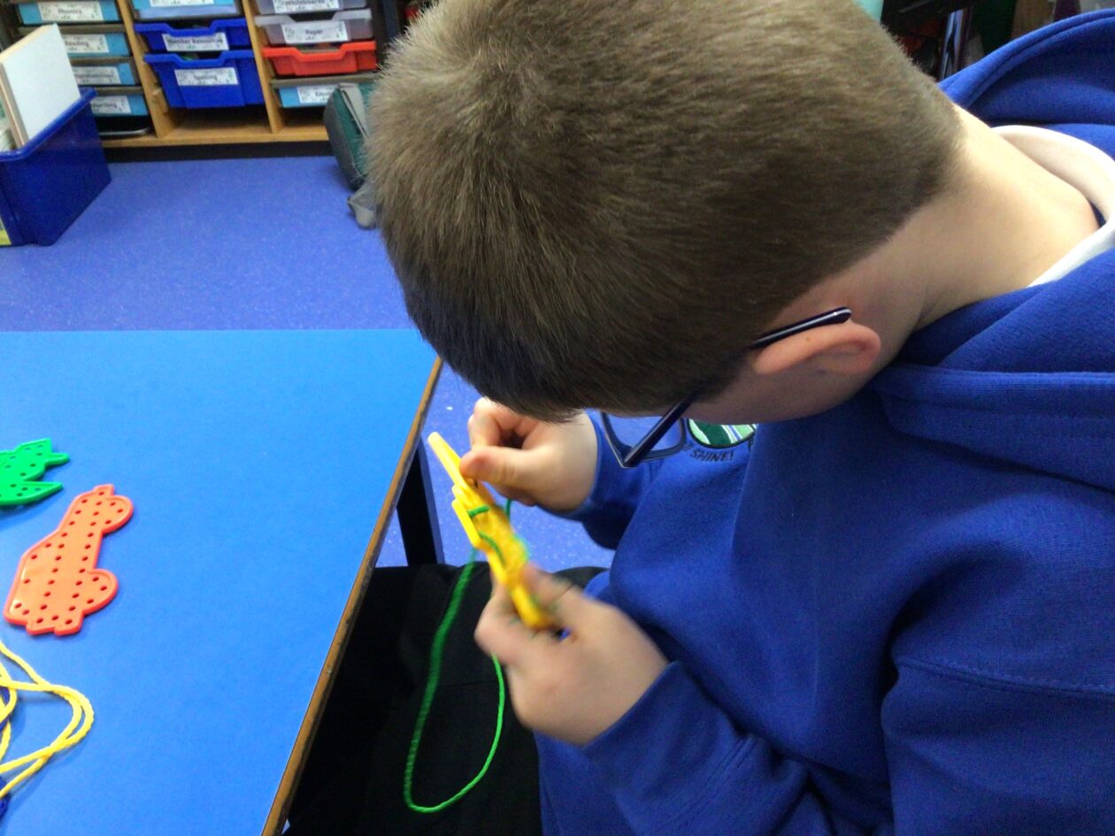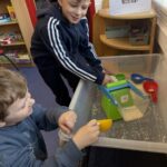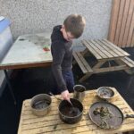 This week we have enjoyed the knitting needles and wool, learning to knit and be creative with the wool in other ways. We also had the dinosaurs back out with the sand as they are a big favourite. Other play opportunities that arose this week came when some of the children wanted to create catapults and targets which was great fun with lots of measuring, distance and meta skills(adapting, collaboration and communication) coming into play.