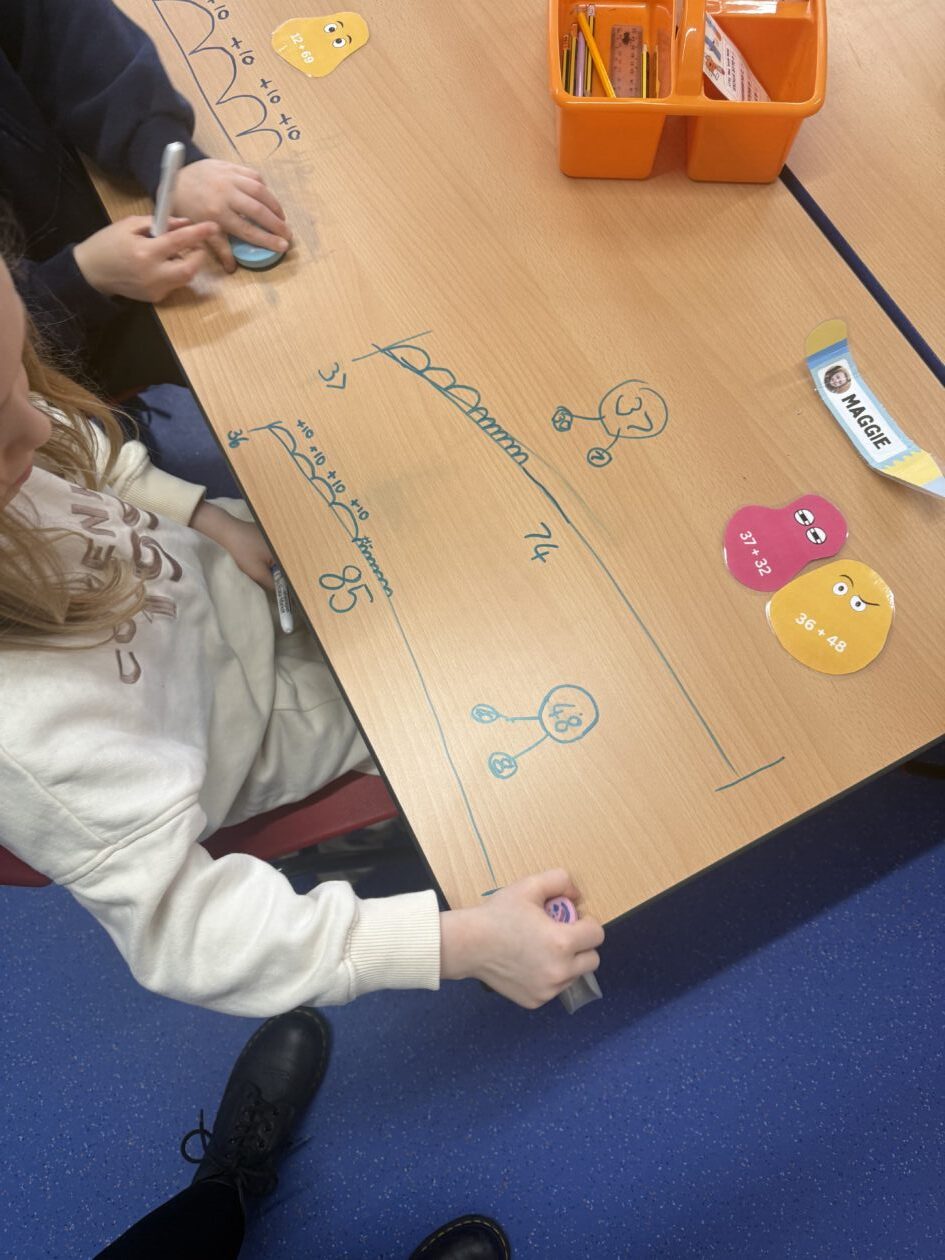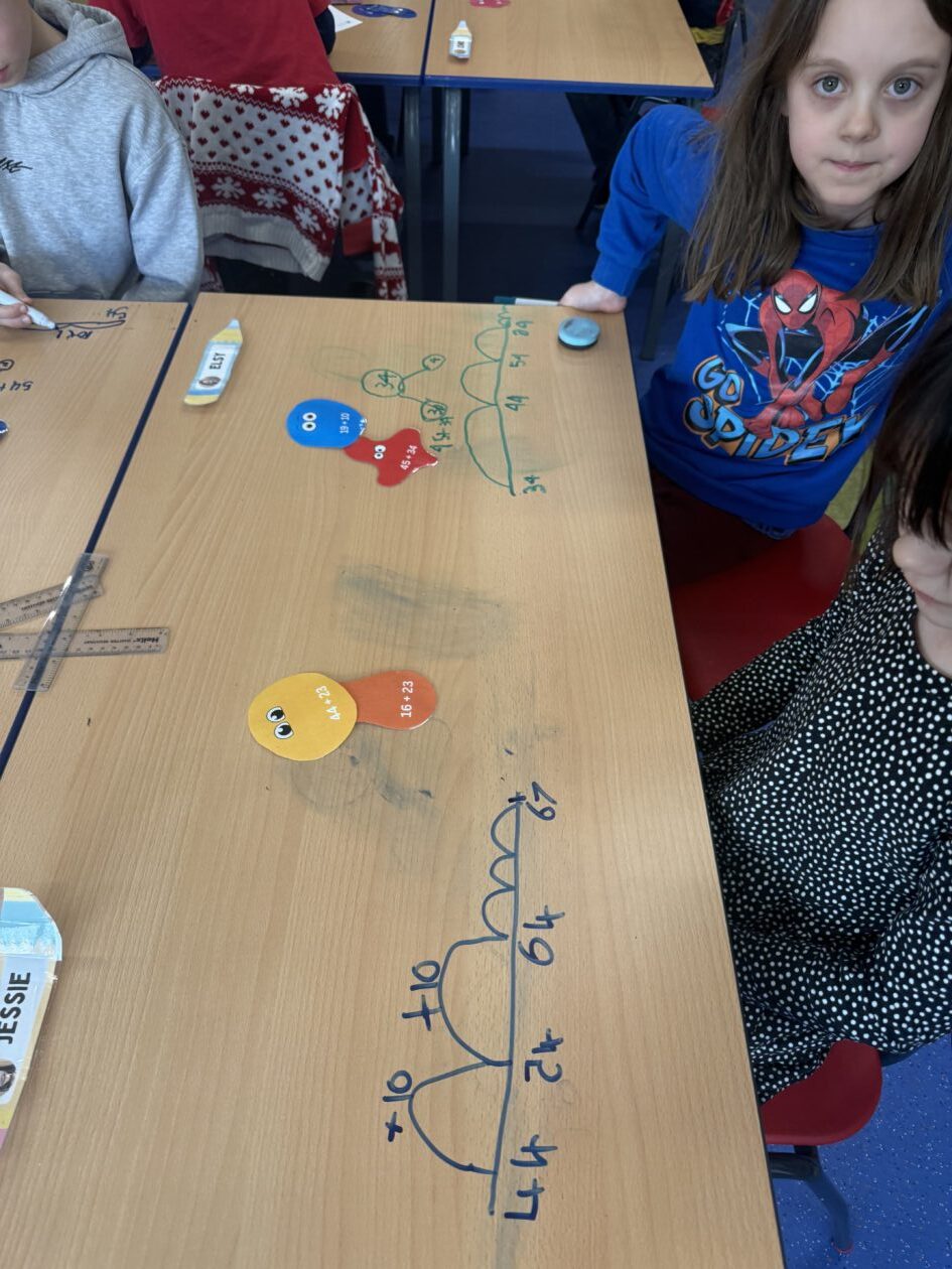 In maths we continued developing our understanding of the jump strategy, this time applying it to subtraction. The children practised moving along number lines and explaining their thinking as they solved problems.