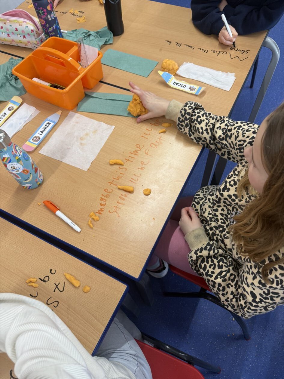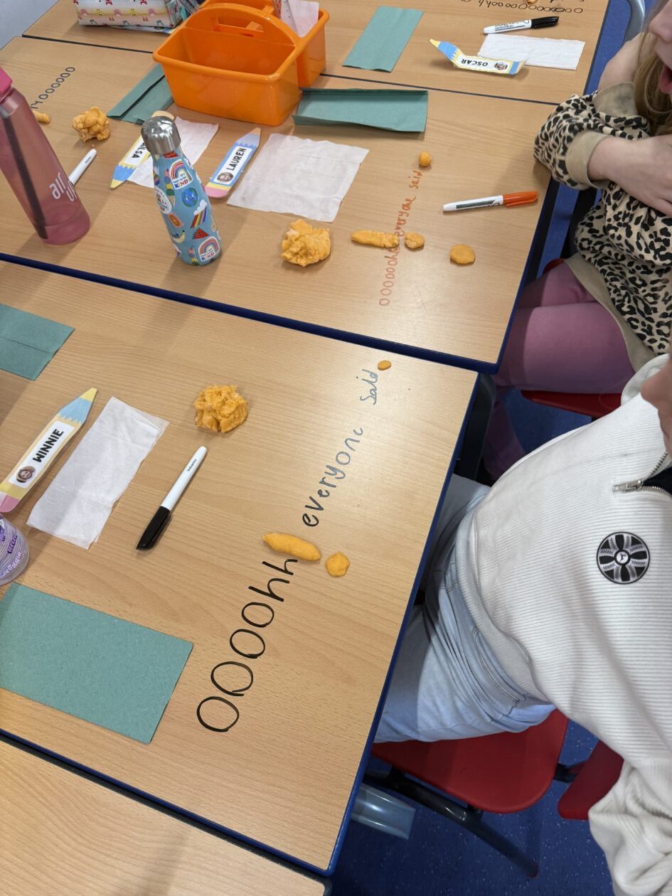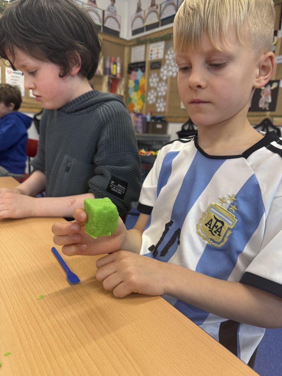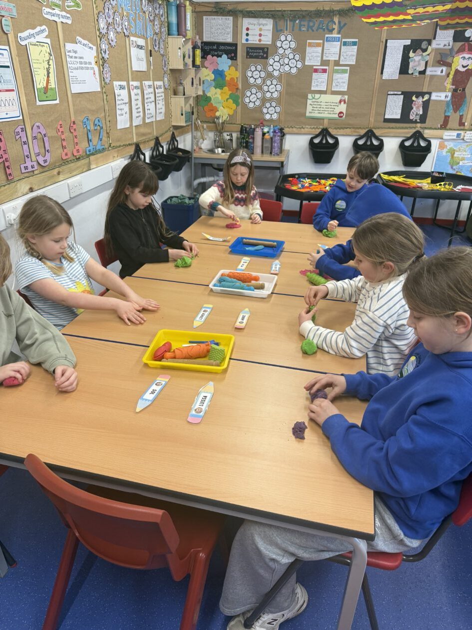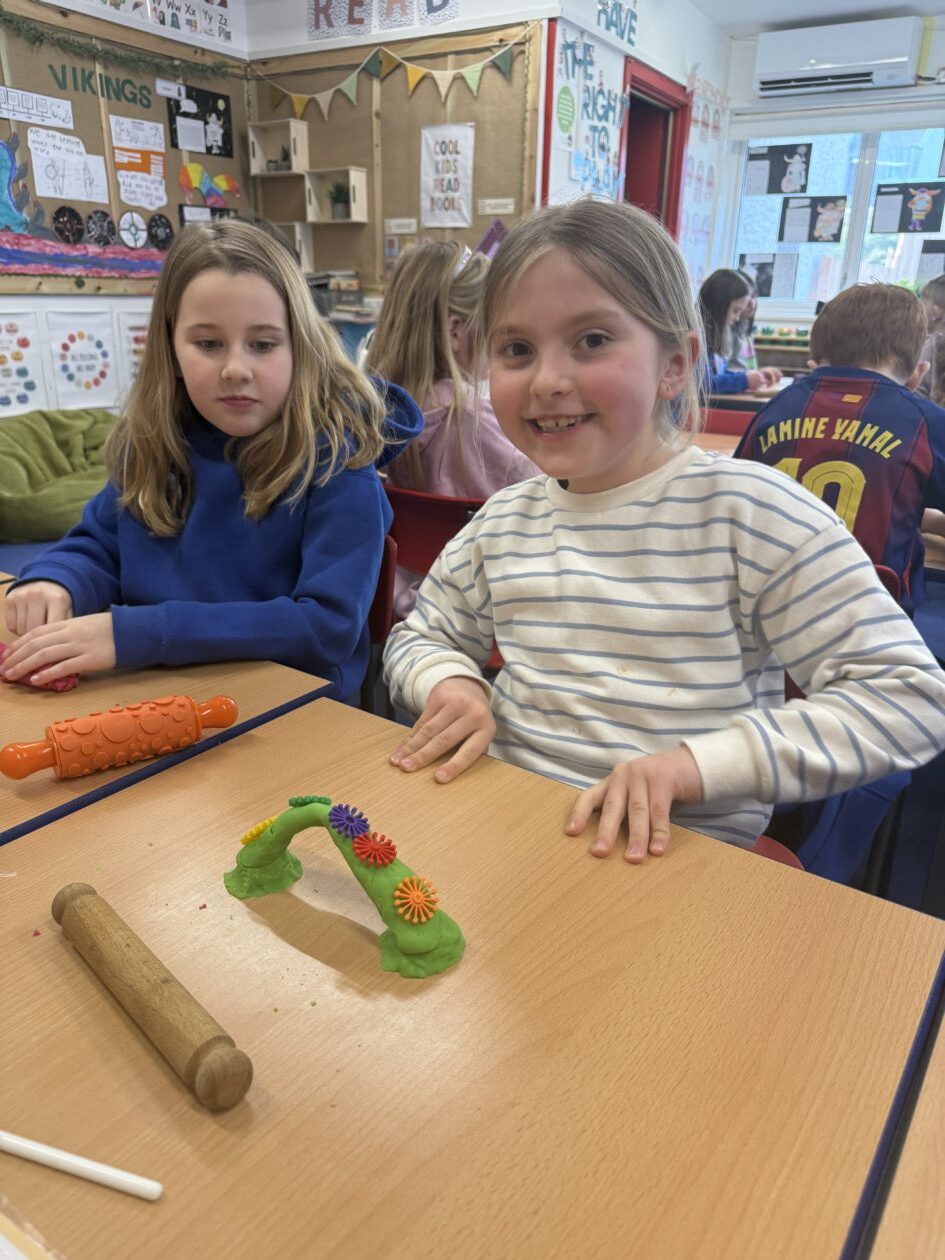 On Friday we used Play-Doh to explore sentence structure and punctuation in a hands-on way. The children created punctuation marks and used them to build sentences while listening to a short story about a Viking who liked icing, which made the activity both creative and memorable.