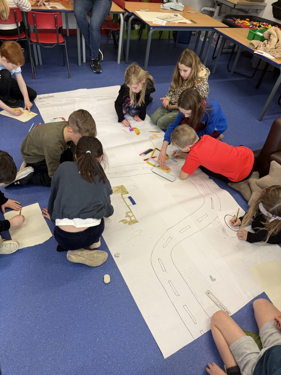 The class worked together to create a large roadmap display for our classroom wall. Each child created: