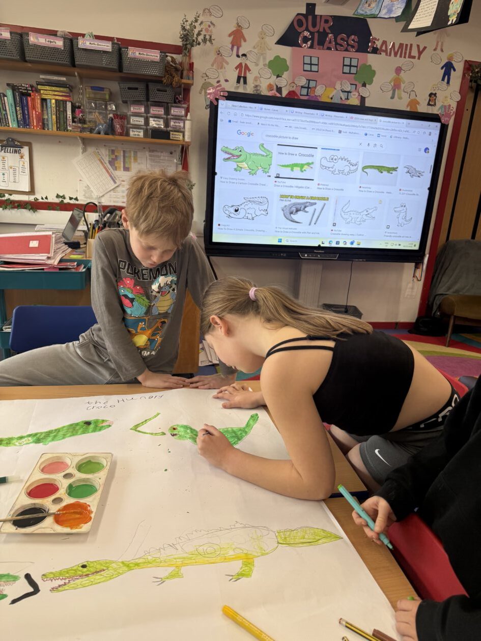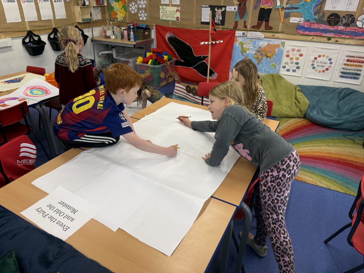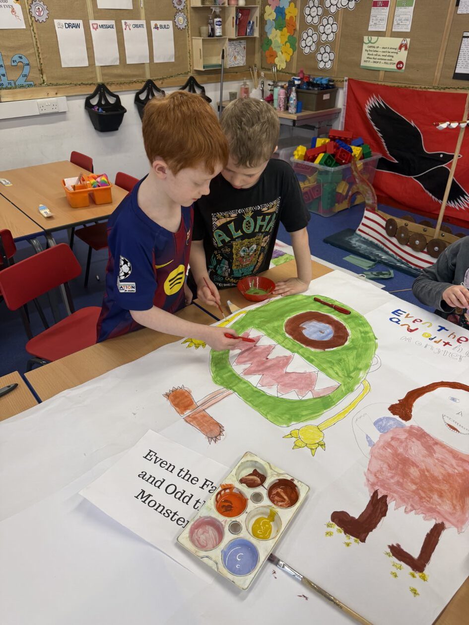 To support our writing, we took part in a fun giant drawing and painting activity, working together to create life-sized giants. This helped us develop our use of adjectives and adverbs and supported our collaboration, communication, and creativity (Meta Skills), which we then used to improve our descriptive writing.