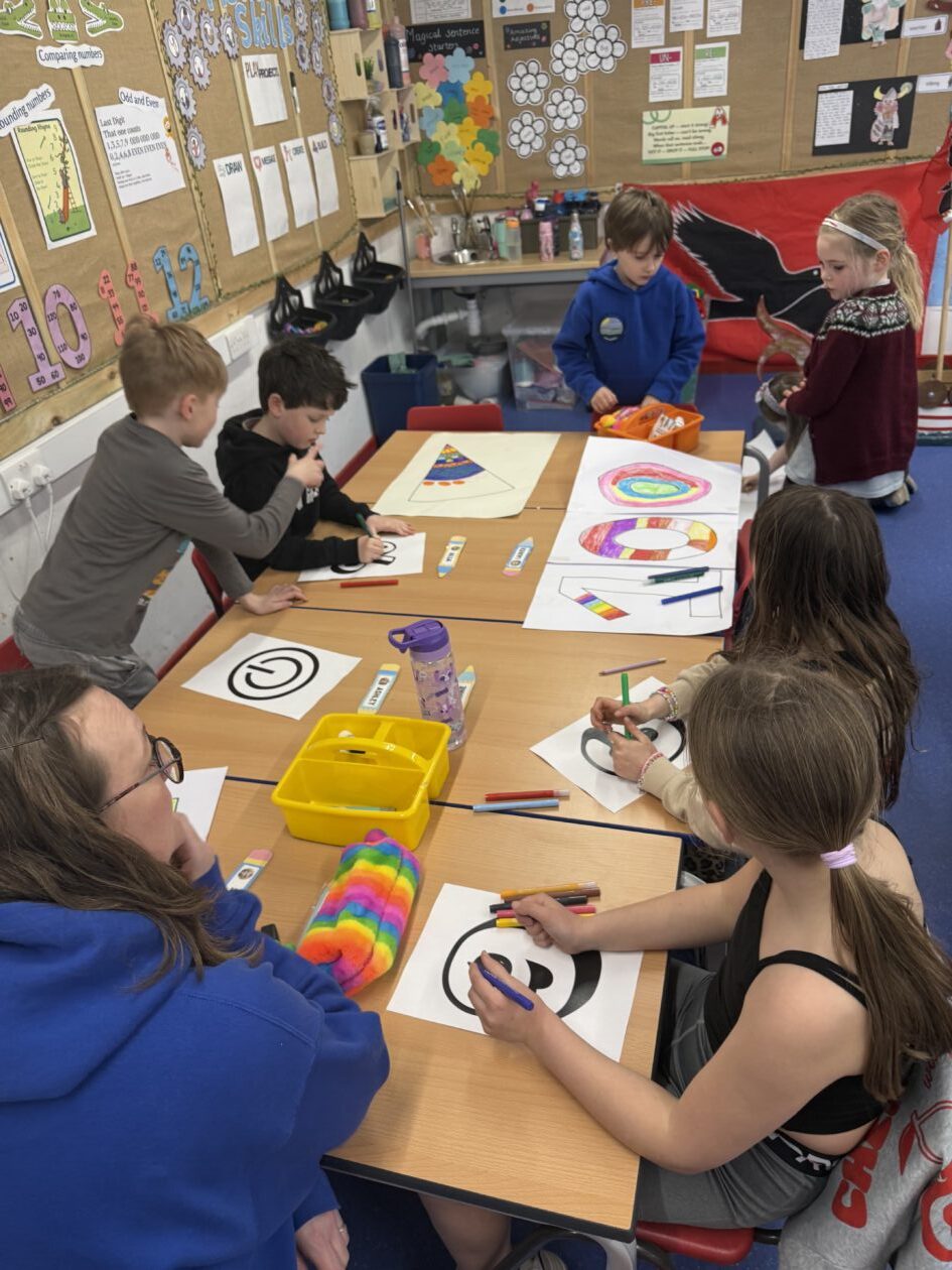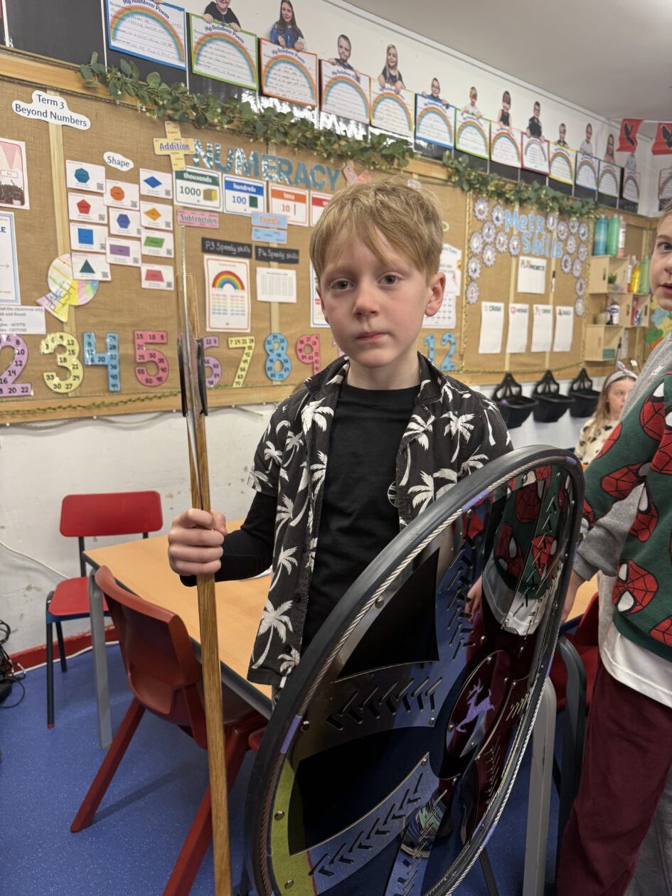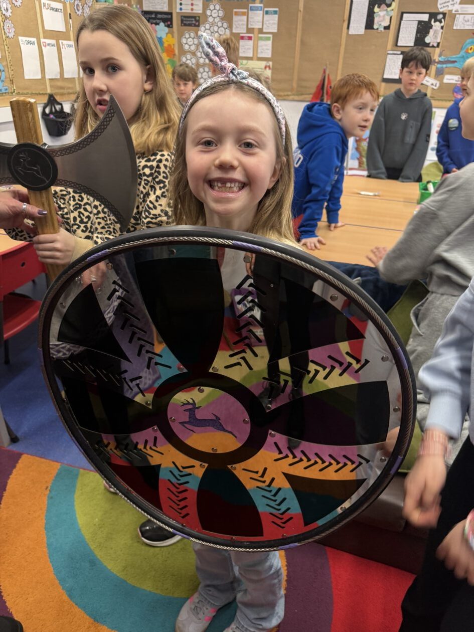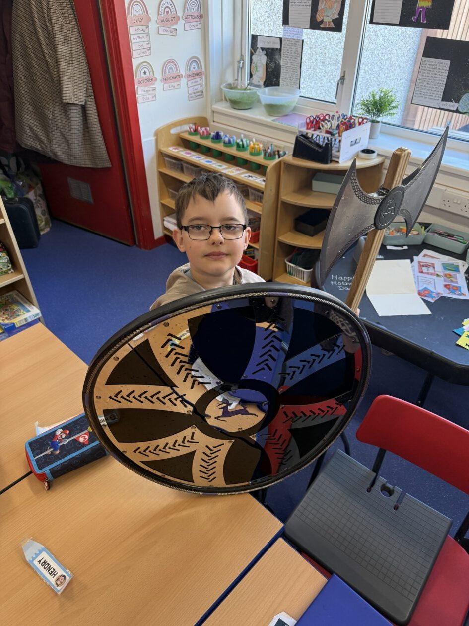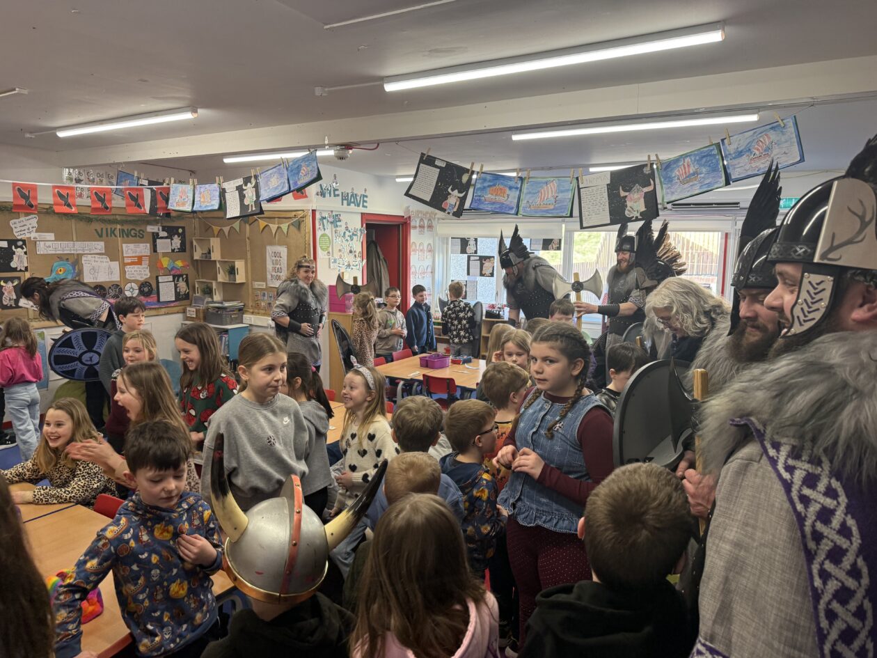 We were very lucky to welcome a visit from Dougie and Neil Grant, who shared his knowledge of sagas and explained how he creates them for Up Helly Aa. This visit gave the children lots of inspiration and ideas for creating their own sagas, which we will be working on next week to accompany our Viking artwork.