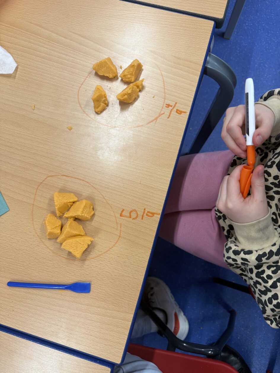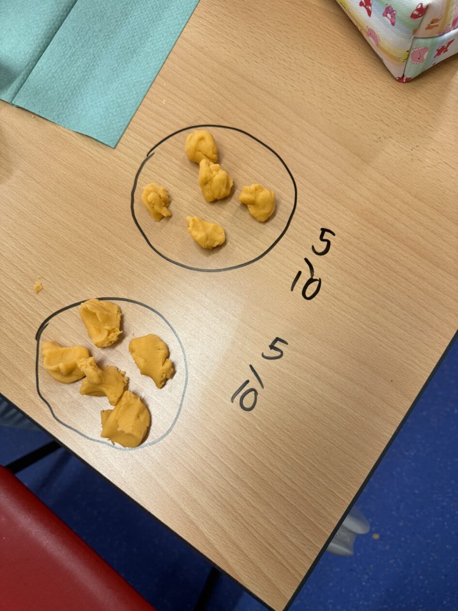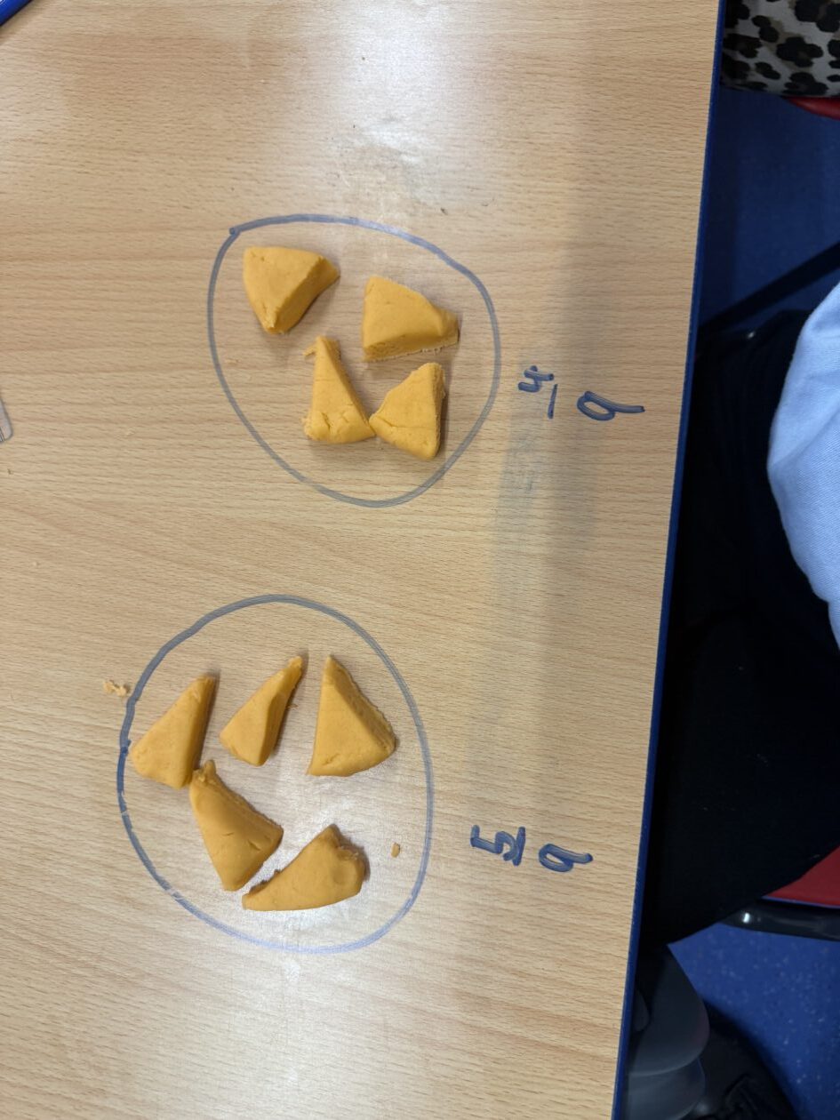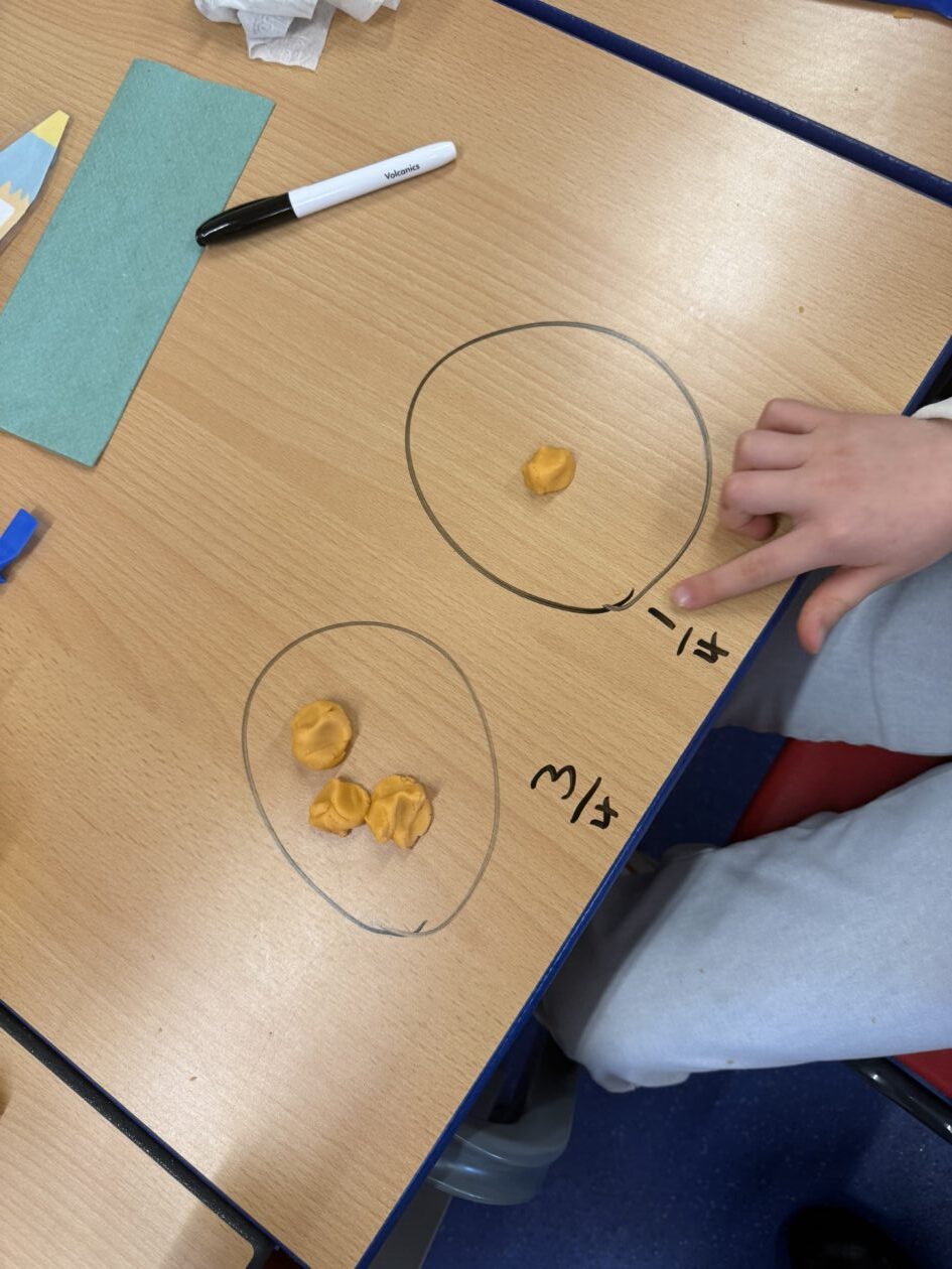 We also continued exploring ordinal numbers and introduced fractions, using Play-Doh to model and divide shapes into equal parts. This practical approach helped the children visualise halves and quarters more clearly.