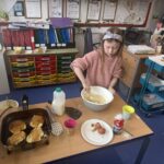 • A pancake role-play station with flour, fake eggs, measuring spoons, scales, aprons, and chef hats